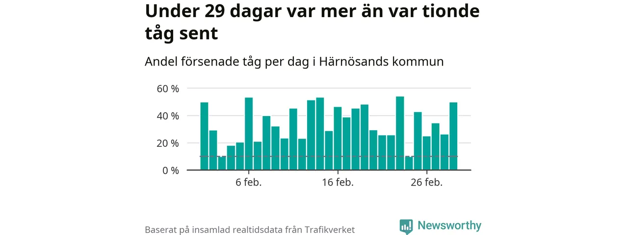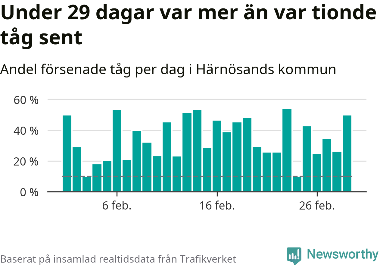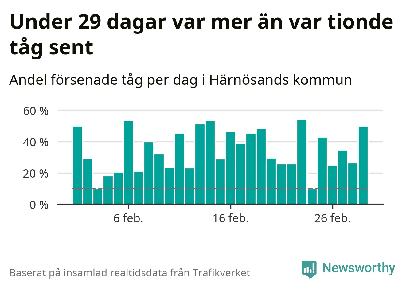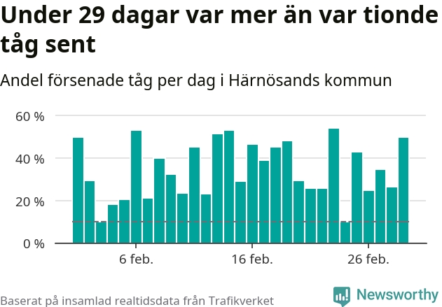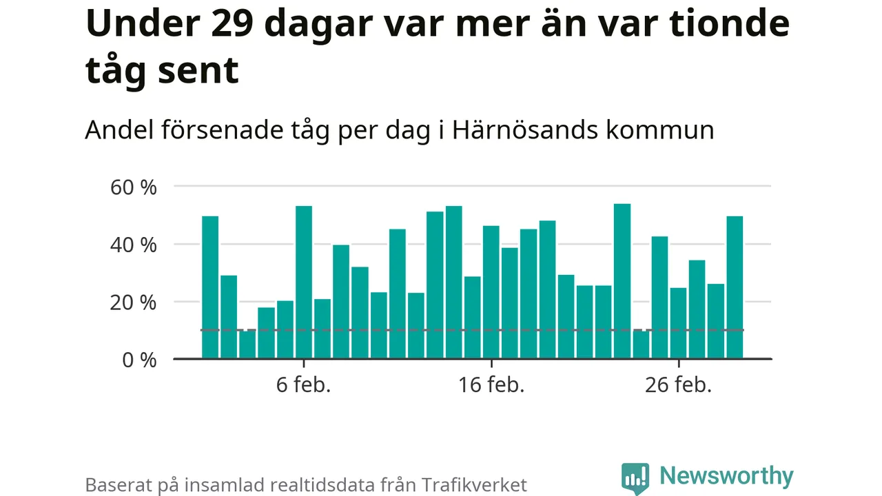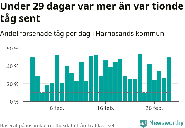 Under alla 29 dagar i februari var mer än var tionde tåg vid Härnösand C försenat. Det visar Newsworthys sammanställning av alla tågförseningar förra månaden.