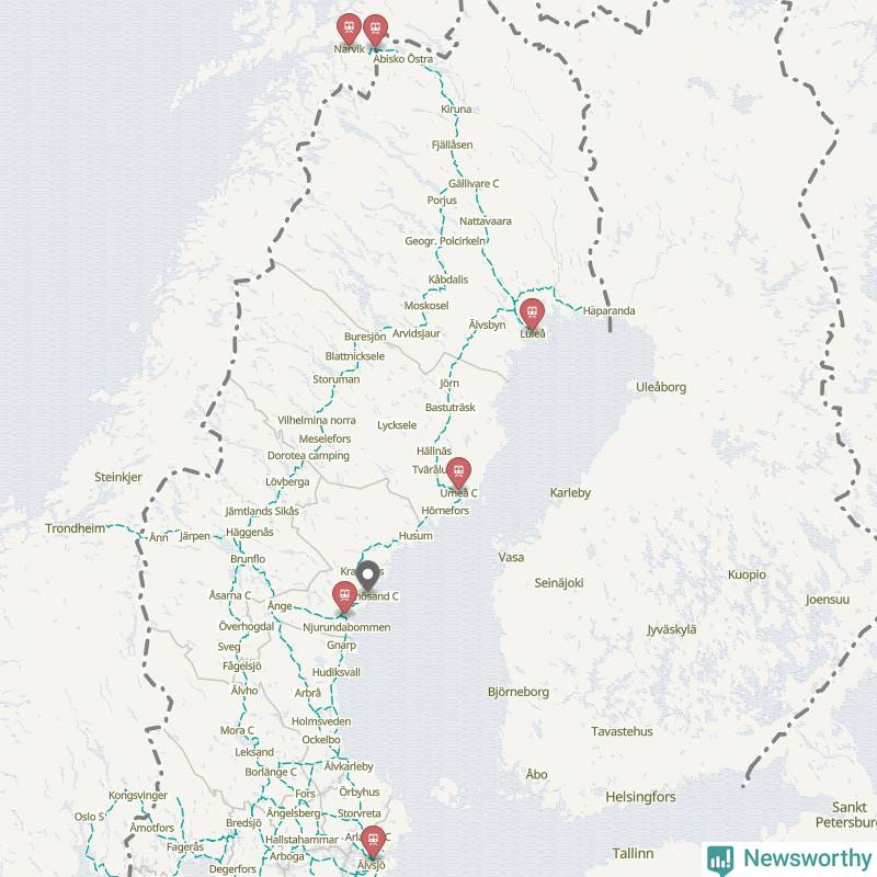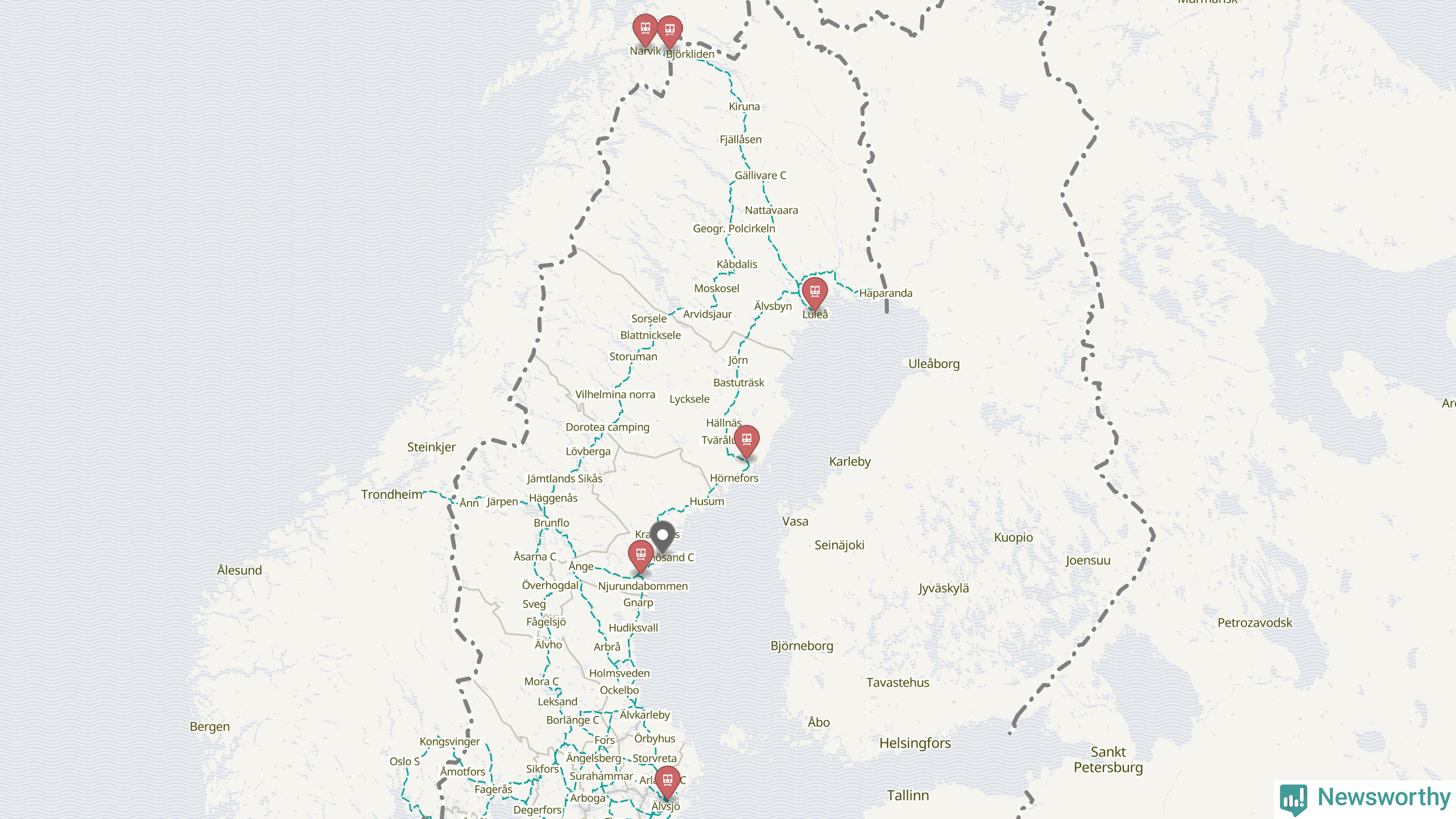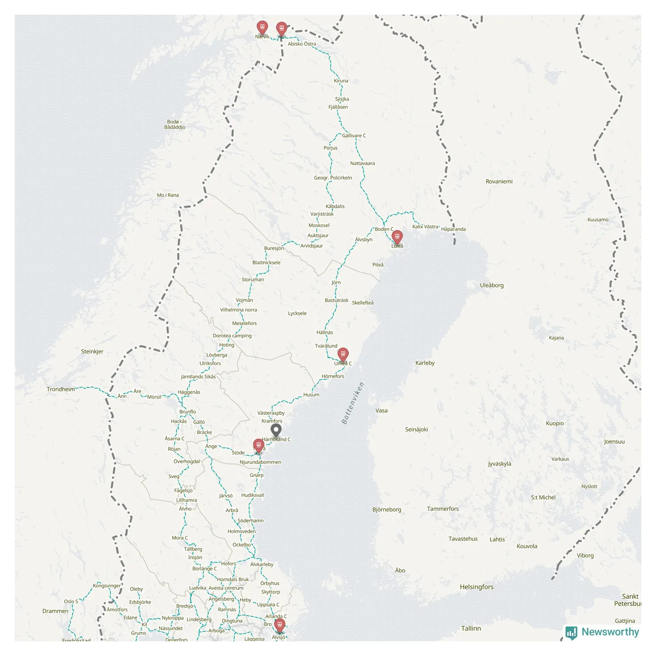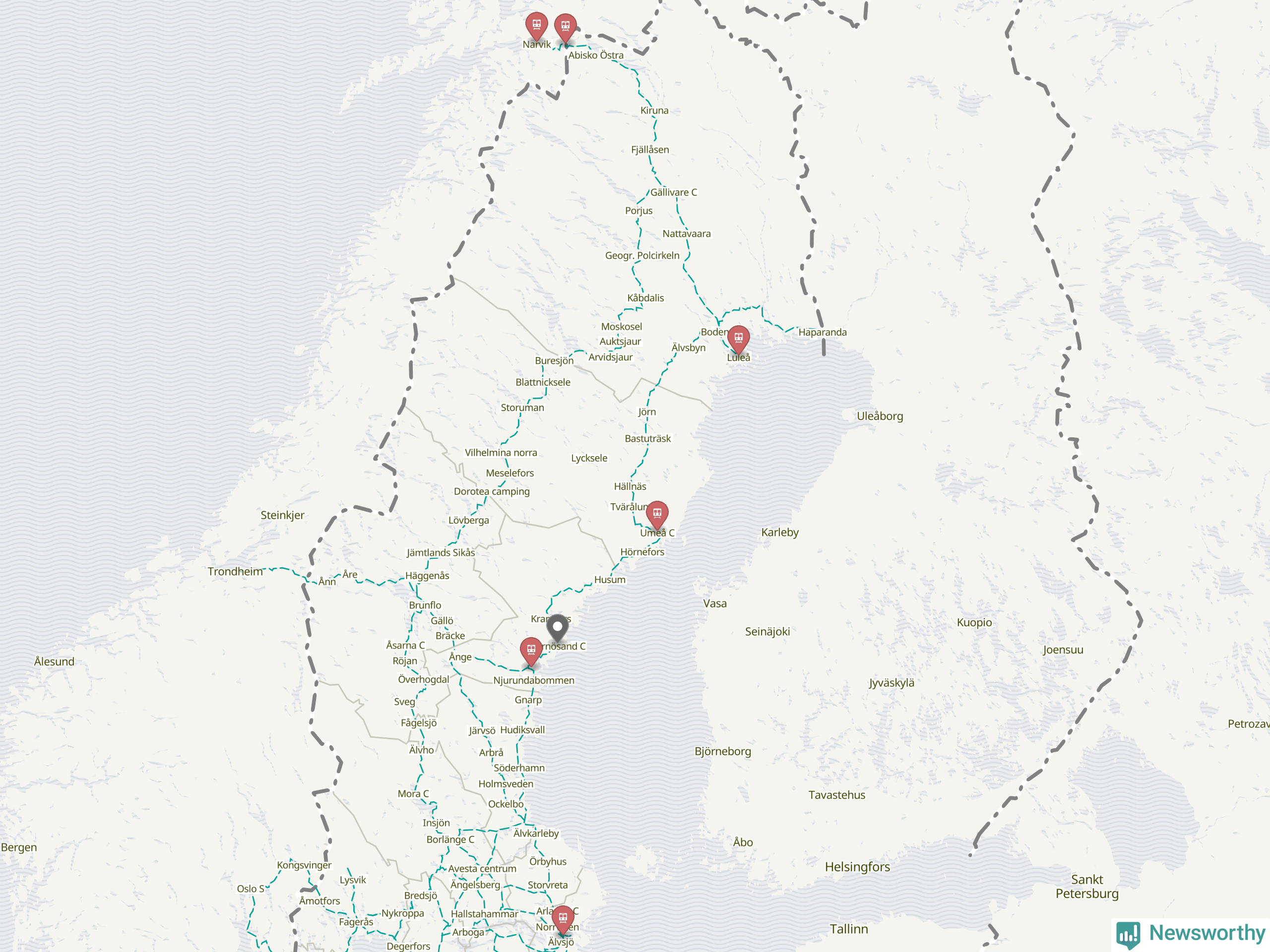 Kartdata från Mapbox, Newsworthy, OpenStreetMap och Trafikverket. Uppgifter om sträckor med passagerartrafik från jarnvag.net.