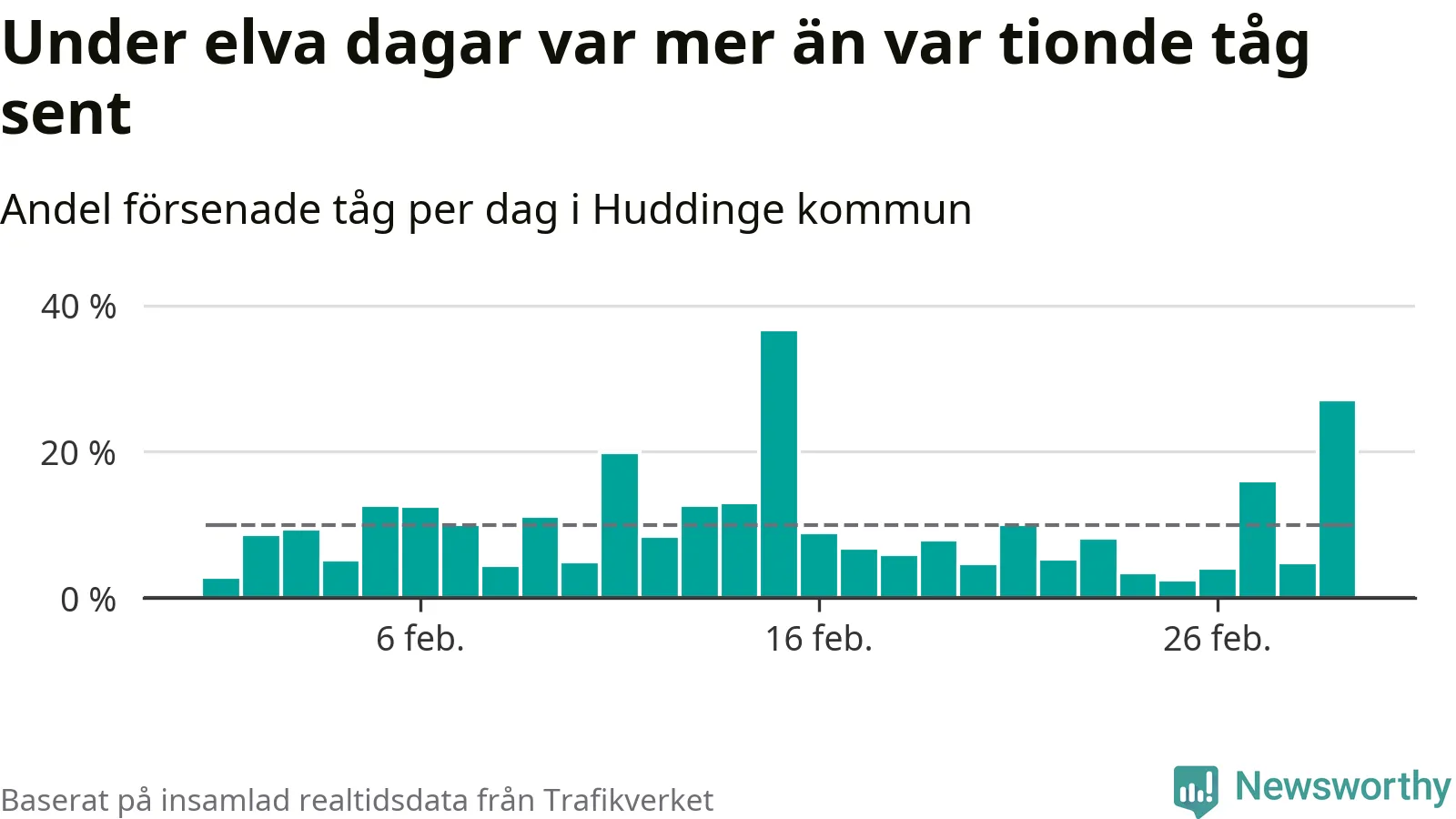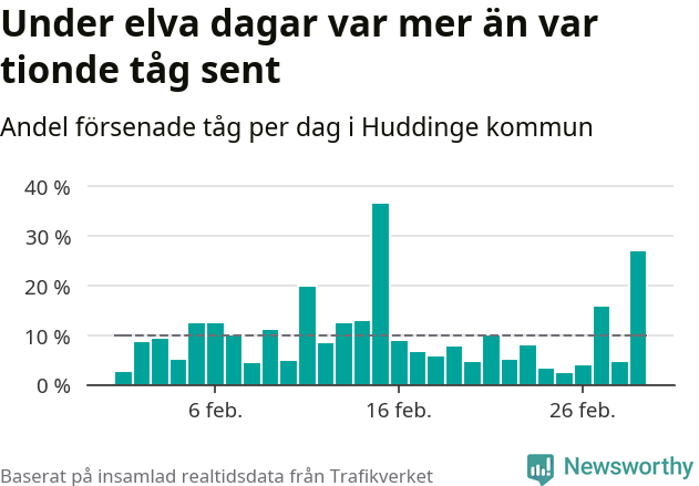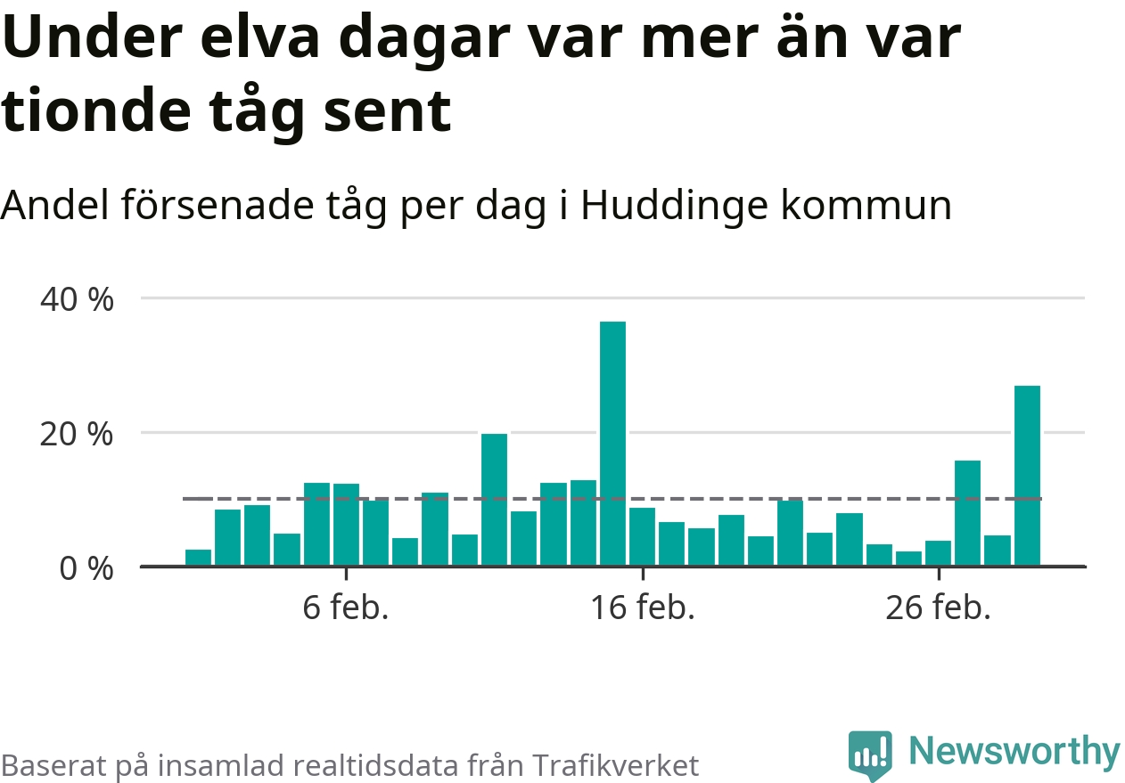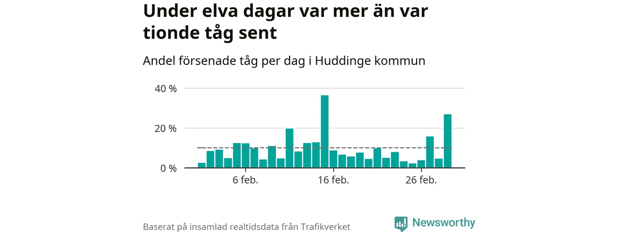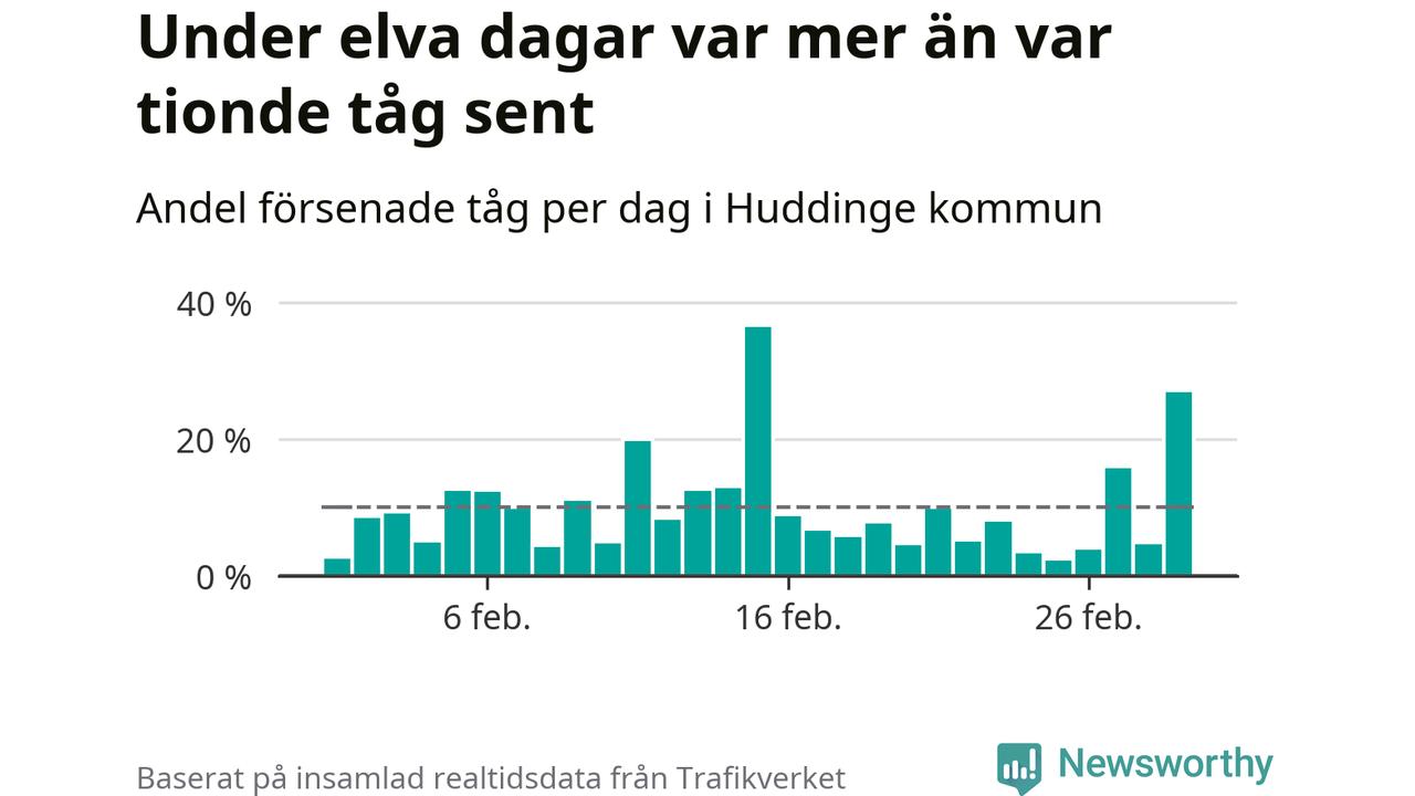 Under elva av 29 dagar i februari var mer än var tionde tåg i Huddinge kommun försenat. Det visar Newsworthys sammanställning av alla tågförseningar förra månaden.