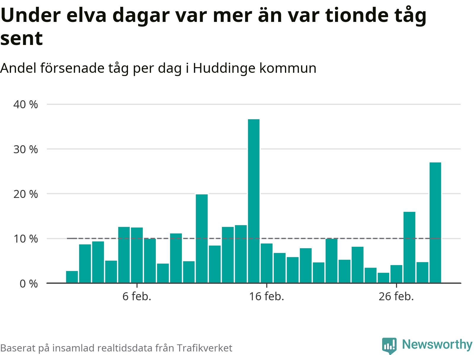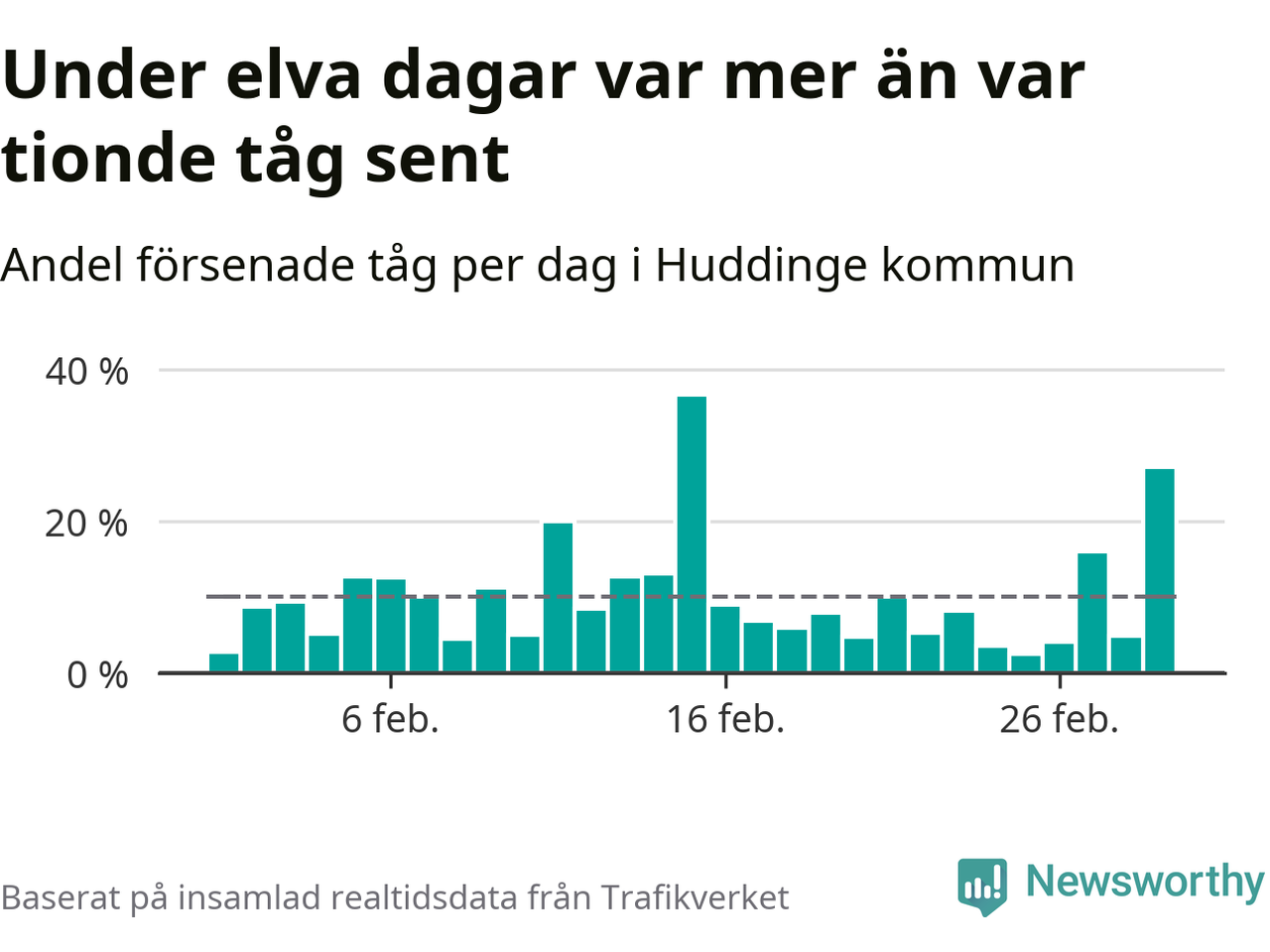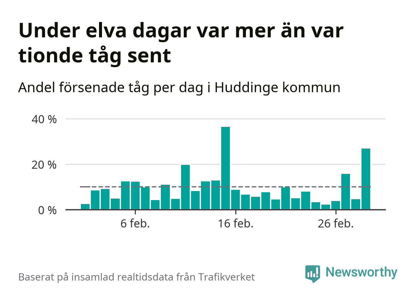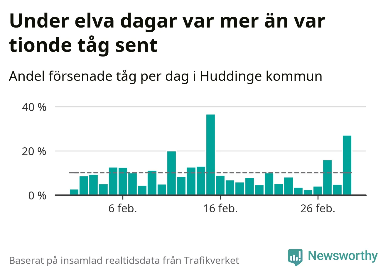 Under elva av 29 dagar i februari var mer än var tionde tåg i Huddinge kommun försenat. Det visar Newsworthys sammanställning av alla tågförseningar förra månaden.