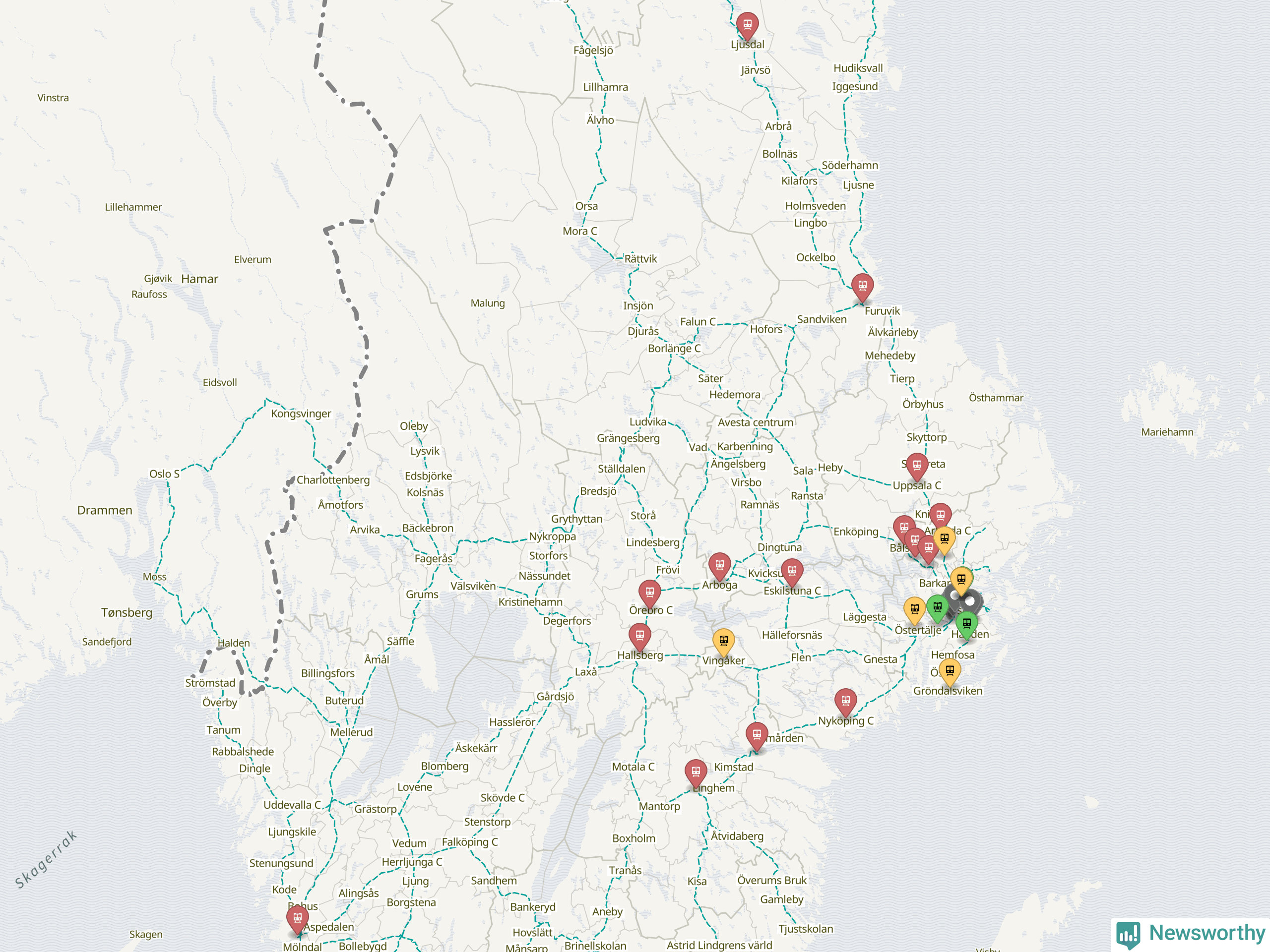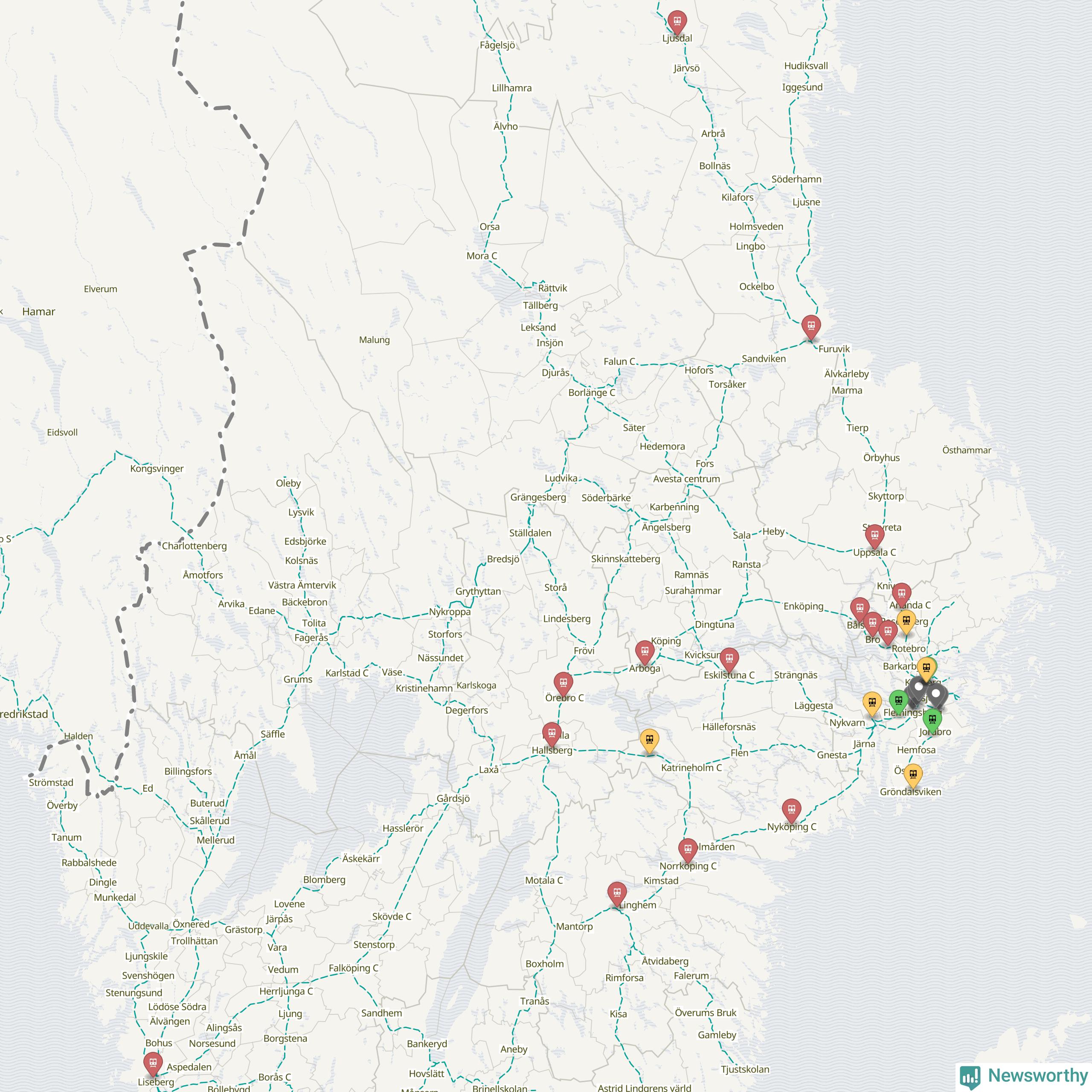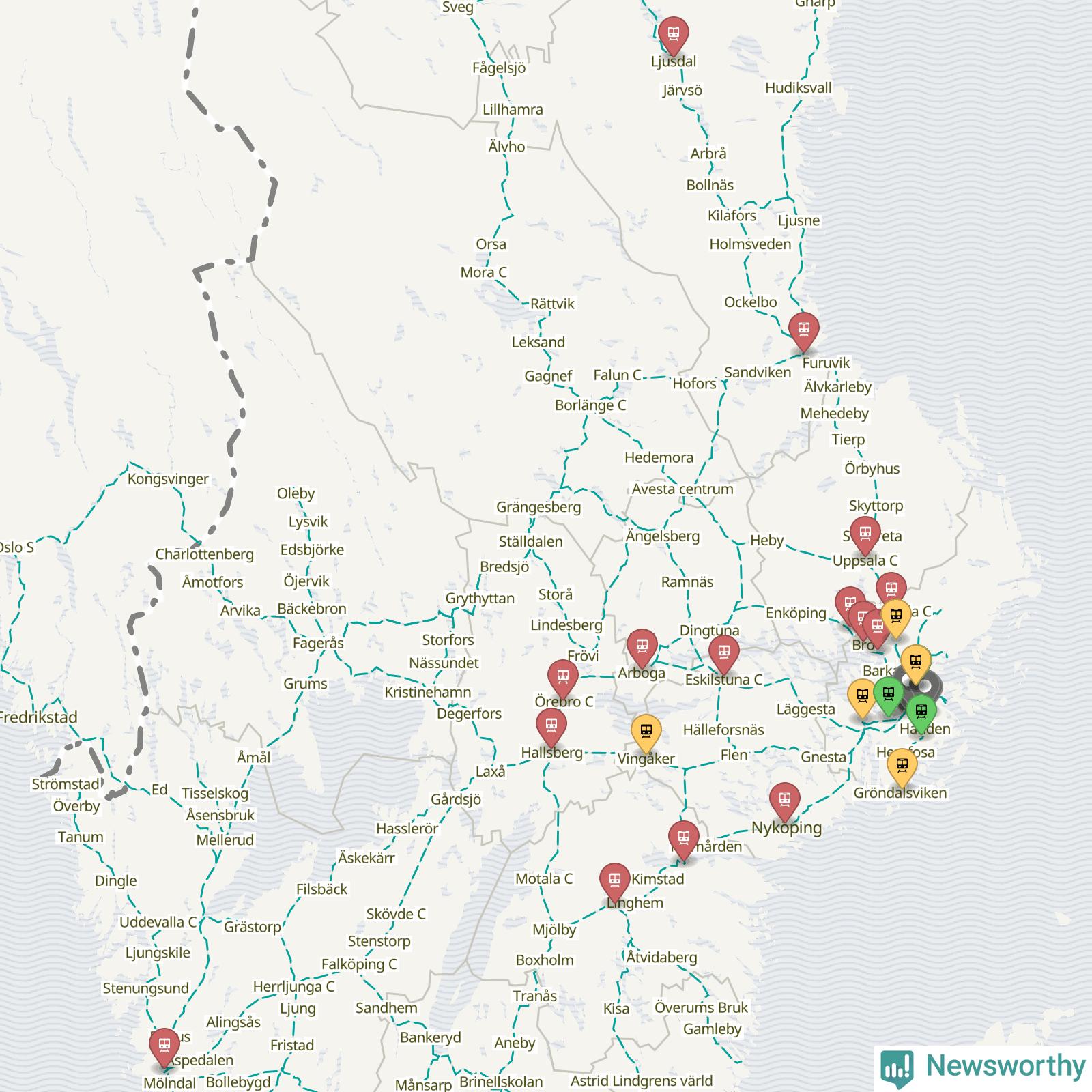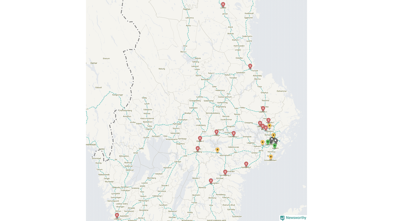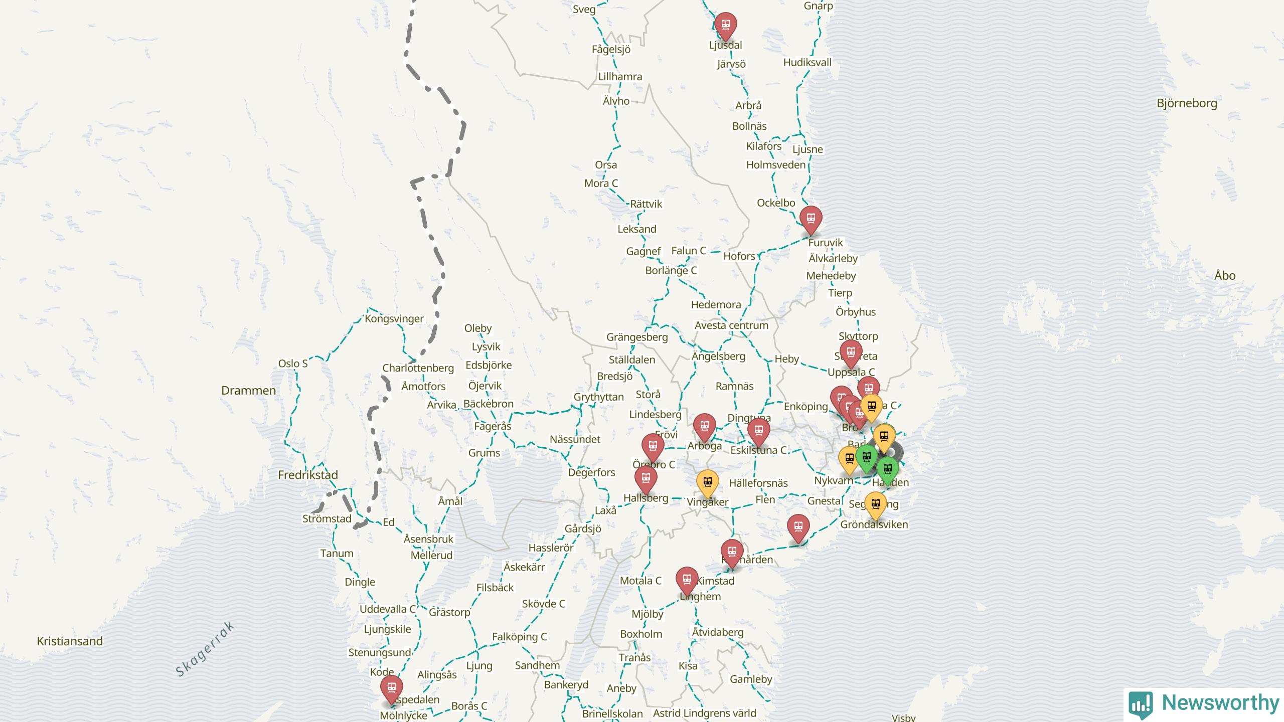 Kartdata från Mapbox, Newsworthy, OpenStreetMap och Trafikverket. Uppgifter om sträckor med passagerartrafik från jarnvag.net.
