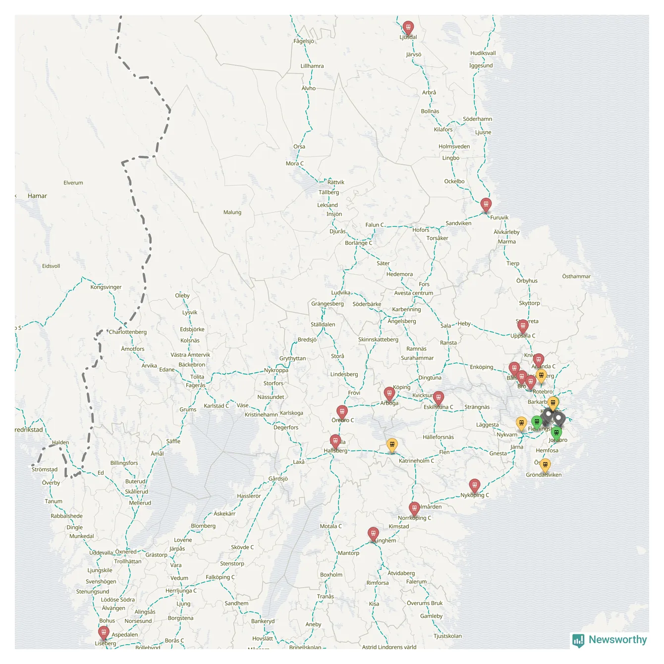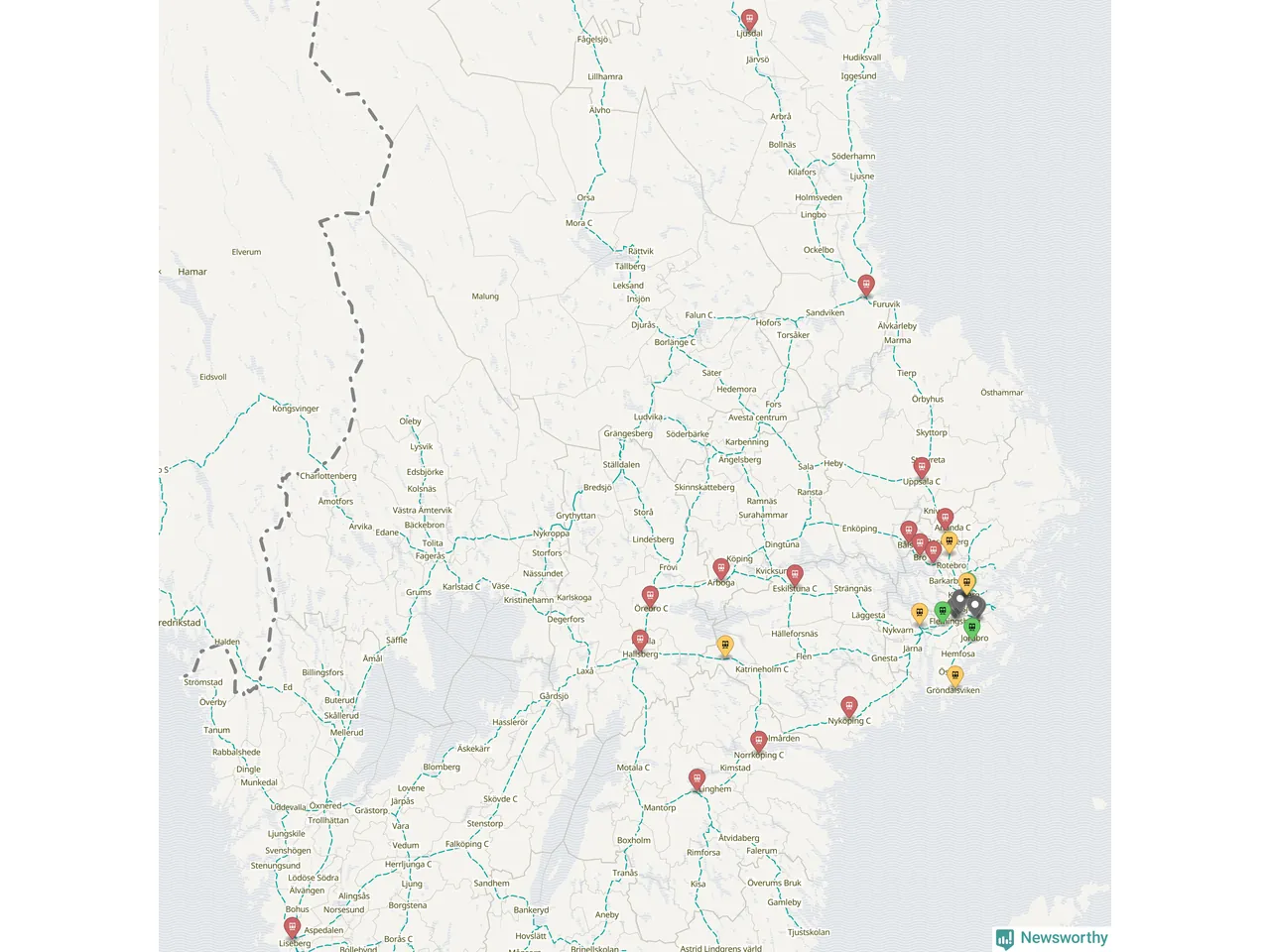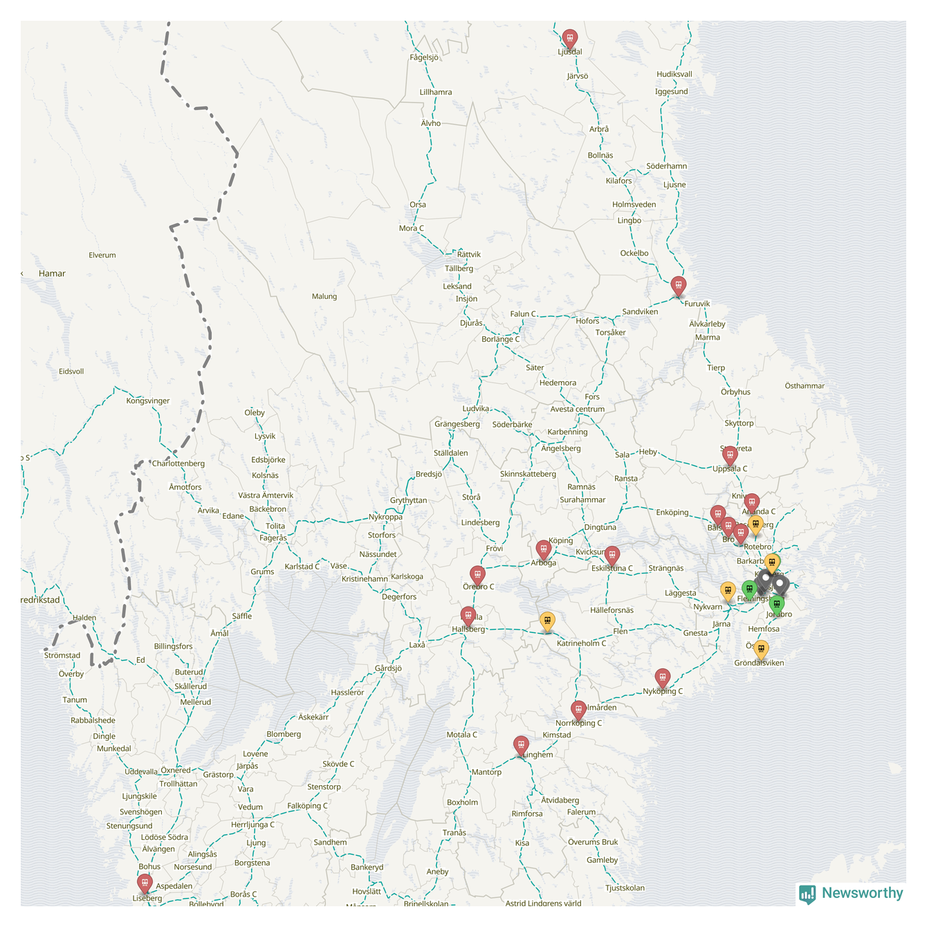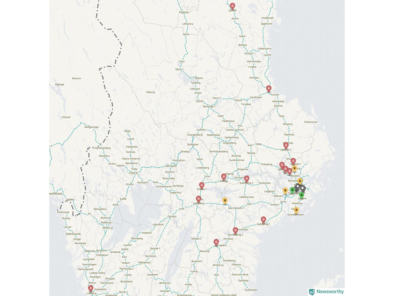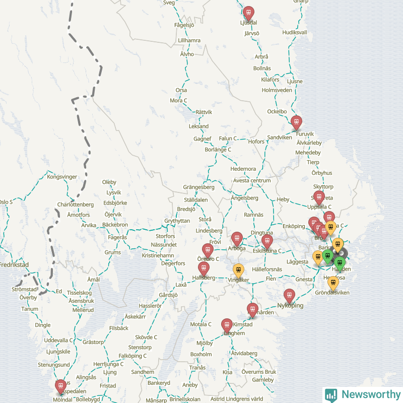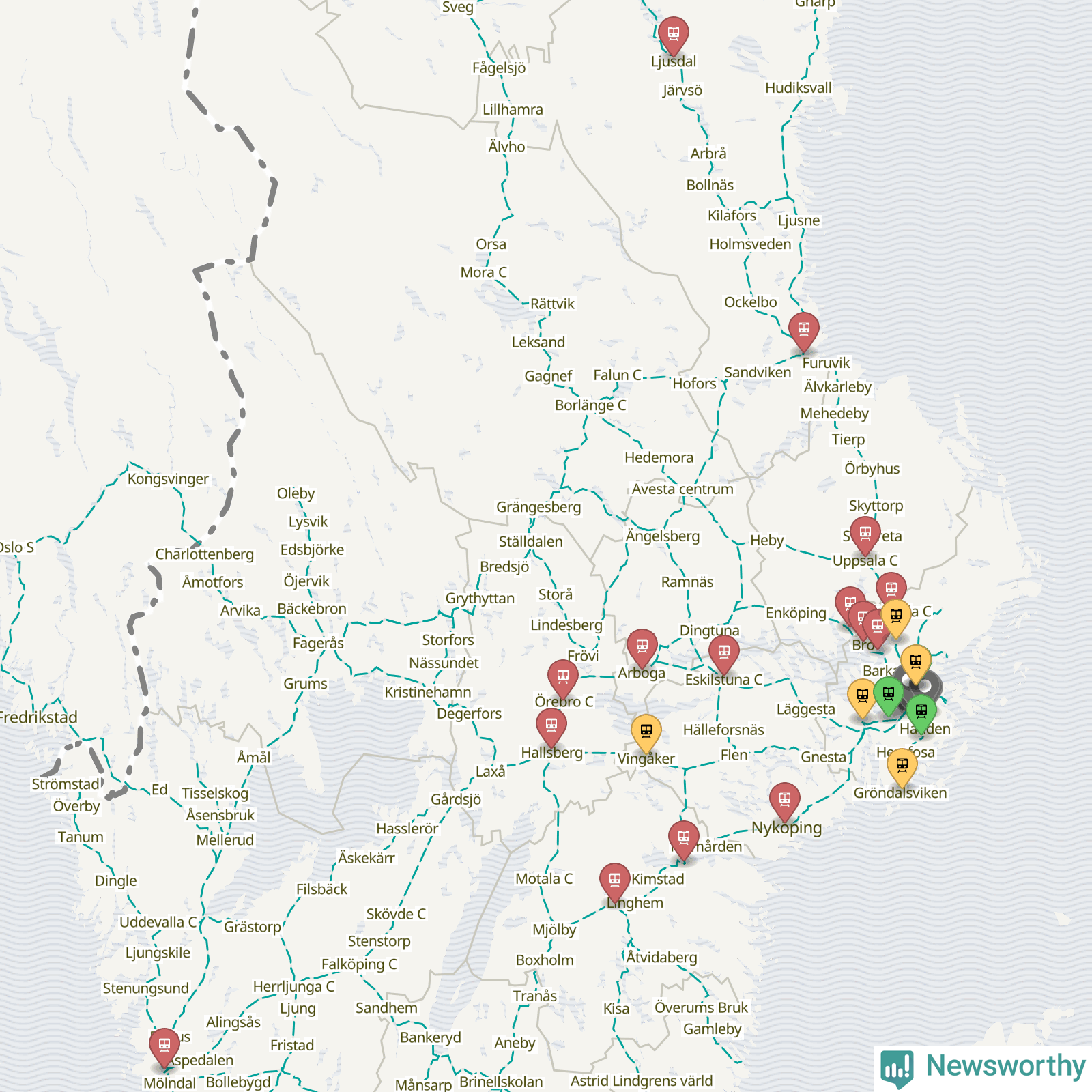 Kartdata från Mapbox, Newsworthy, OpenStreetMap och Trafikverket. Uppgifter om sträckor med passagerartrafik från jarnvag.net.