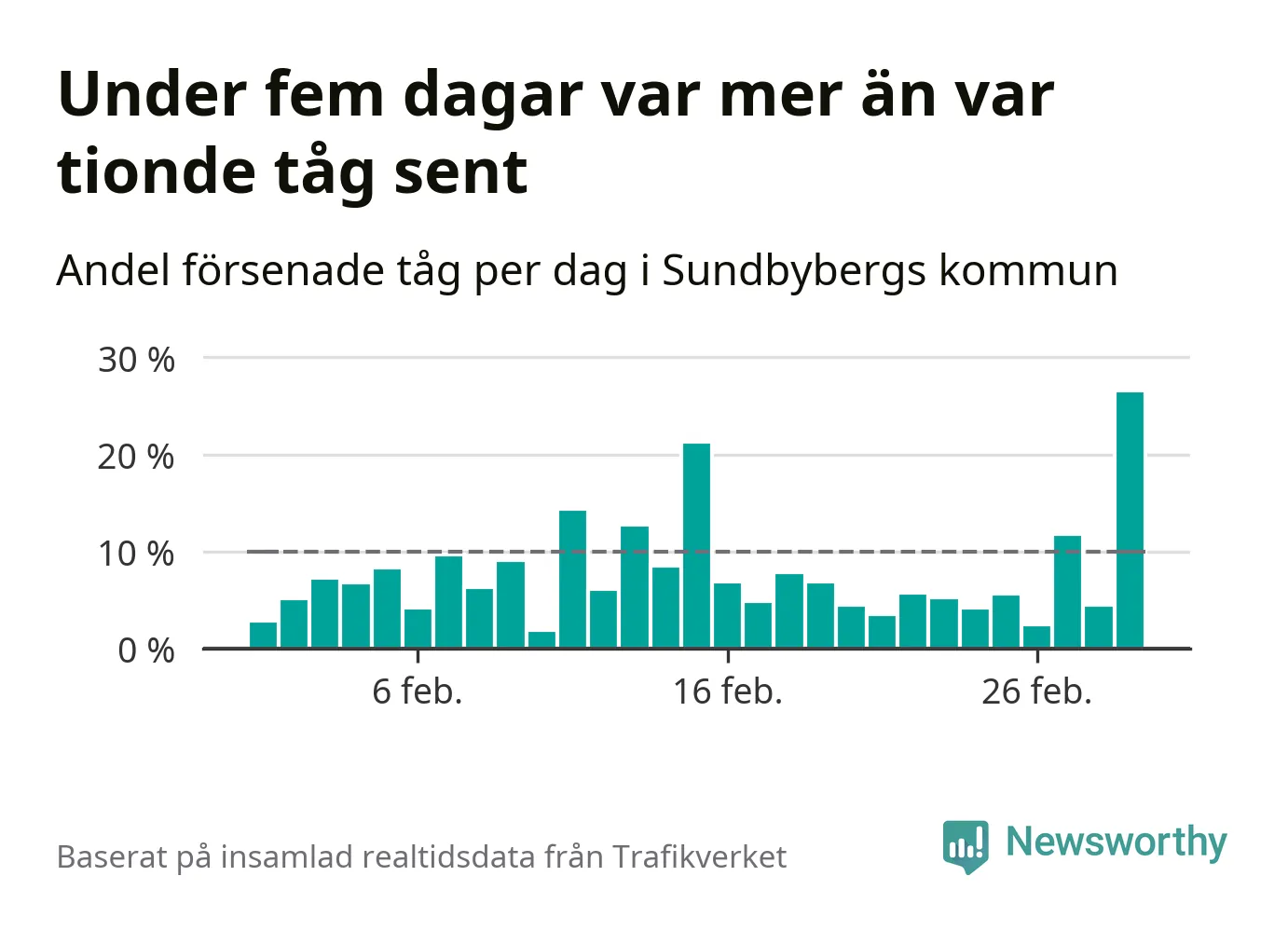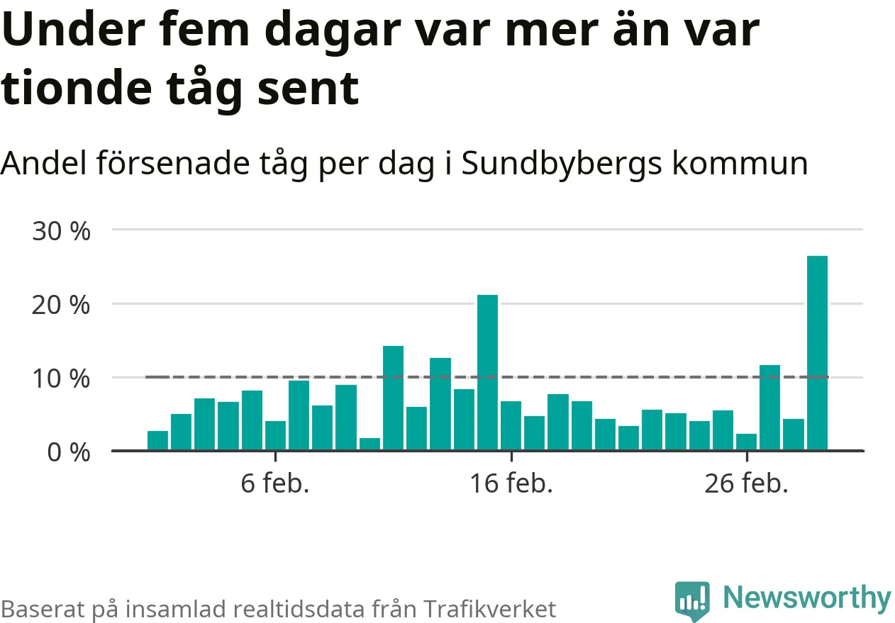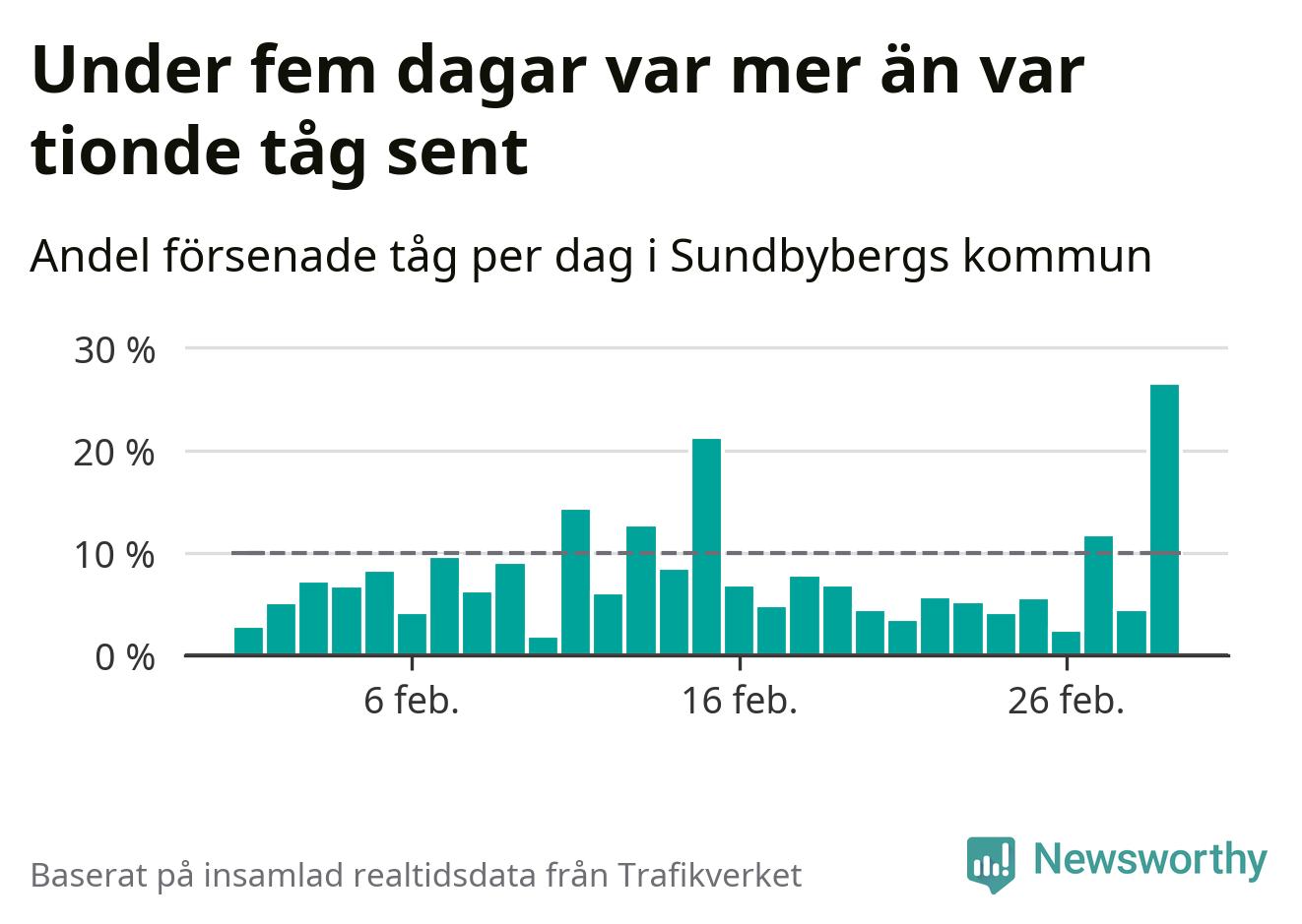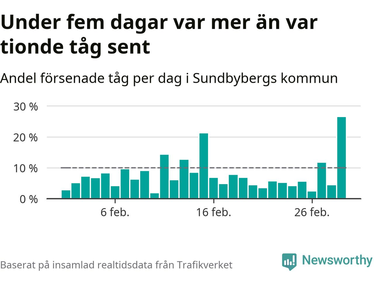 Vintern har kantats av stora tågförseningar. Newsworthy har samlat in ankomsttider under hela februari, för att se hur stor andel av tågen till Sundbybergs kommun som var i tid under månaden.