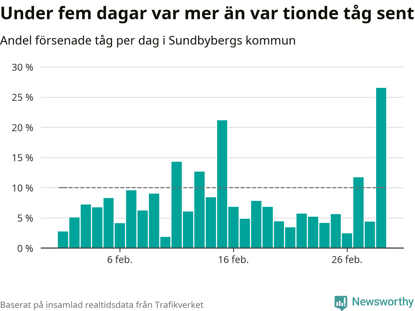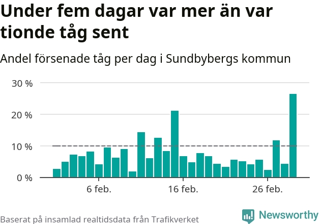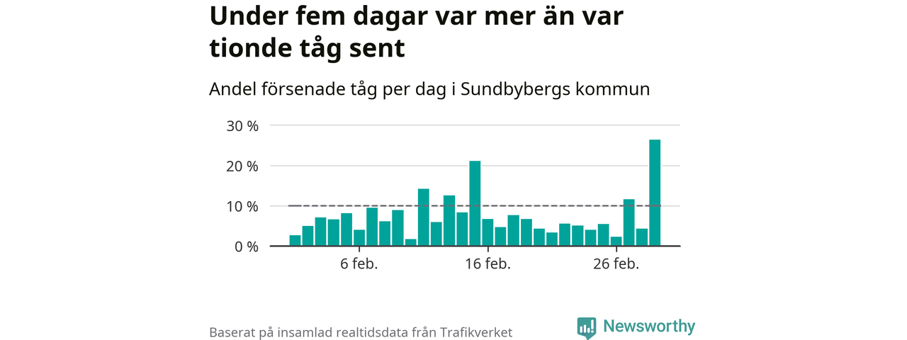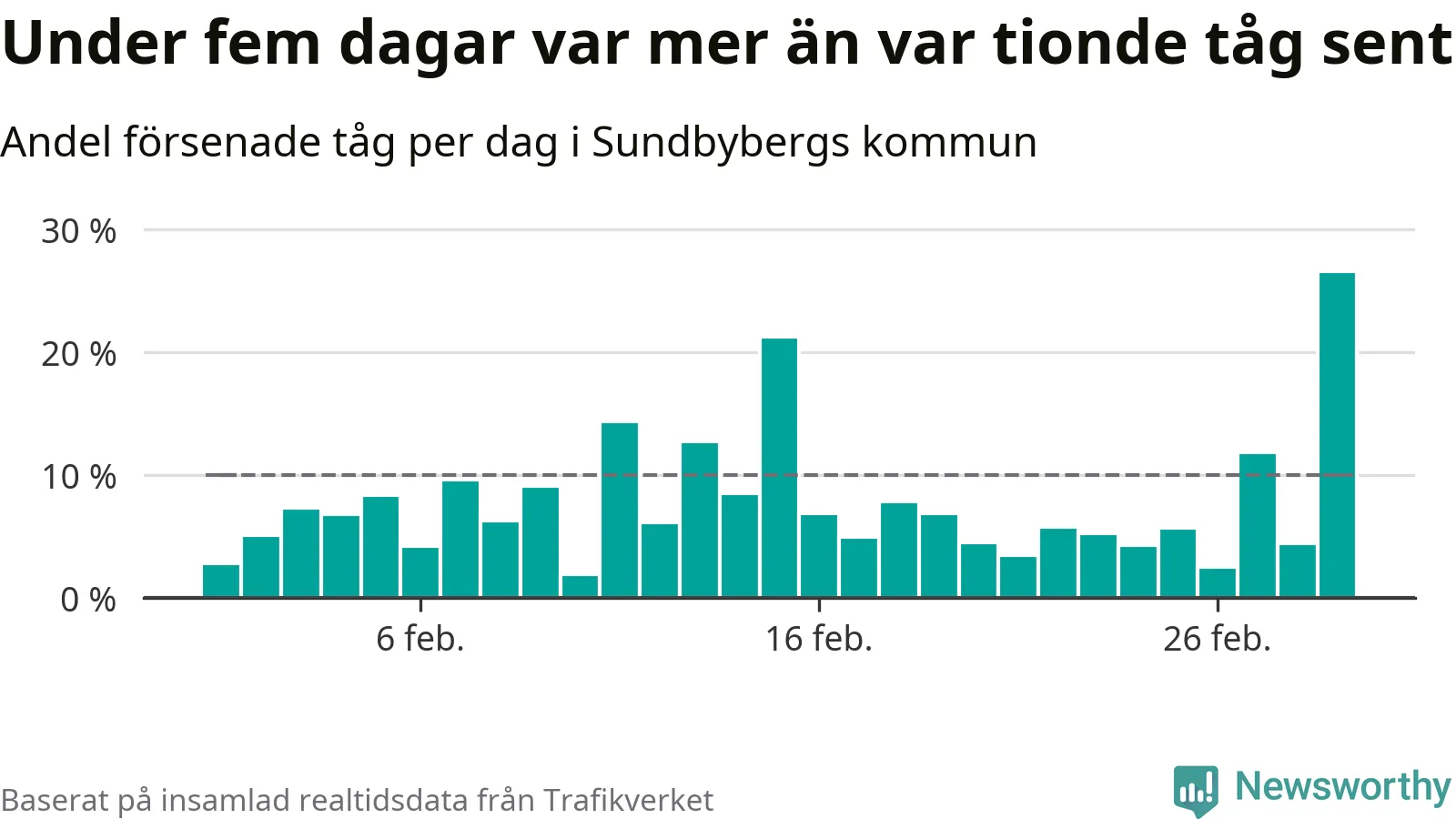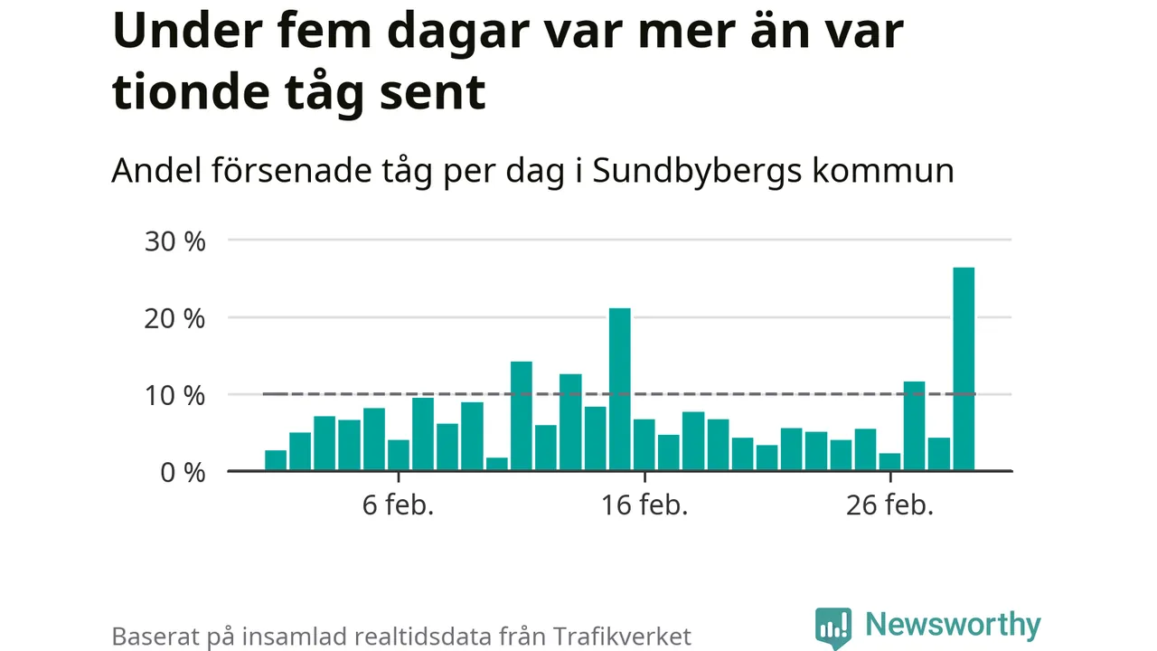 Vintern har kantats av stora tågförseningar. Newsworthy har samlat in ankomsttider under hela februari, för att se hur stor andel av tågen till Sundbybergs kommun som var i tid under månaden.