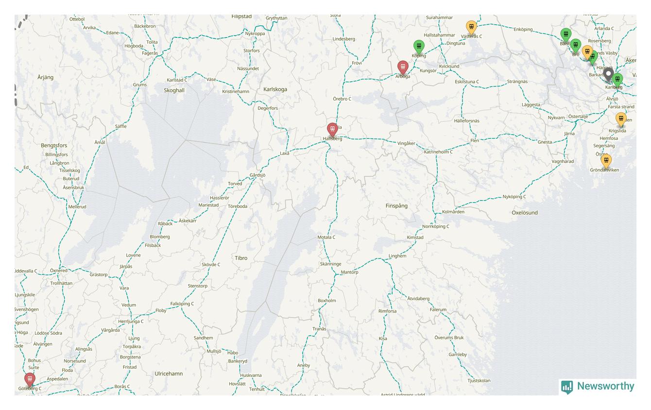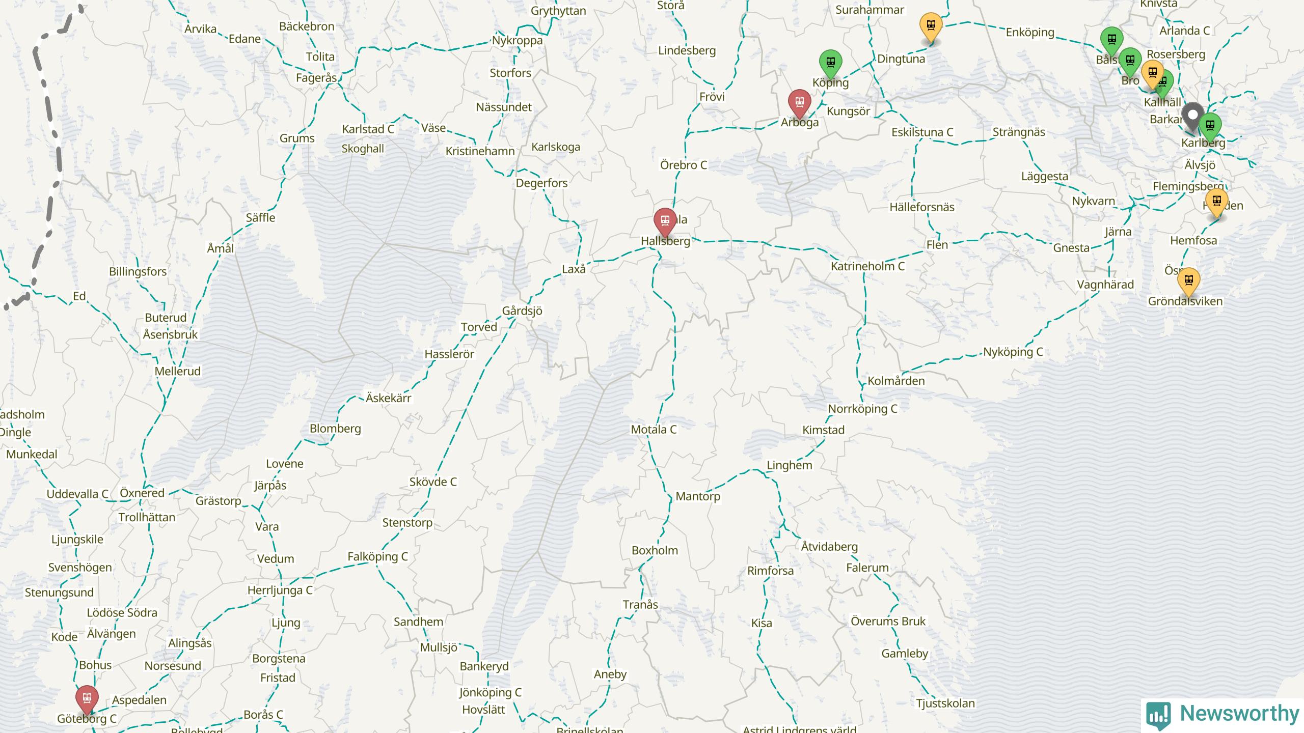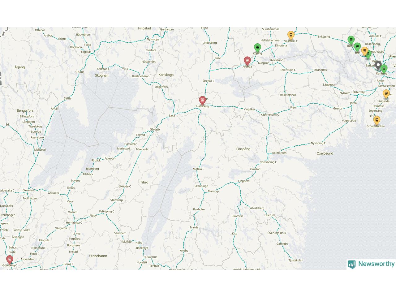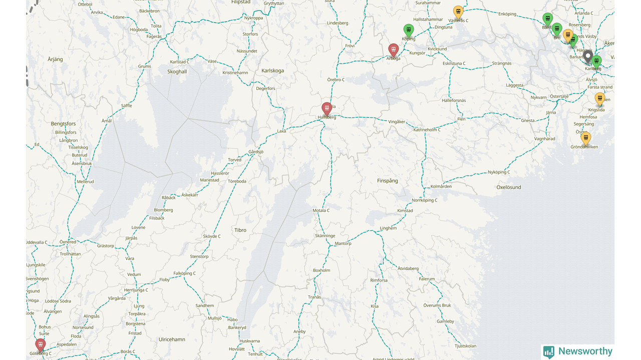 Kartdata från Mapbox, Newsworthy, OpenStreetMap och Trafikverket. Uppgifter om sträckor med passagerartrafik från jarnvag.net.