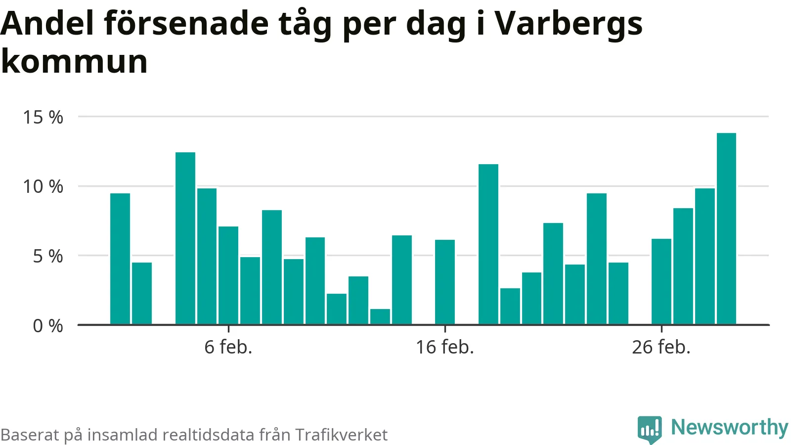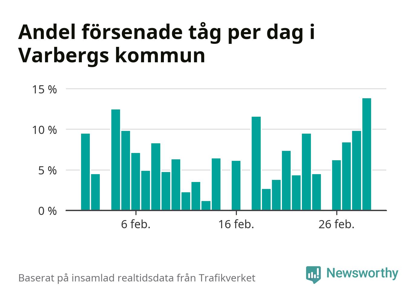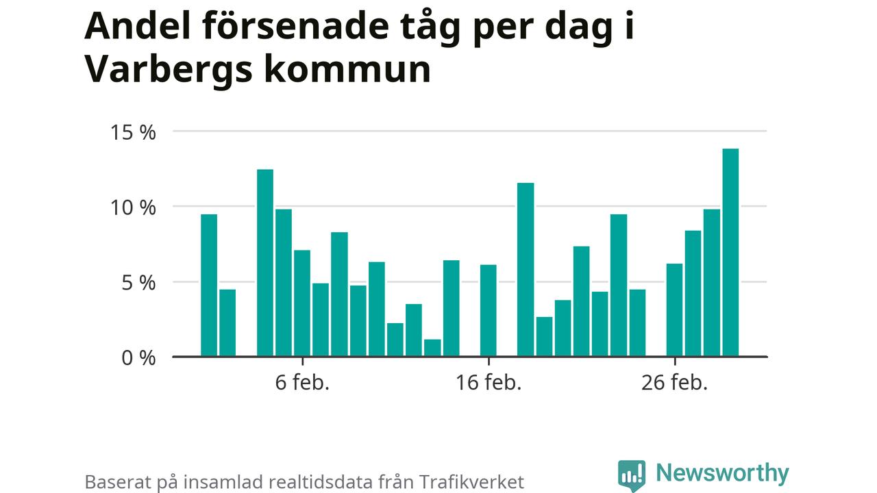 Totalt var sex procent av de ankommande tågen i Varbergs kommun mer än fem minuter försenade under februari, och två procent var så mycket som en kvart försenade, bland de tåg som angjorde någon av stationerna i kommunen.