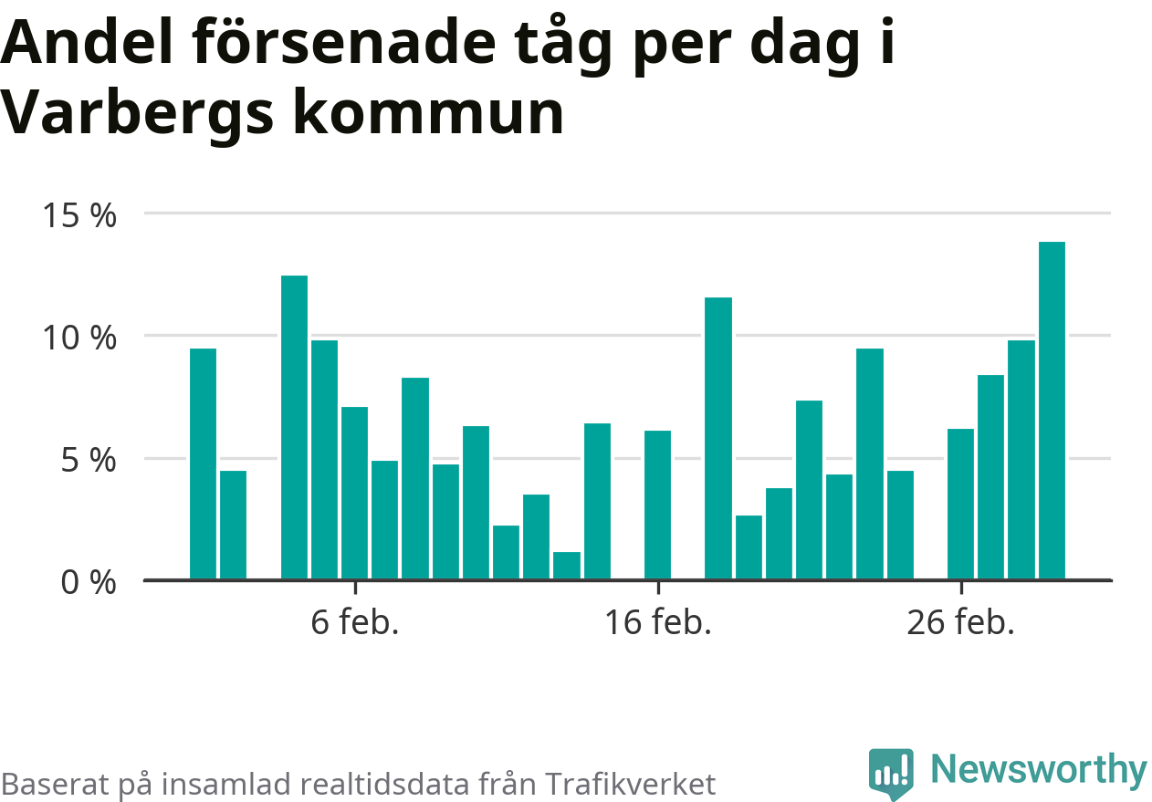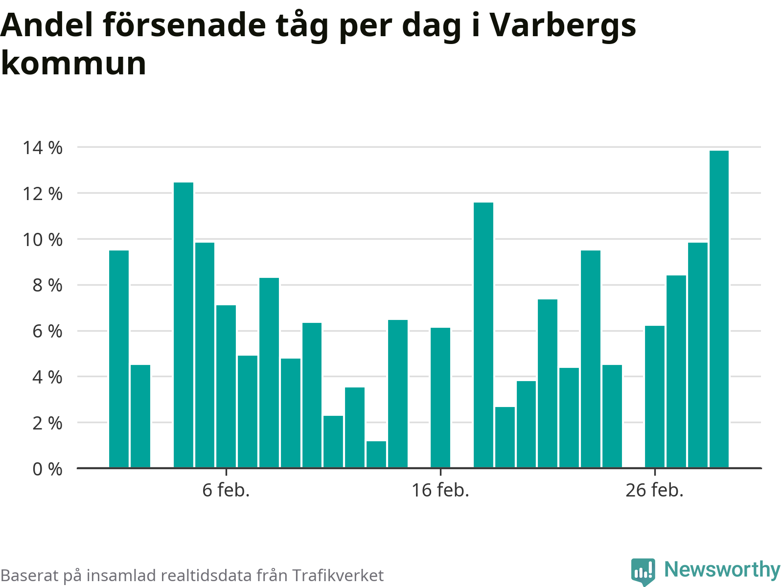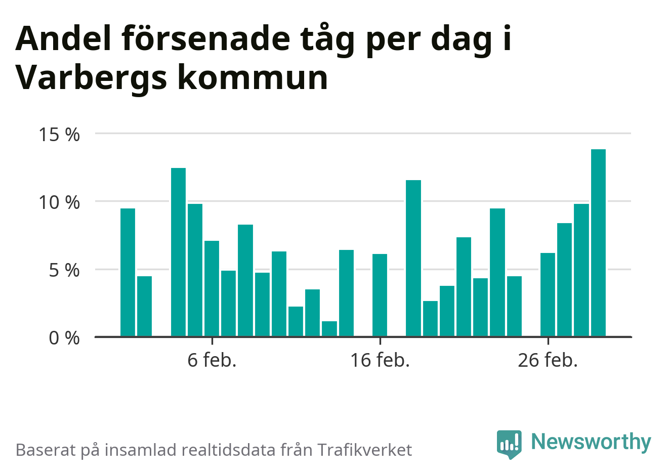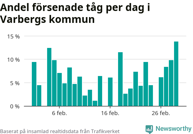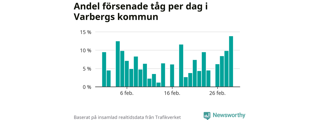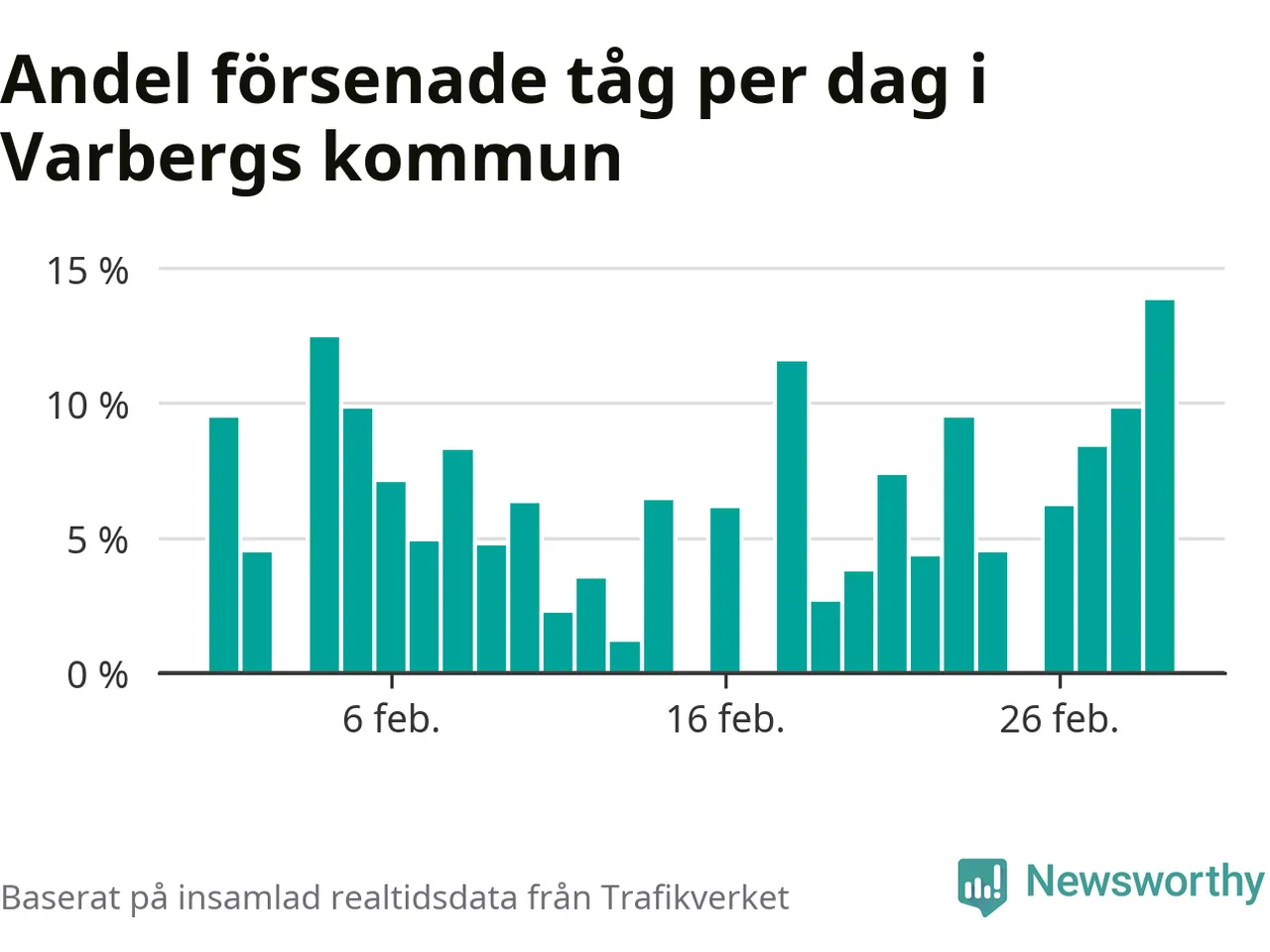 Vintern har kantats av stora tågförseningar. Newsworthy har samlat in ankomsttider under hela februari, för att se hur stor andel av tågen till Varbergs kommun som var i tid under månaden.