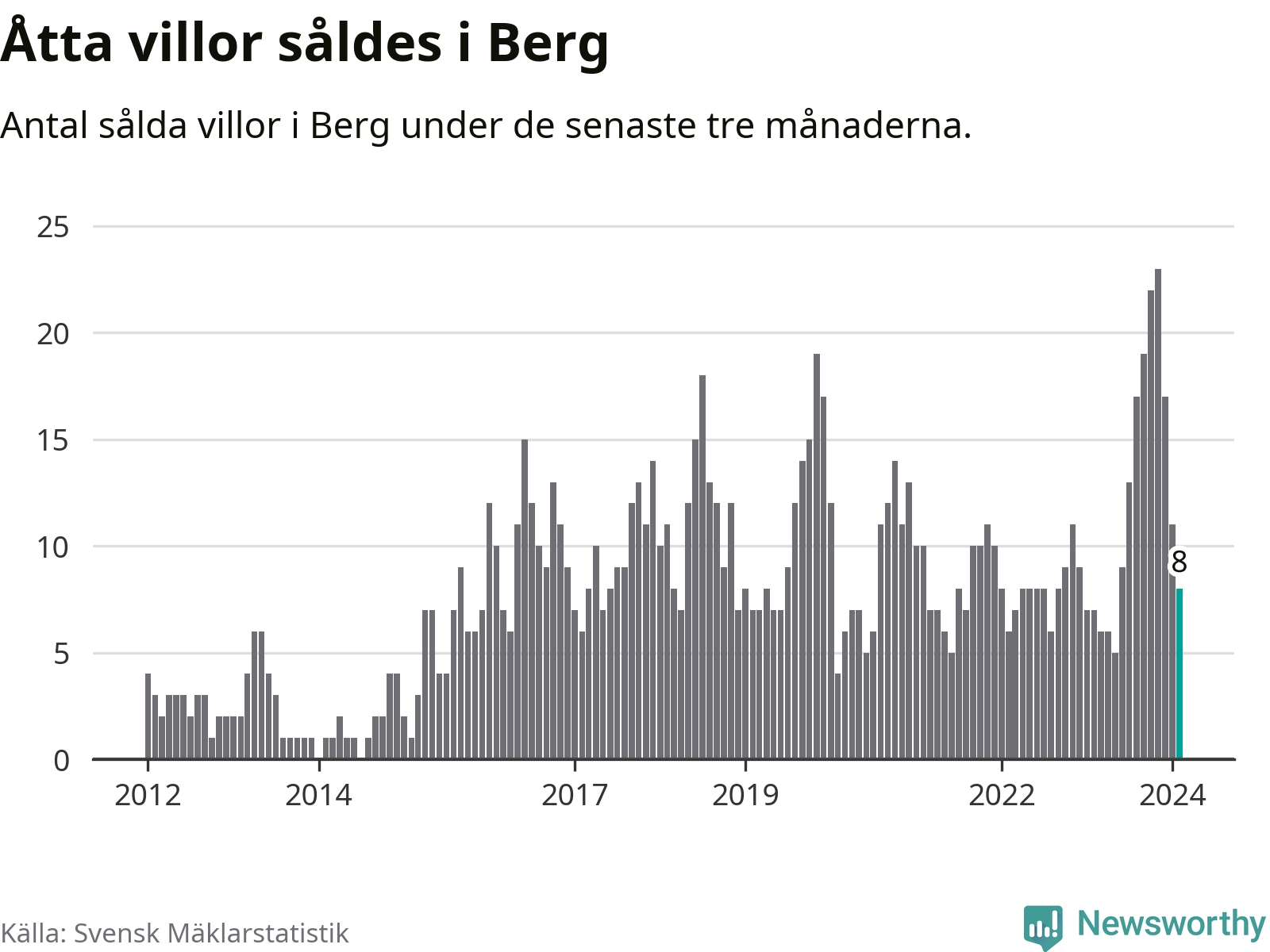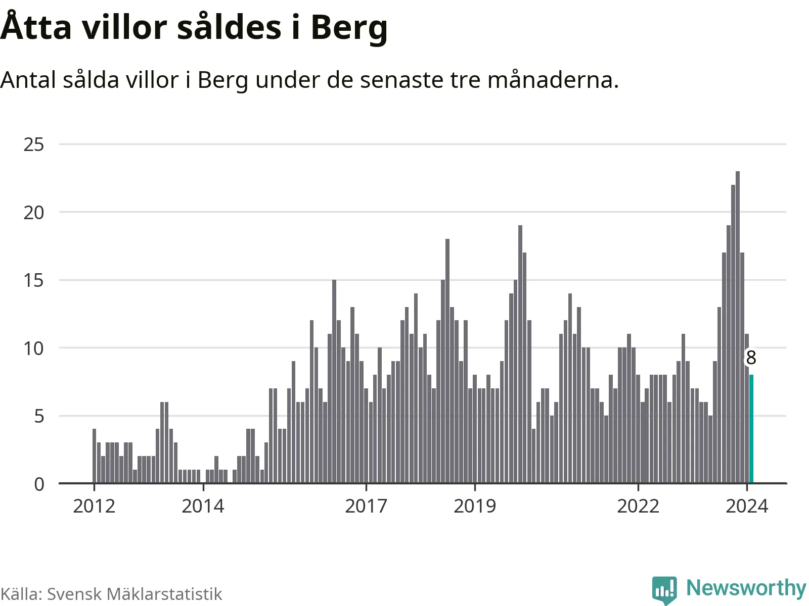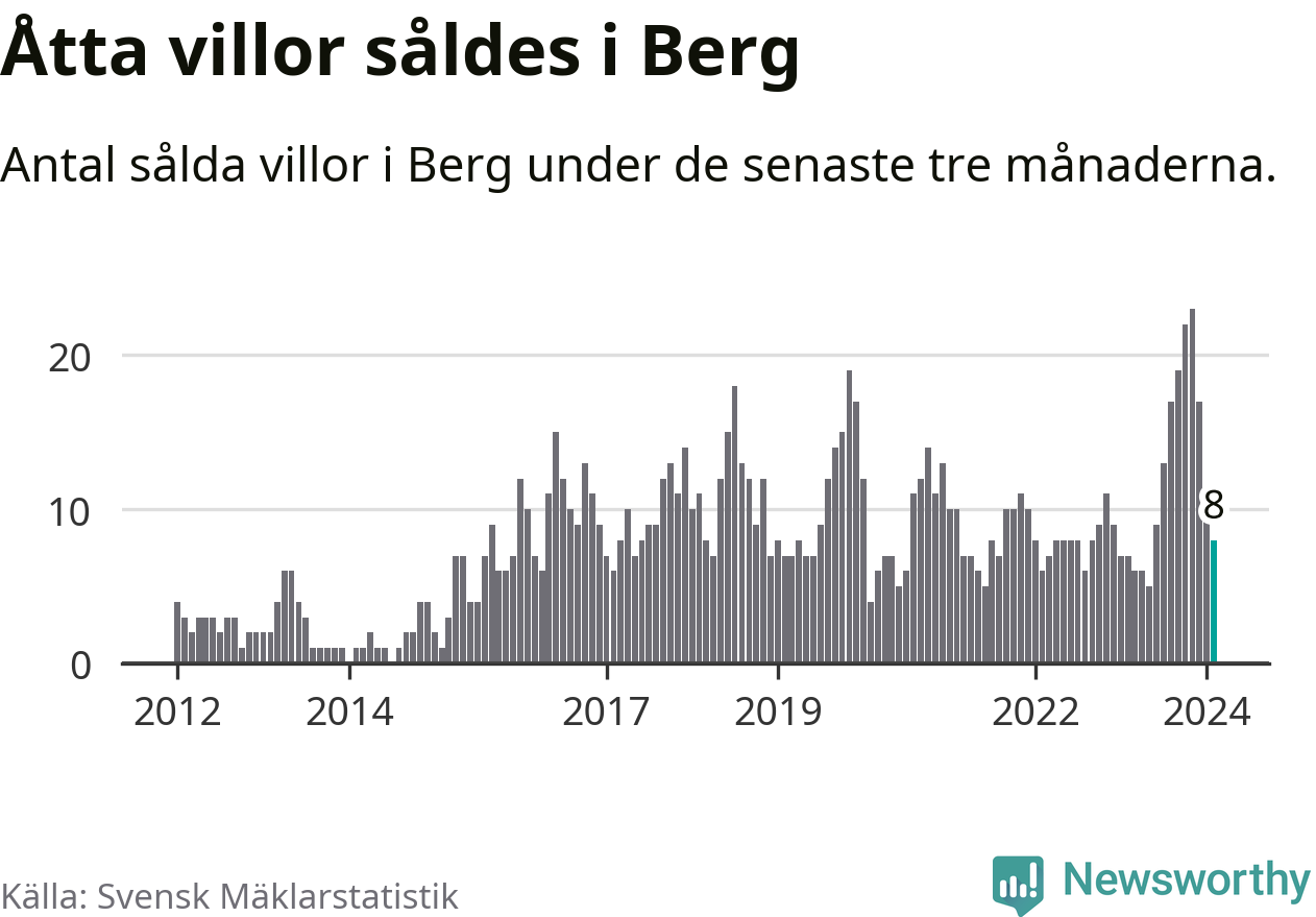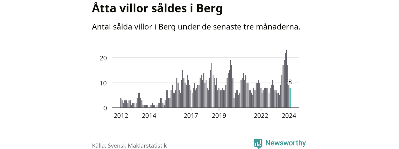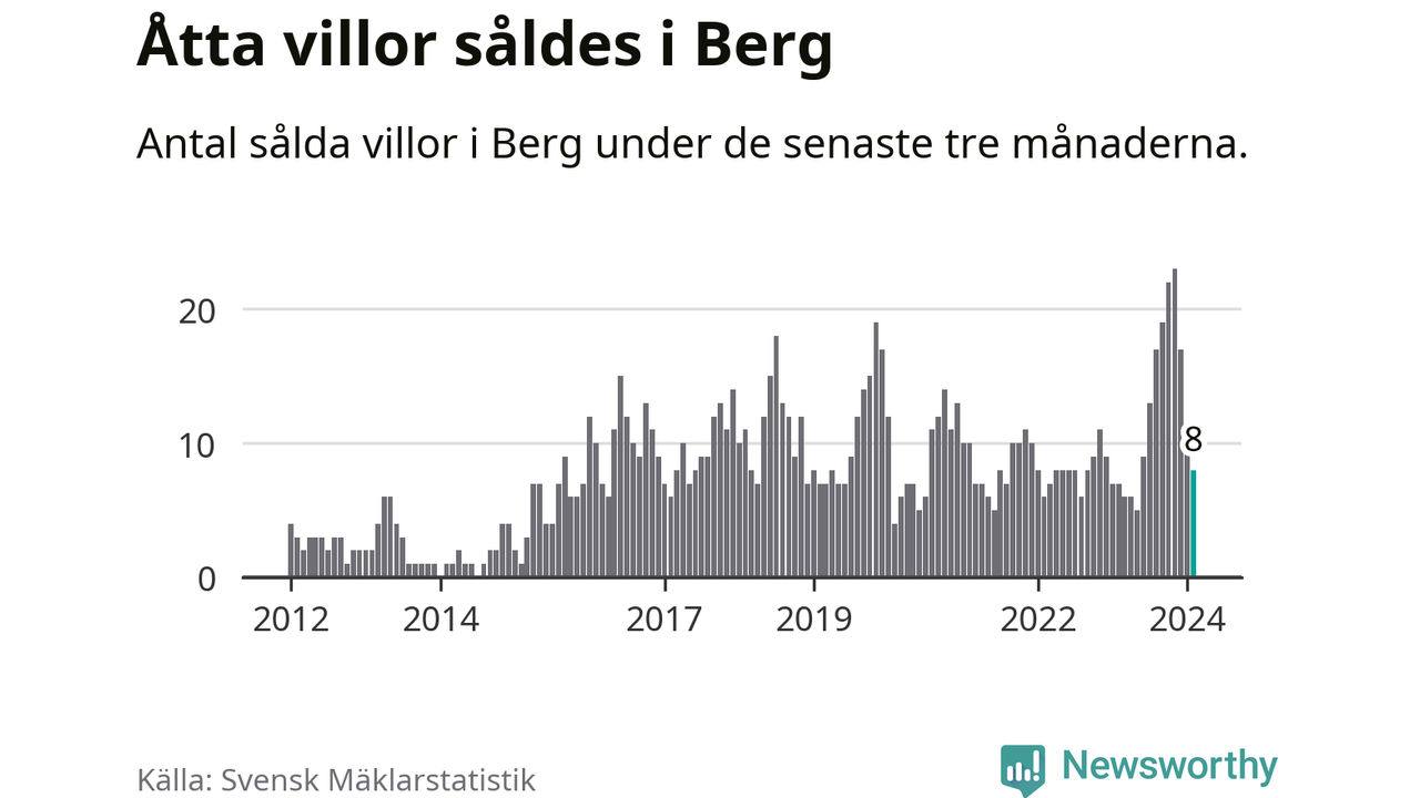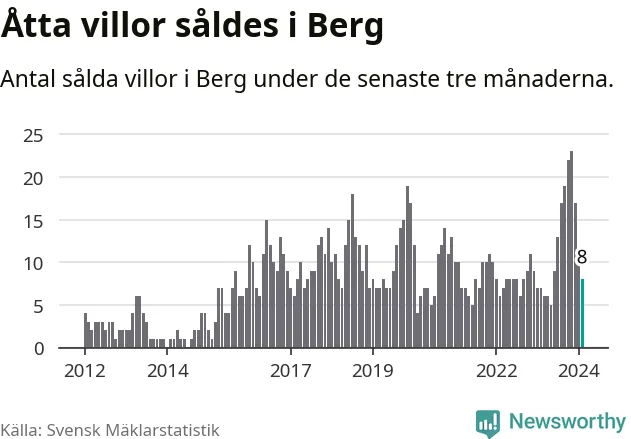 Mellan december och februari gjordes sammanlagt åtta affärer med villor i Bergs kommun. Det kan jämföras med sju vid motsvarande tid i fjol.