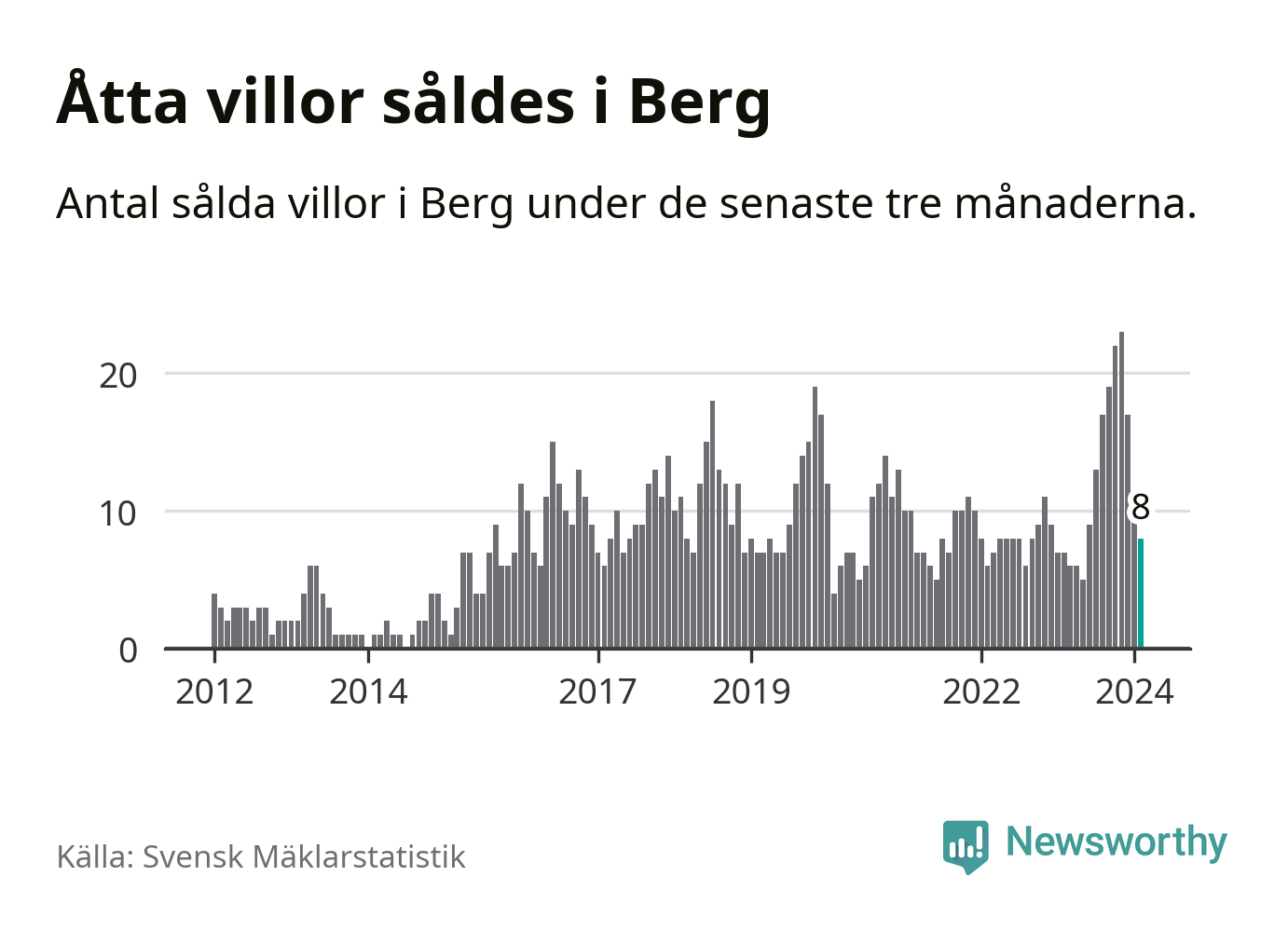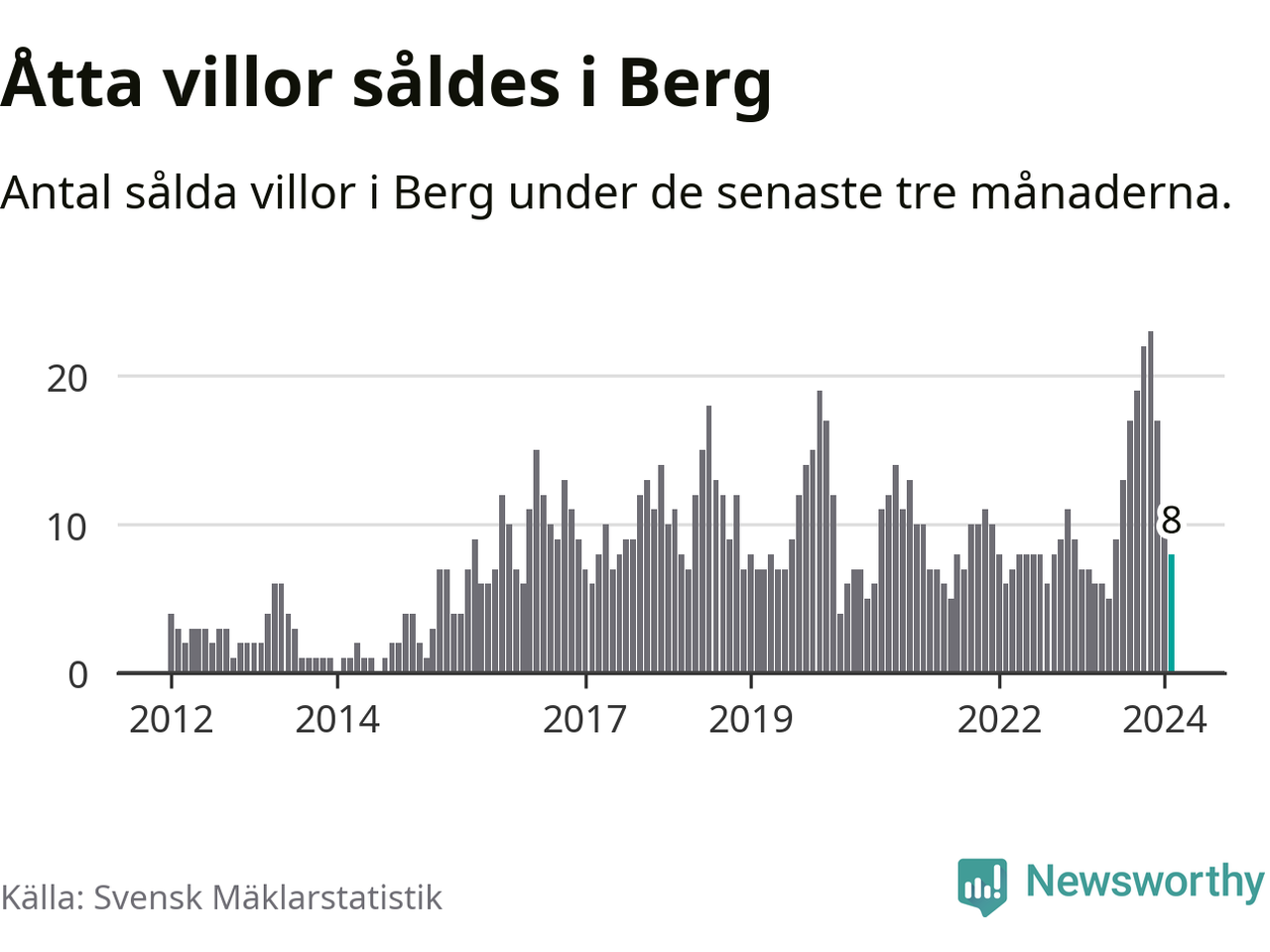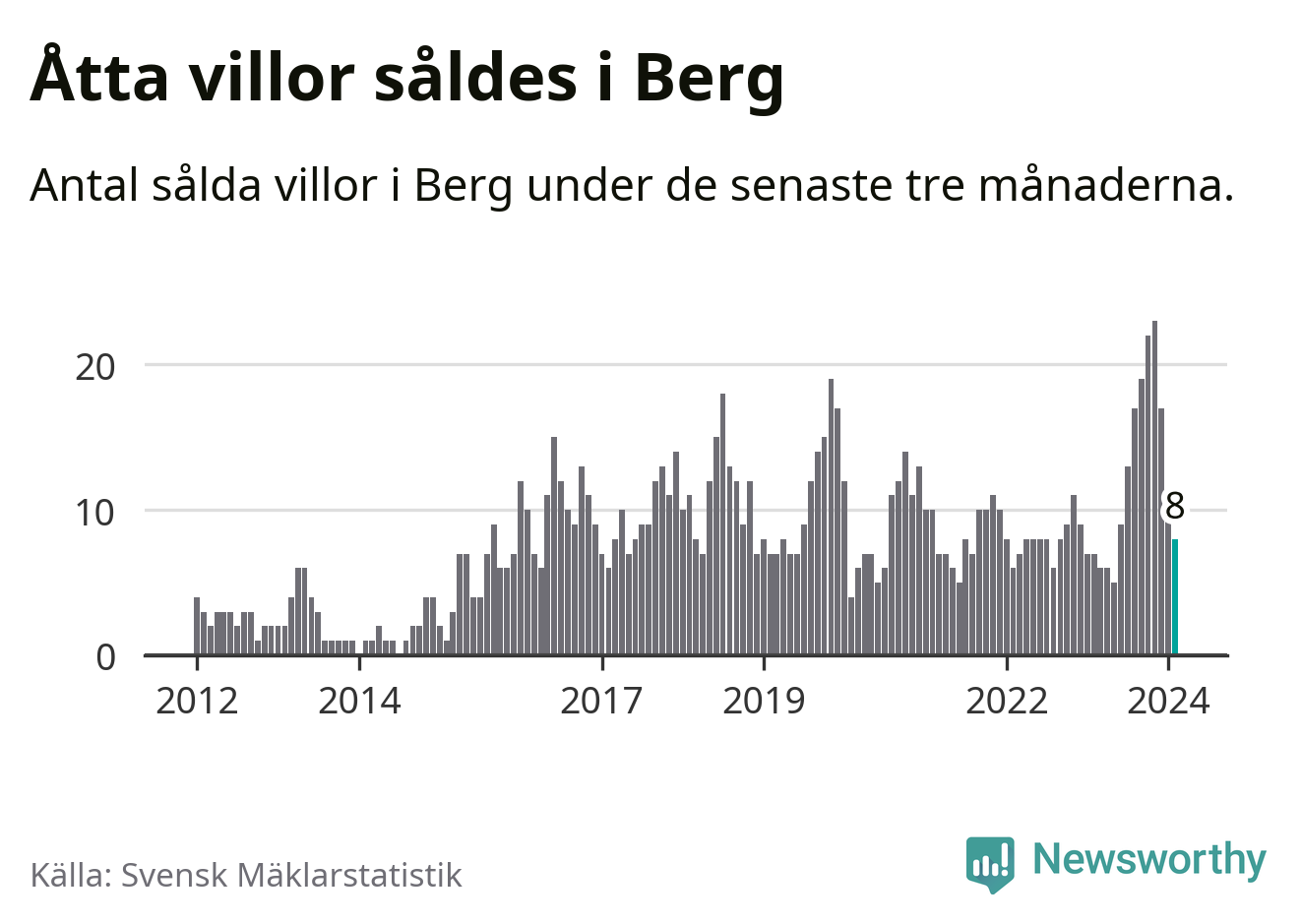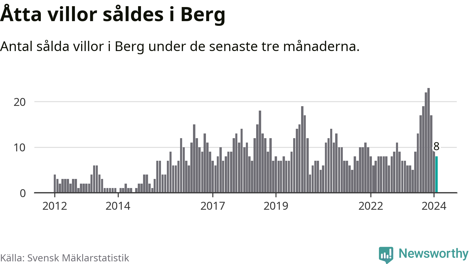 Mellan december och februari gjordes sammanlagt åtta affärer med villor i Bergs kommun. Det kan jämföras med sju vid motsvarande tid i fjol.