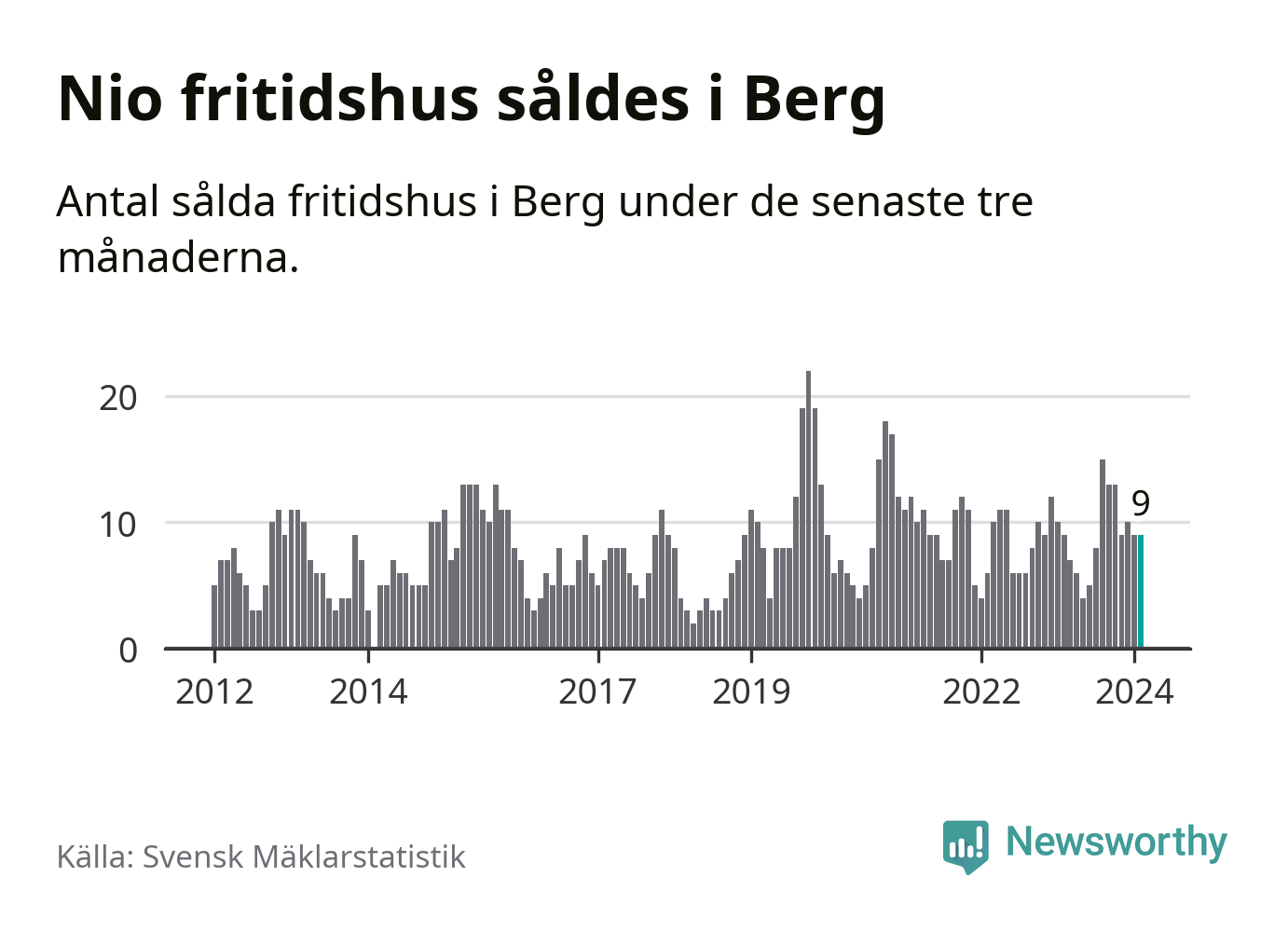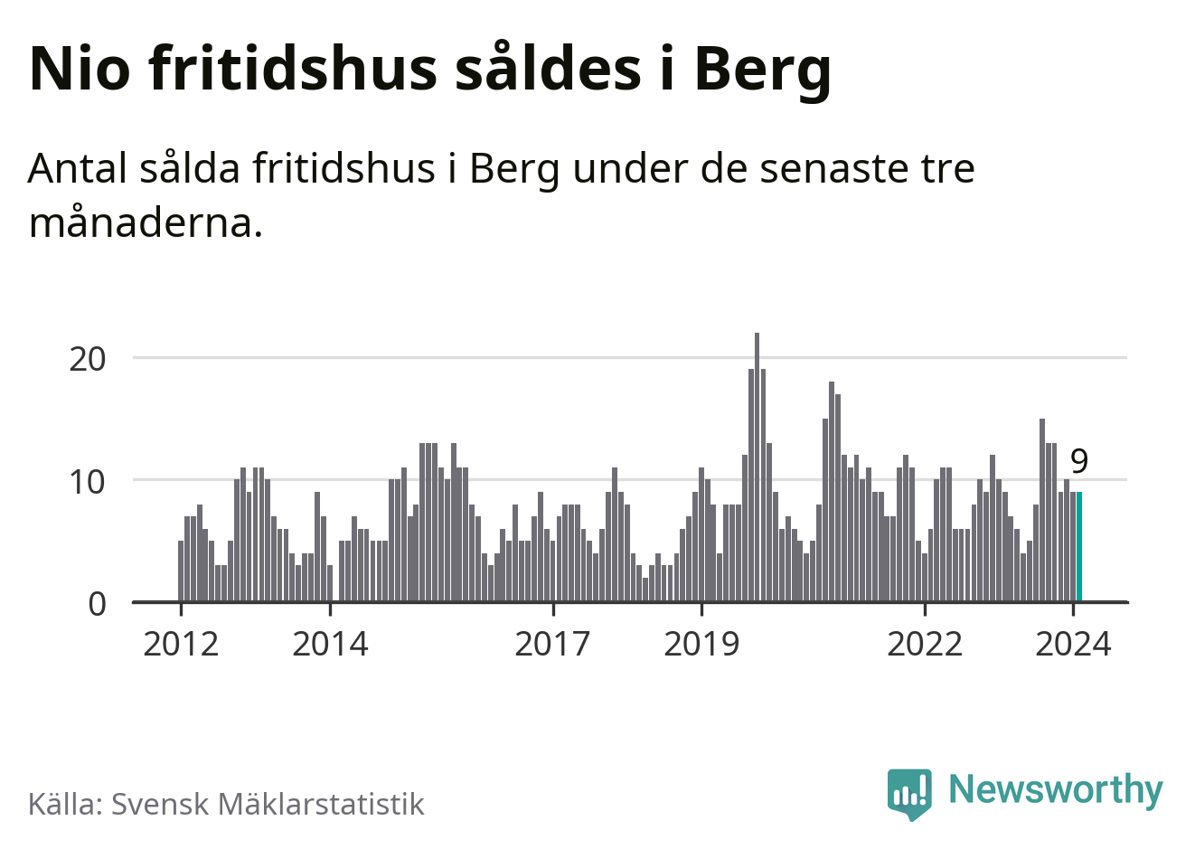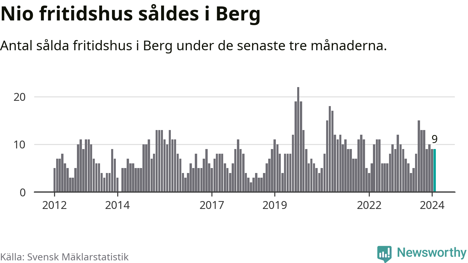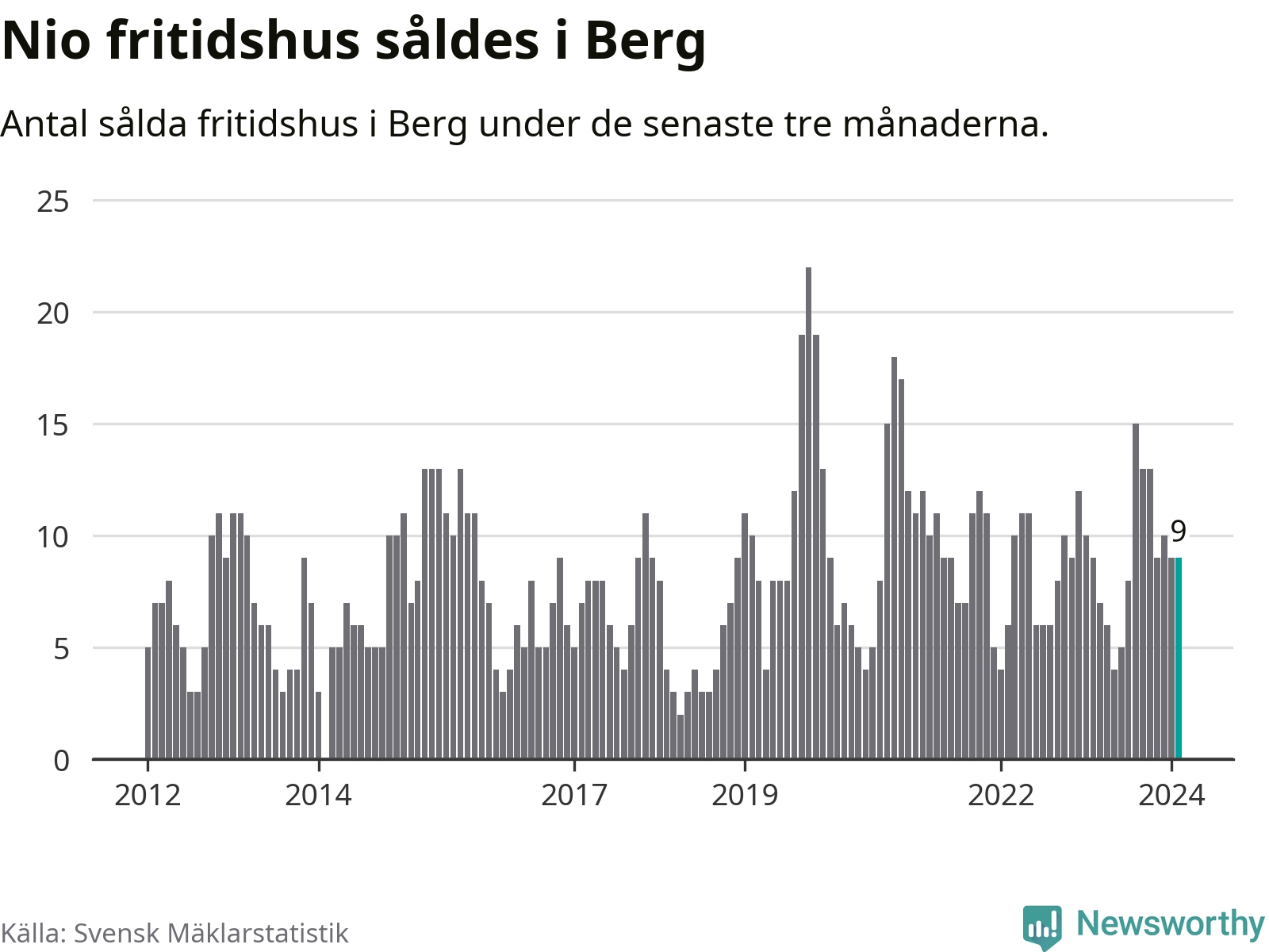 Sammanlagt såldes nio fritidshus i Bergs kommun mellan december 2023 och februari till ett genomsnittligt pris på 2,5 miljoner kronor. I fjol gjordes nio affärer vid den här tiden på året.