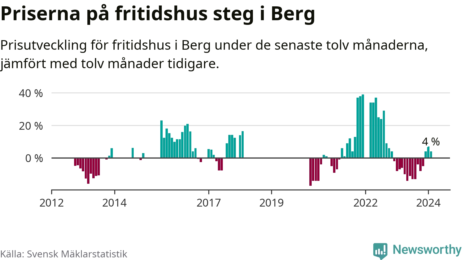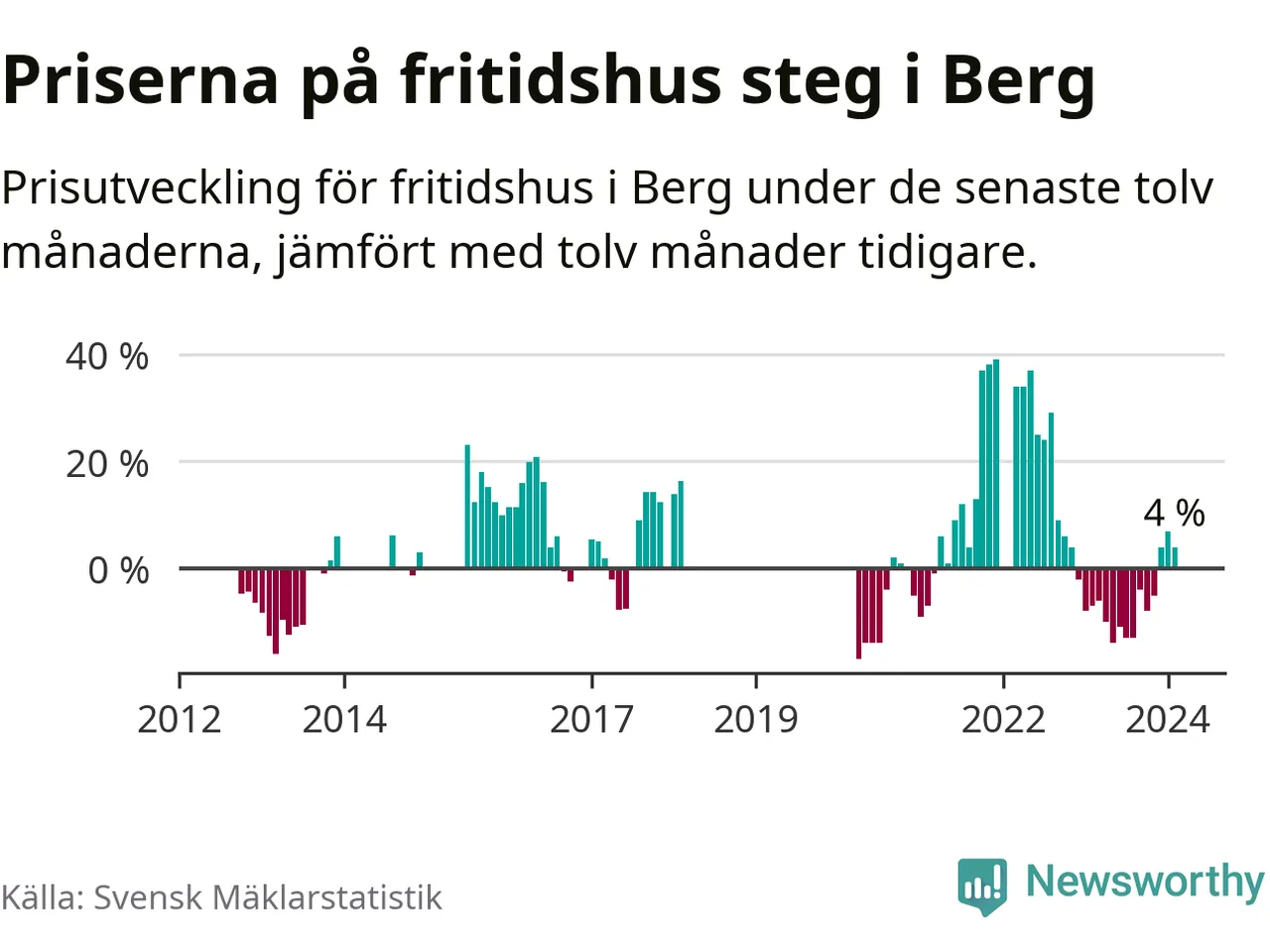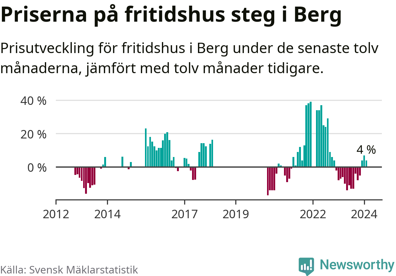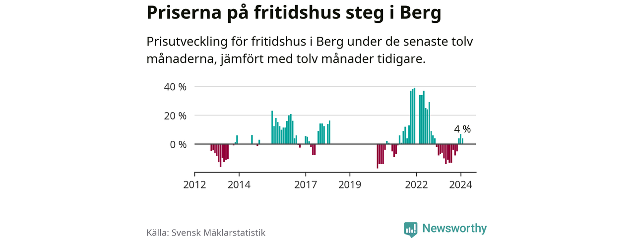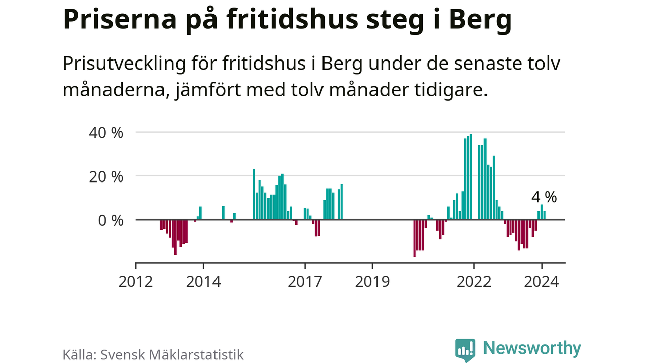 Priserna på fritidshus har gått upp i Bergs kommun. Medelpriset på försäljningarna under de senaste tolv månaderna visar på en uppgång med 4 procent.