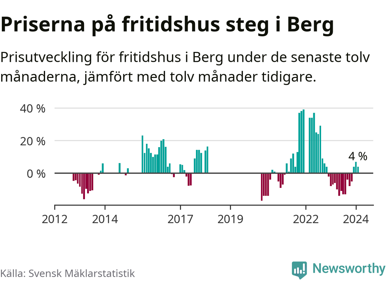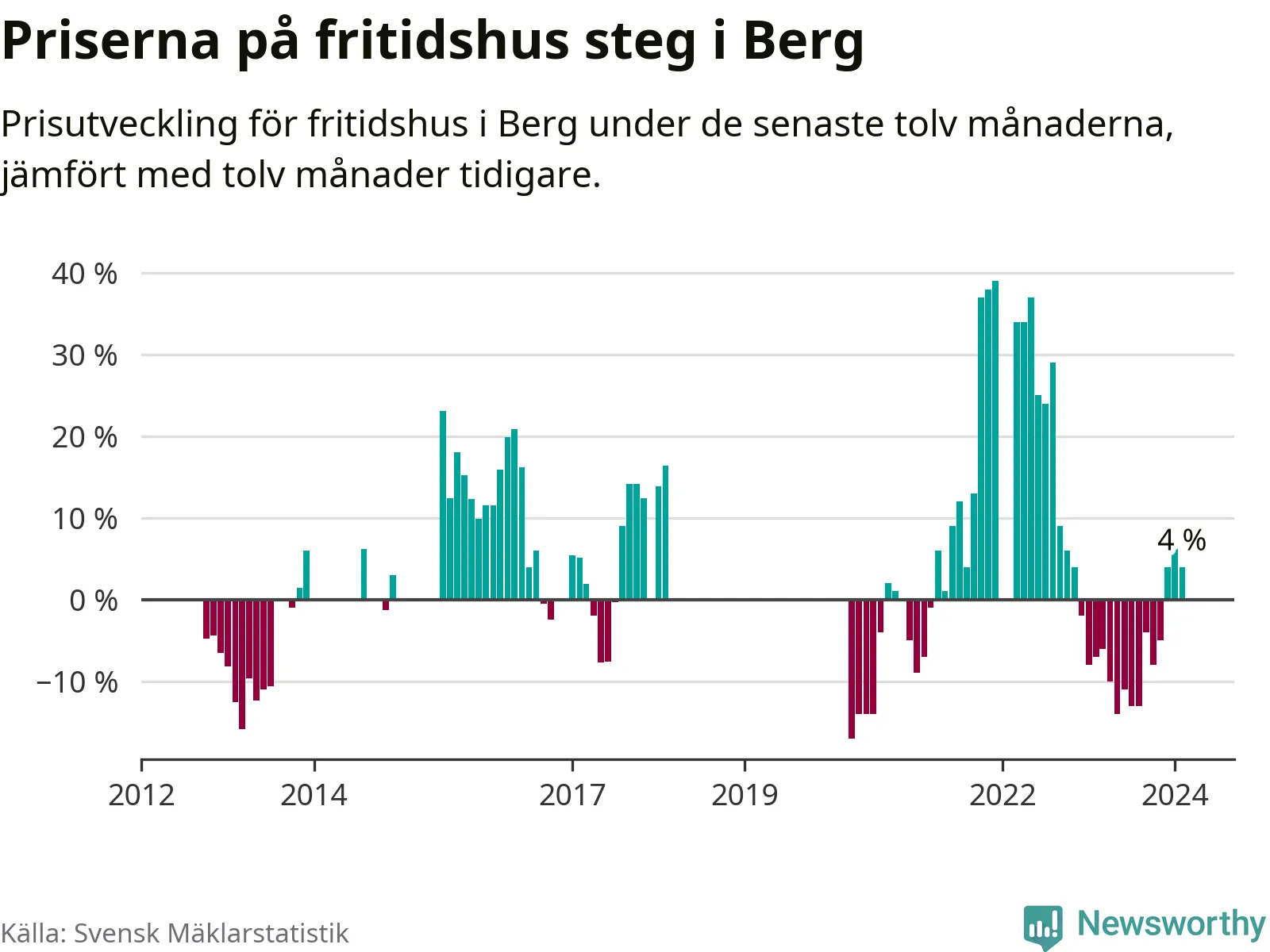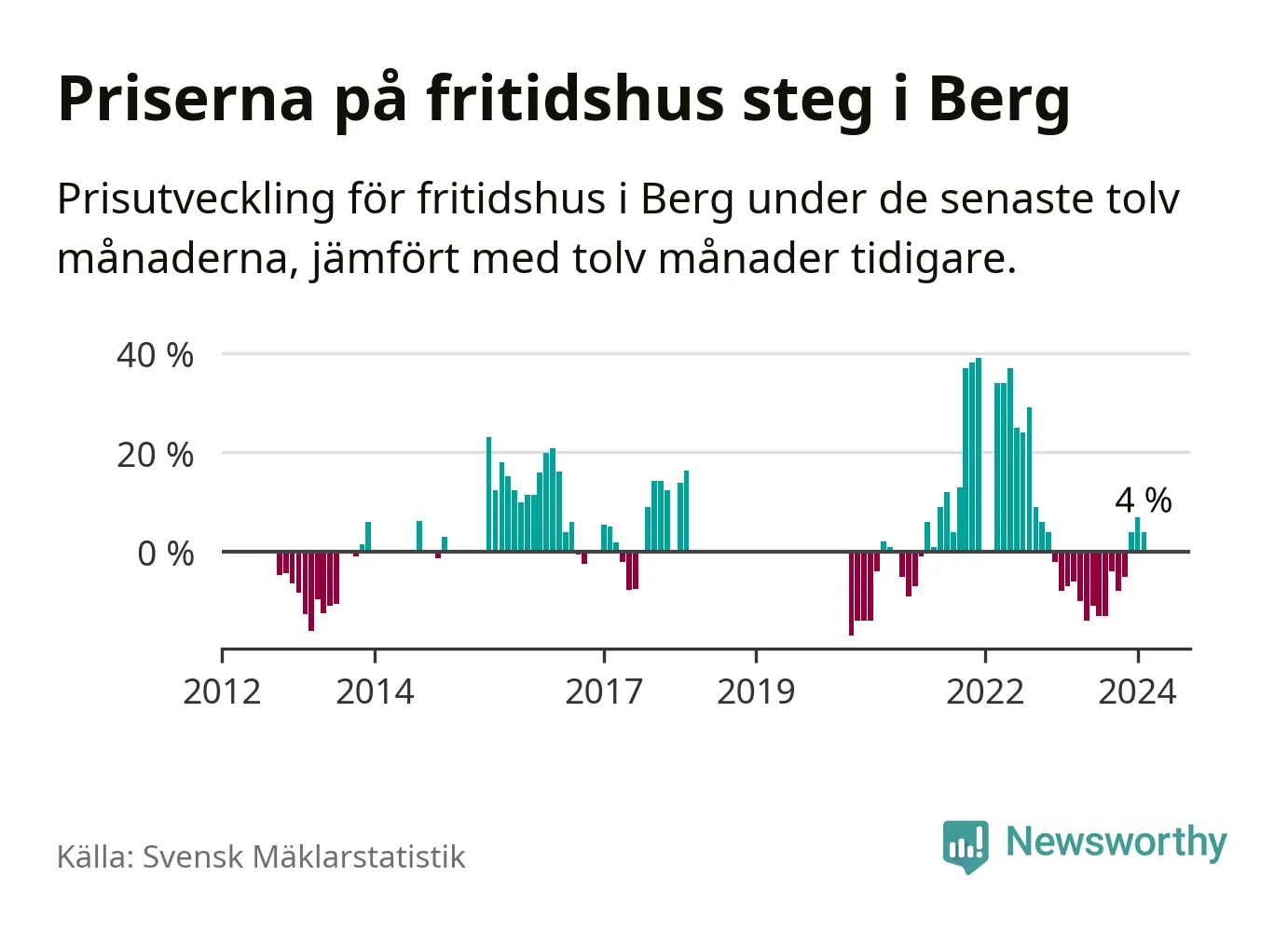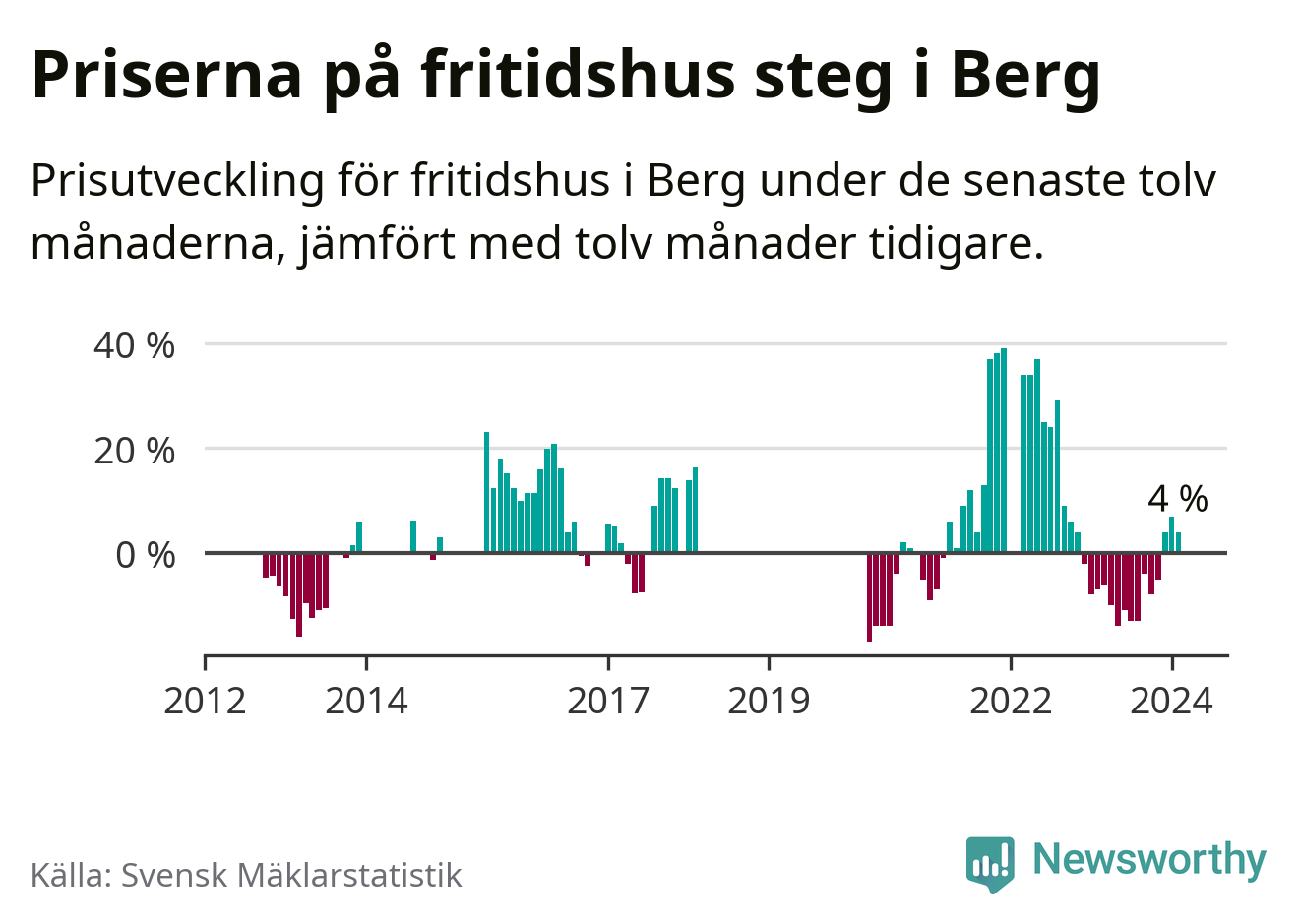 Priserna på fritidshus har gått upp i Bergs kommun. Medelpriset på försäljningarna under de senaste tolv månaderna visar på en uppgång med 4 procent.