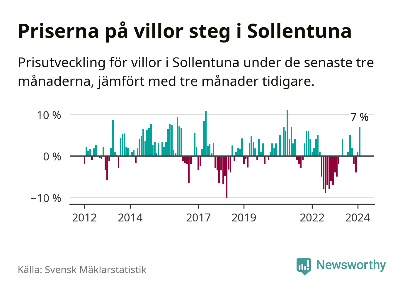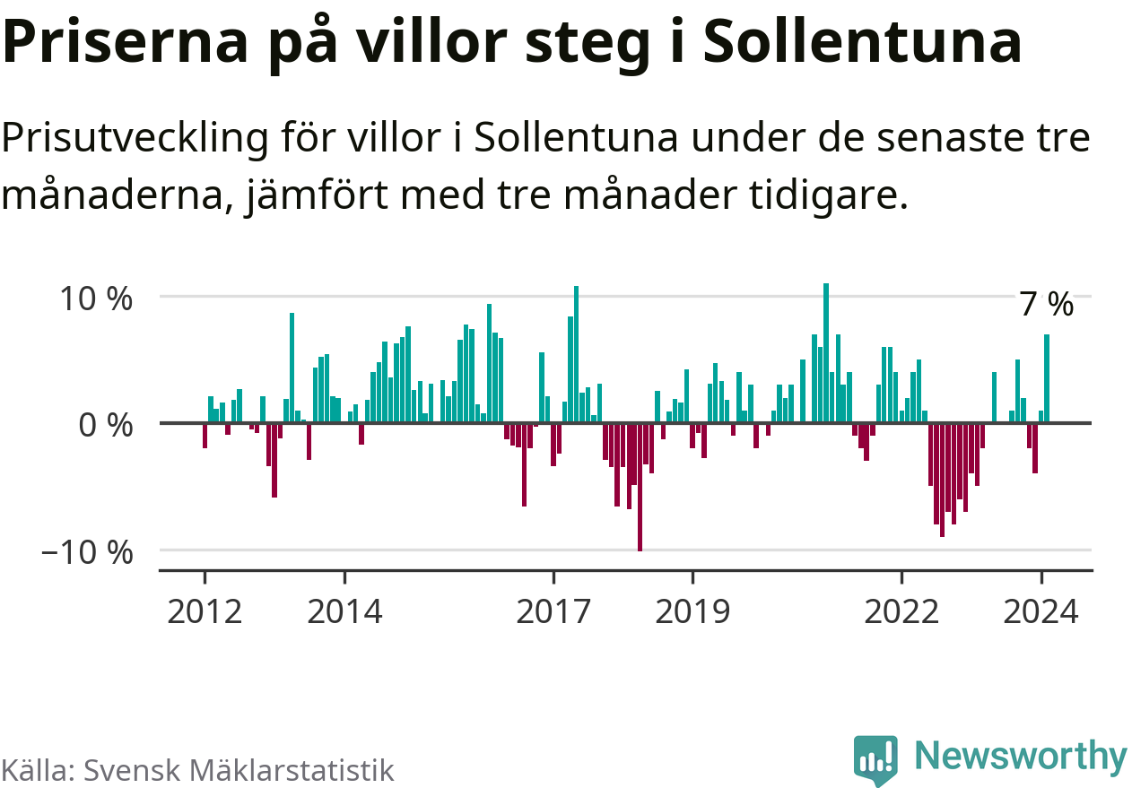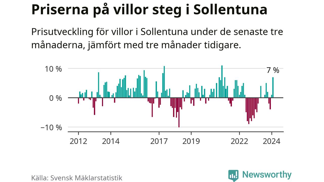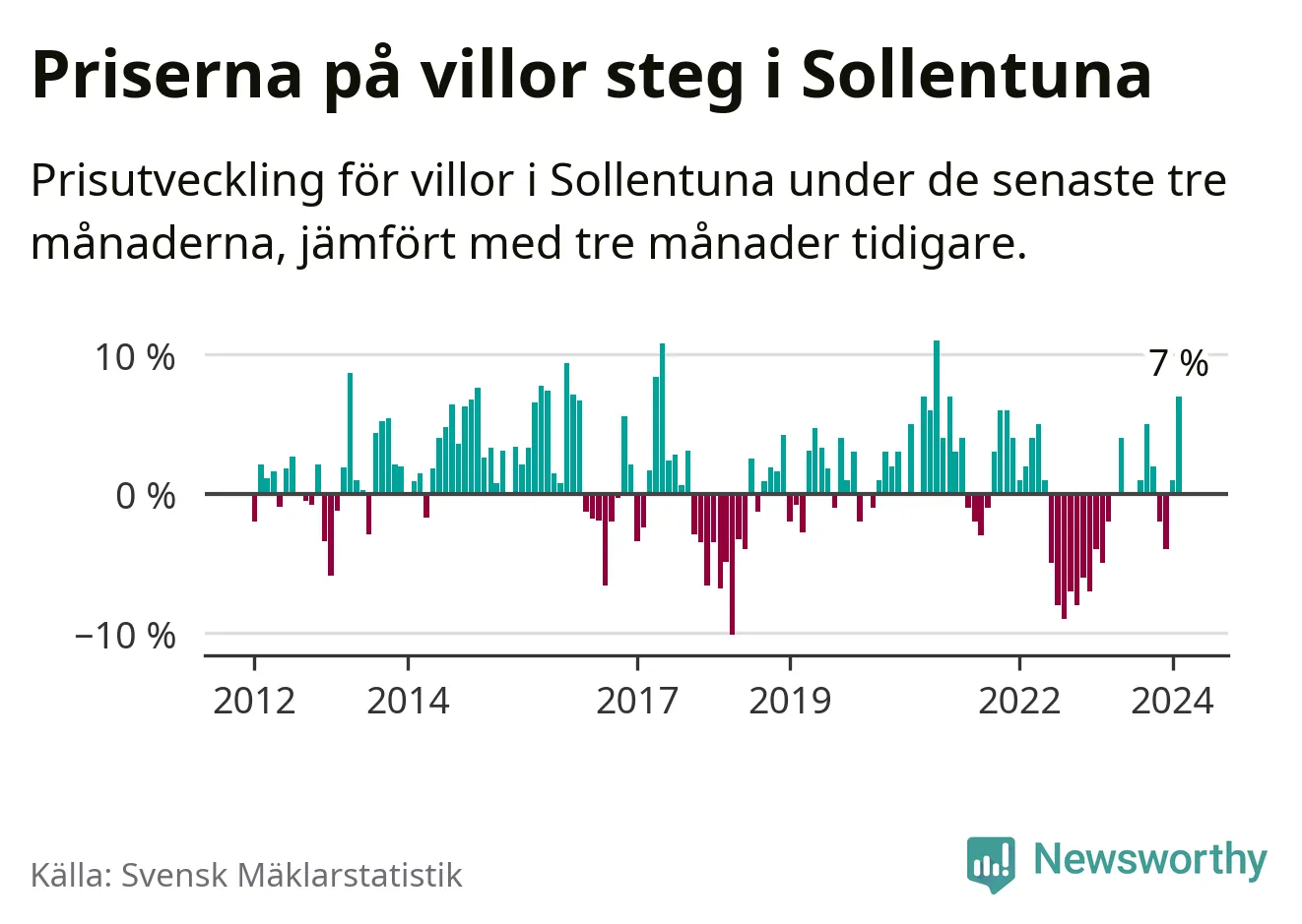 Villapriserna steg mellan december och februari med 7 procent i Sollentuna kommun. Det är en betydande uppgång jämfört med det gångna året då priserna i snitt ökat med 1 procent.