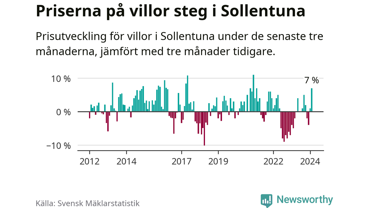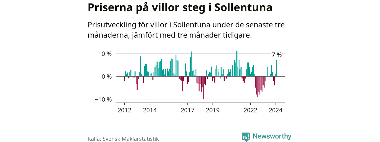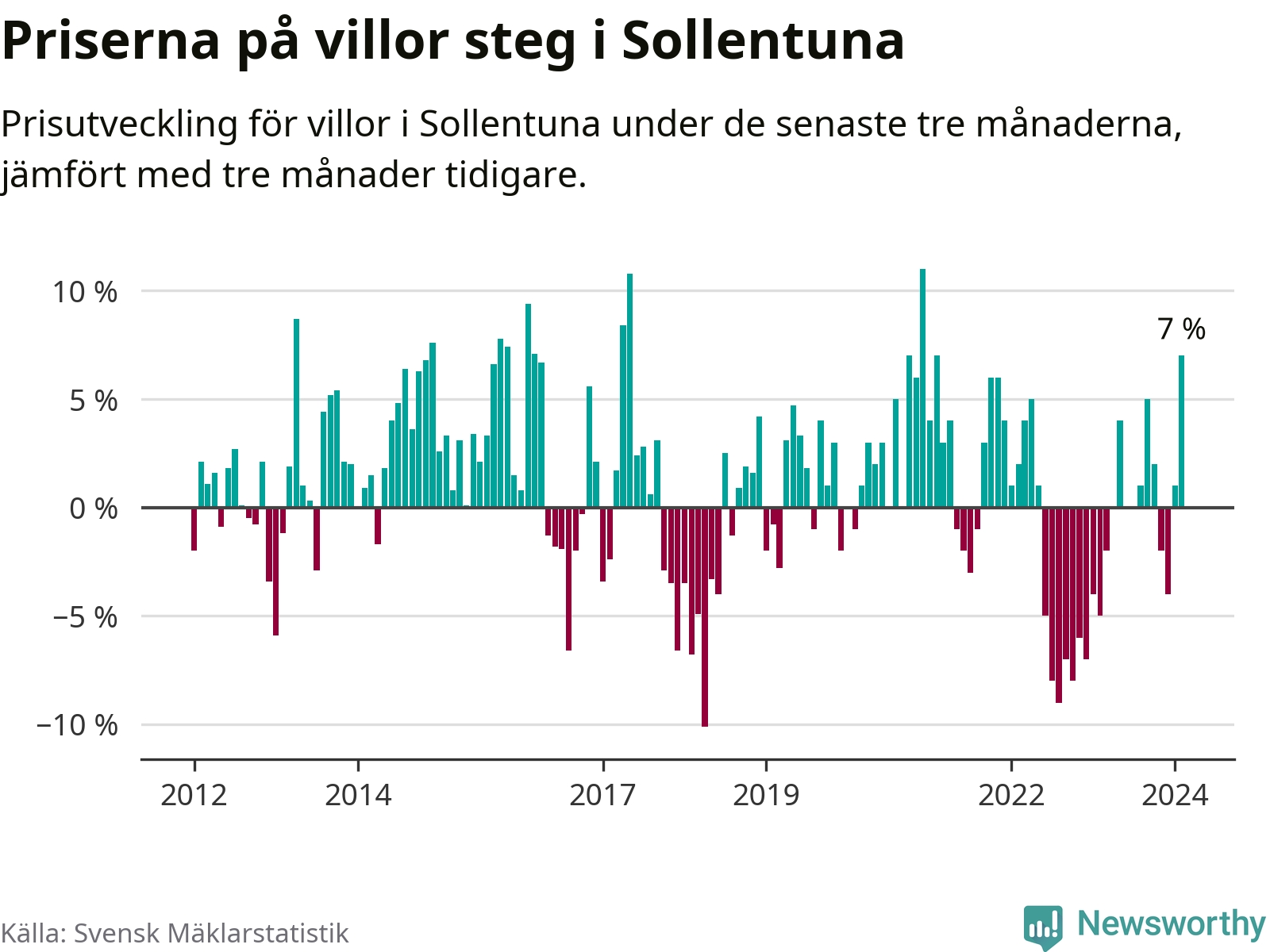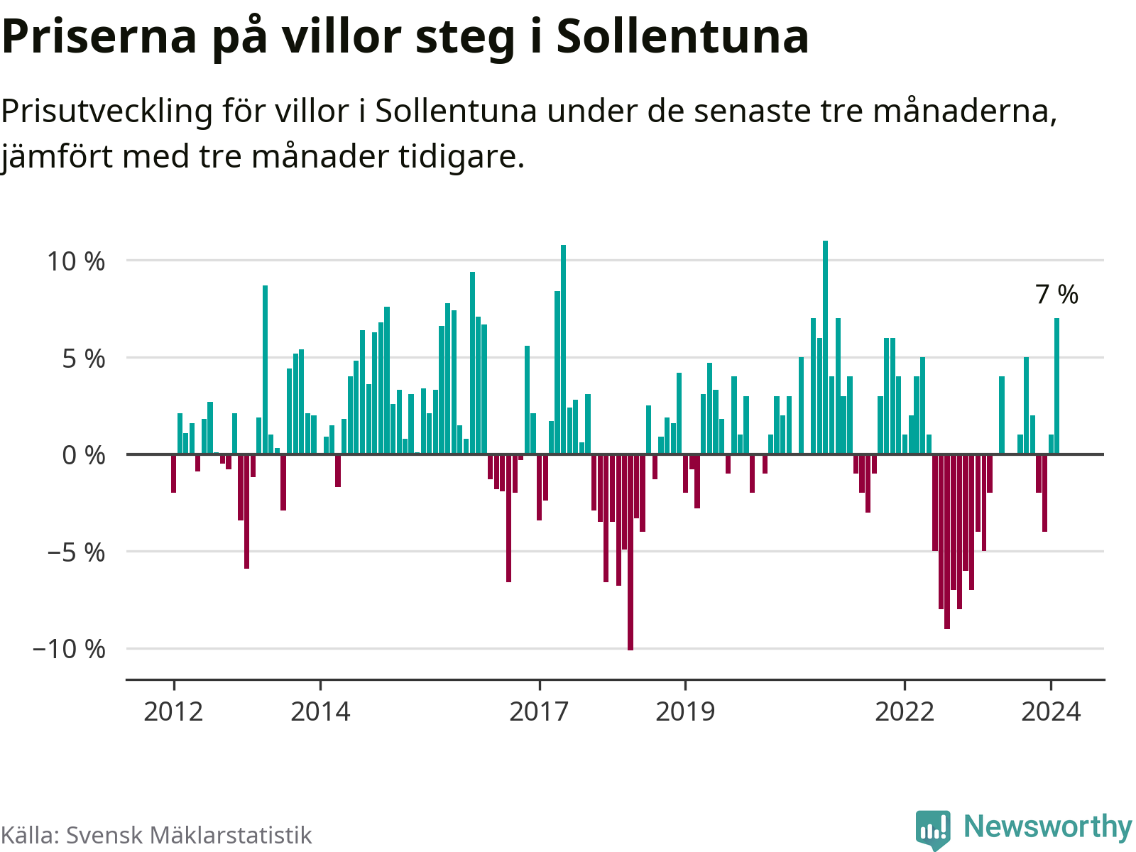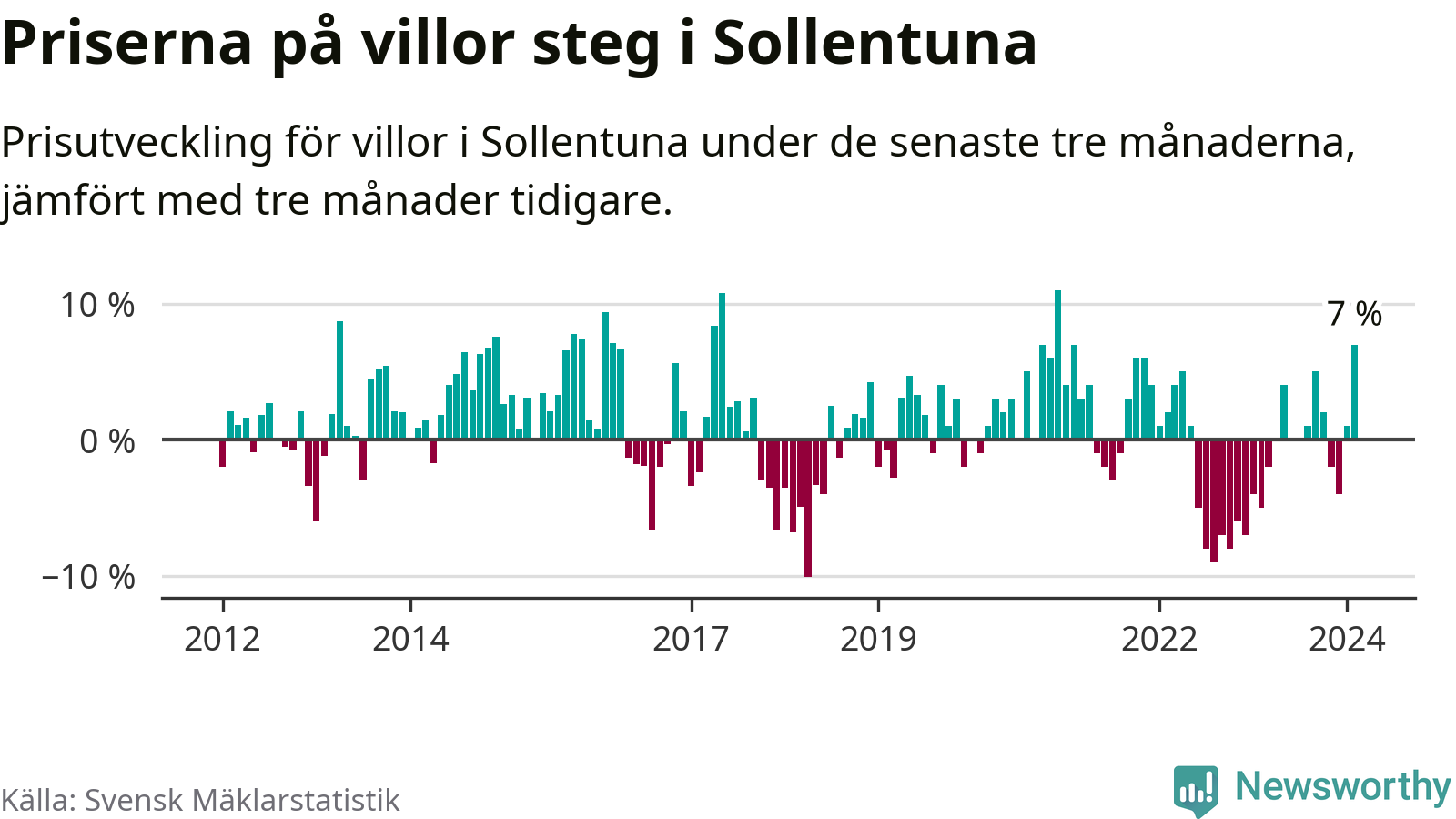 Villapriserna steg mellan december och februari med 7 procent i Sollentuna kommun. Det är en betydande uppgång jämfört med det gångna året då priserna i snitt ökat med 1 procent.