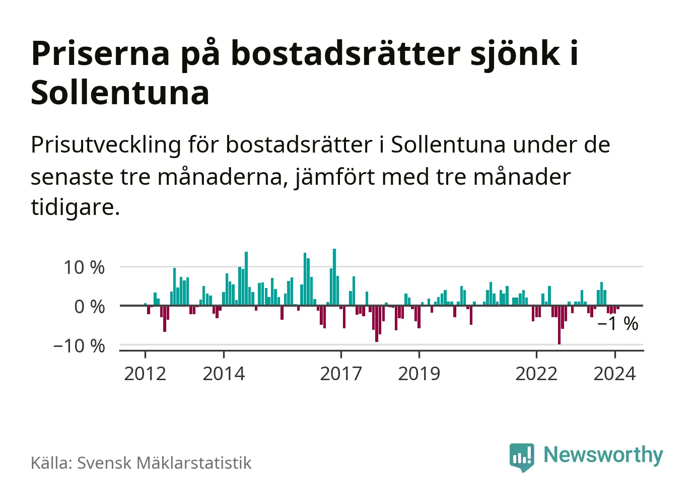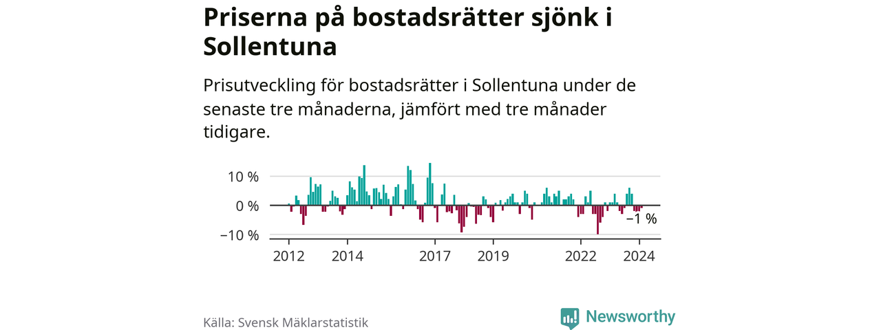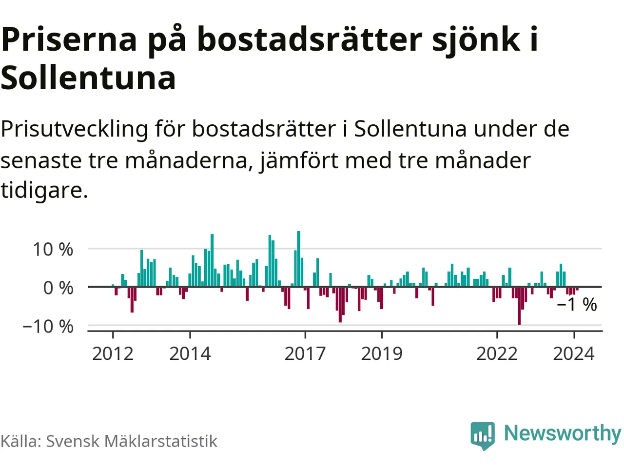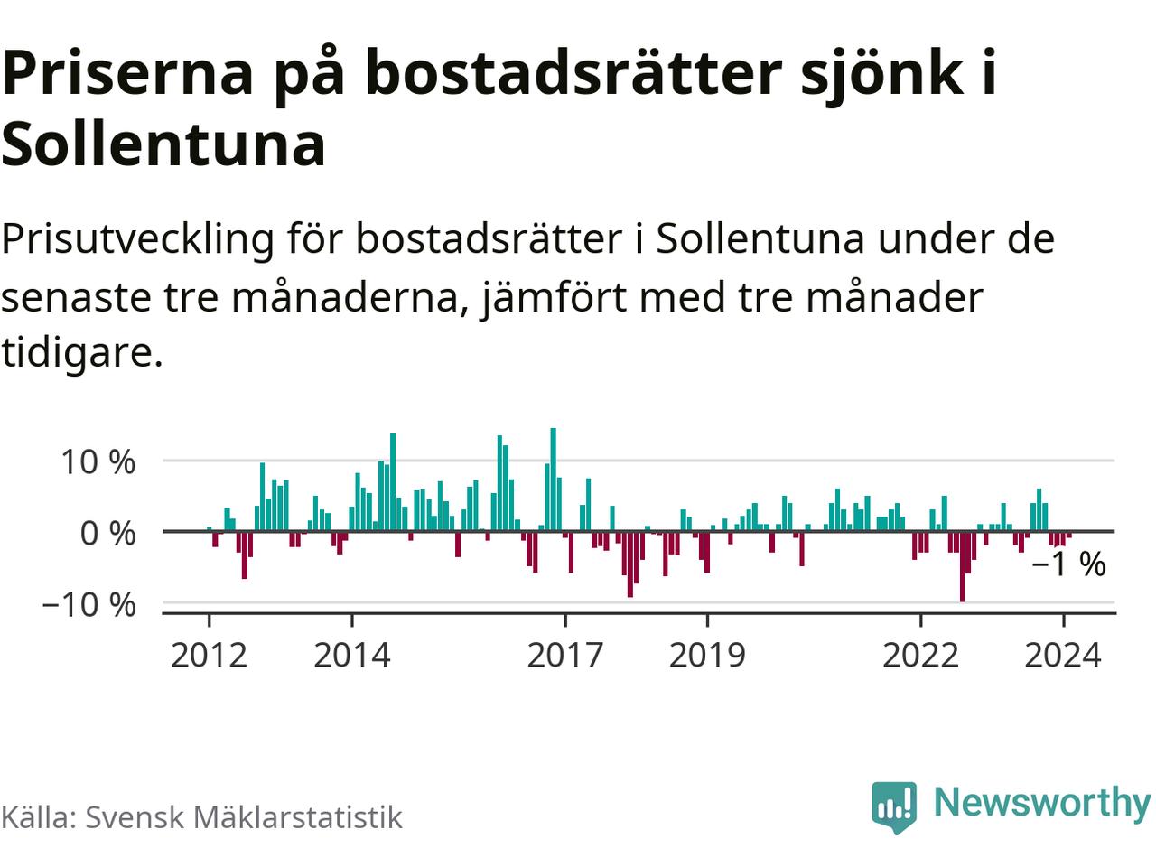Priserna på bostadsrätter har gått ner i Sollentuna kommun. Medelpriset på försäljningarna under de senaste tre månaderna visar på en nedgång med 1 procent.