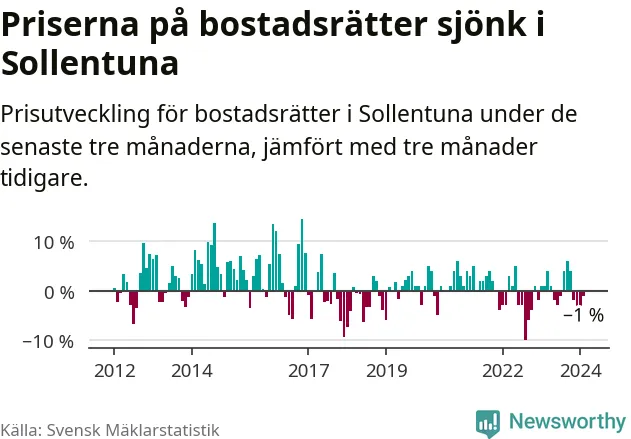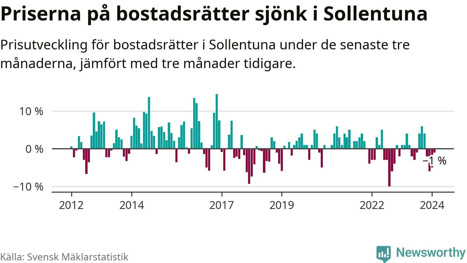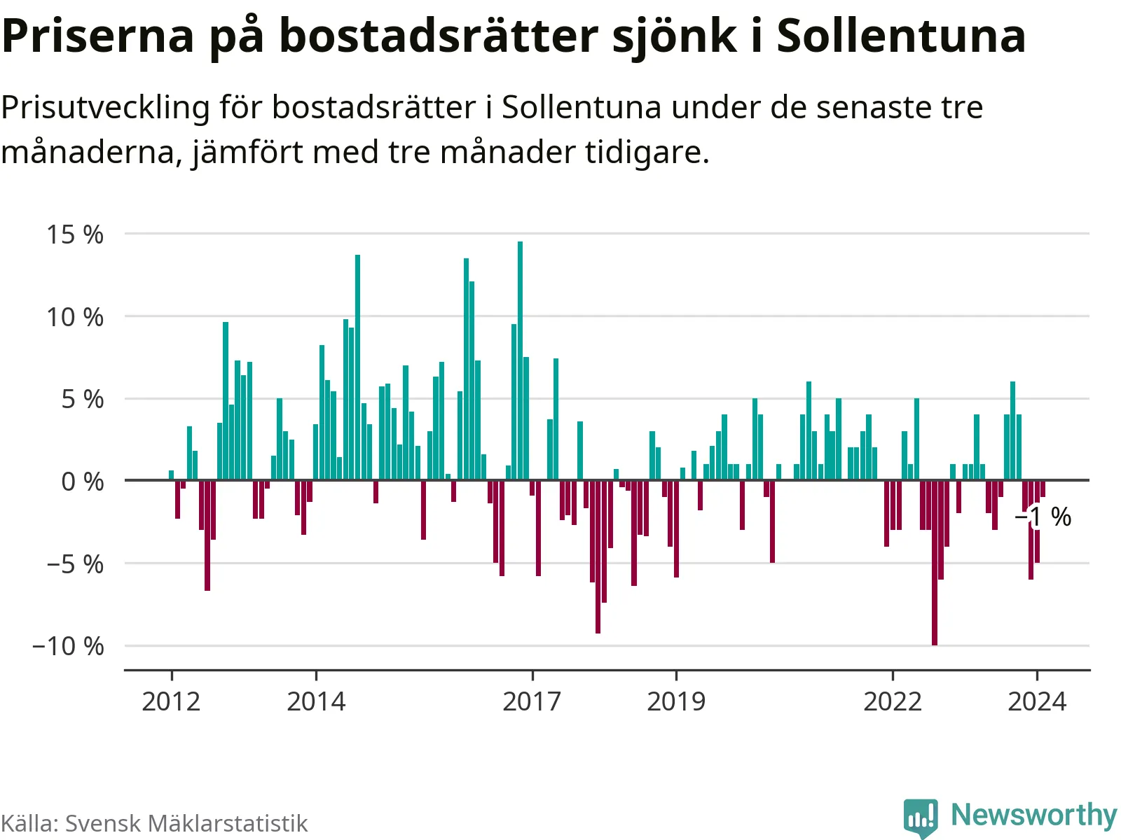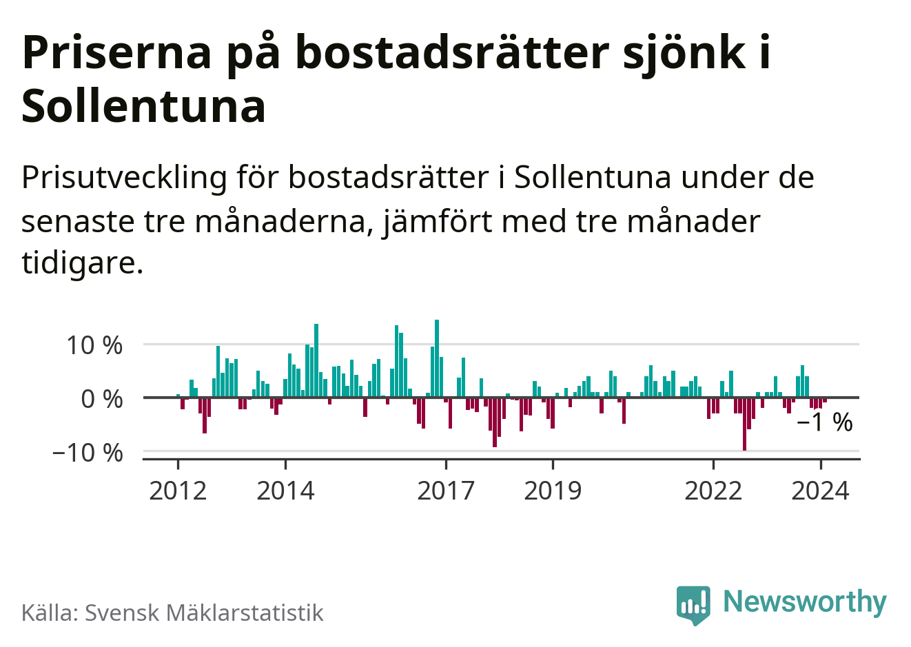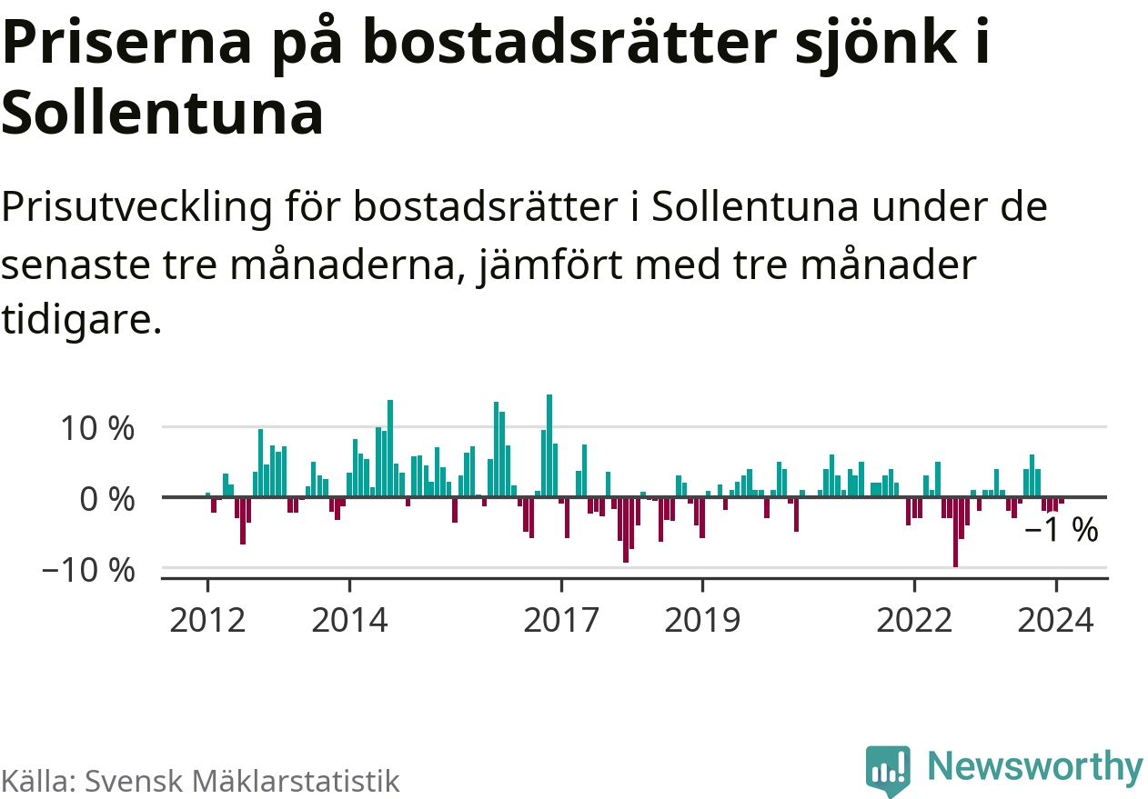 Priserna på bostadsrätter har gått ner i Sollentuna kommun. Medelpriset på försäljningarna under de senaste tre månaderna visar på en nedgång med 1 procent.