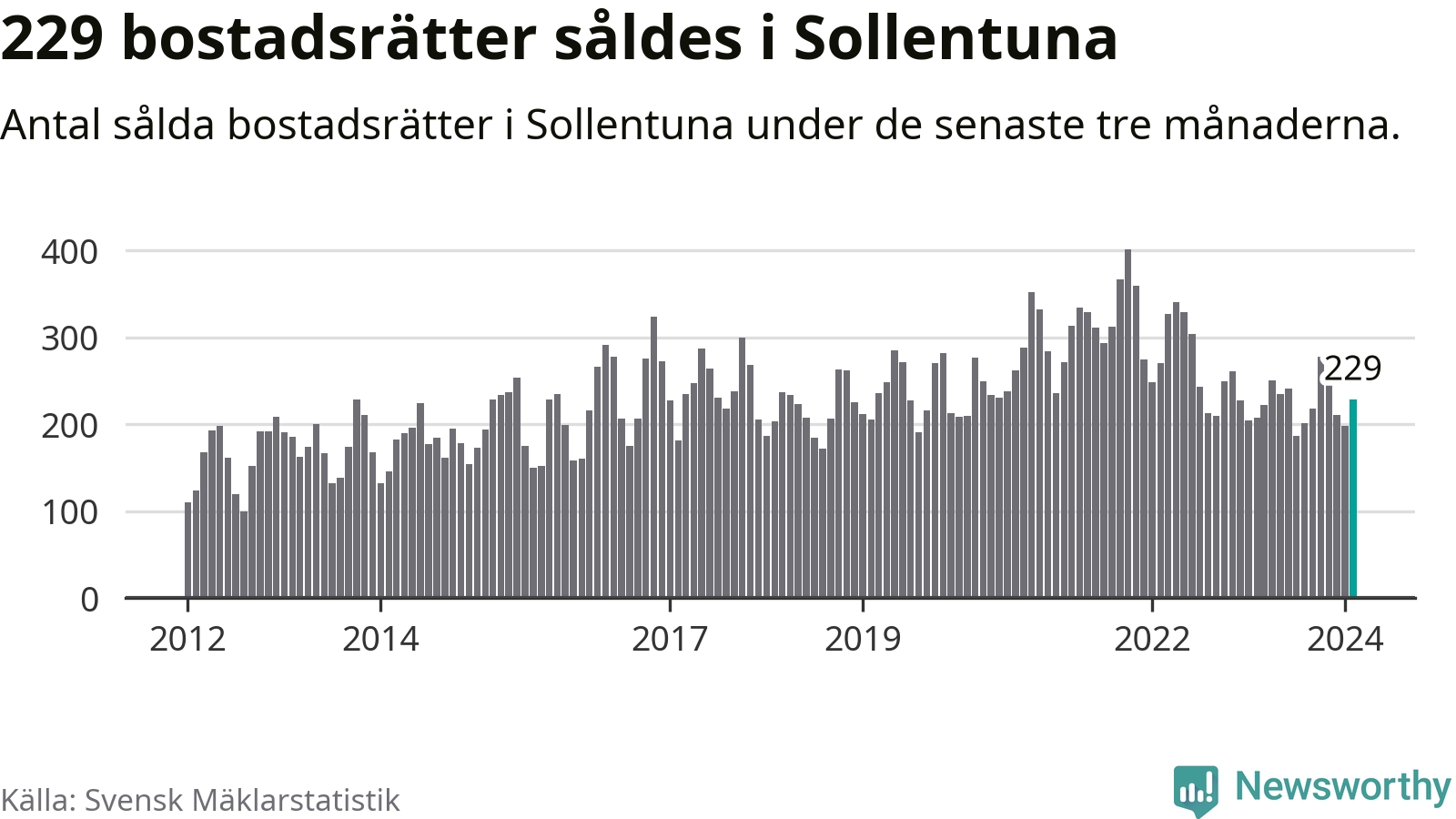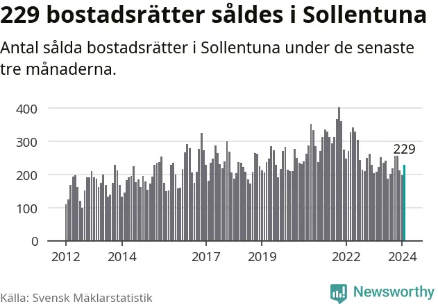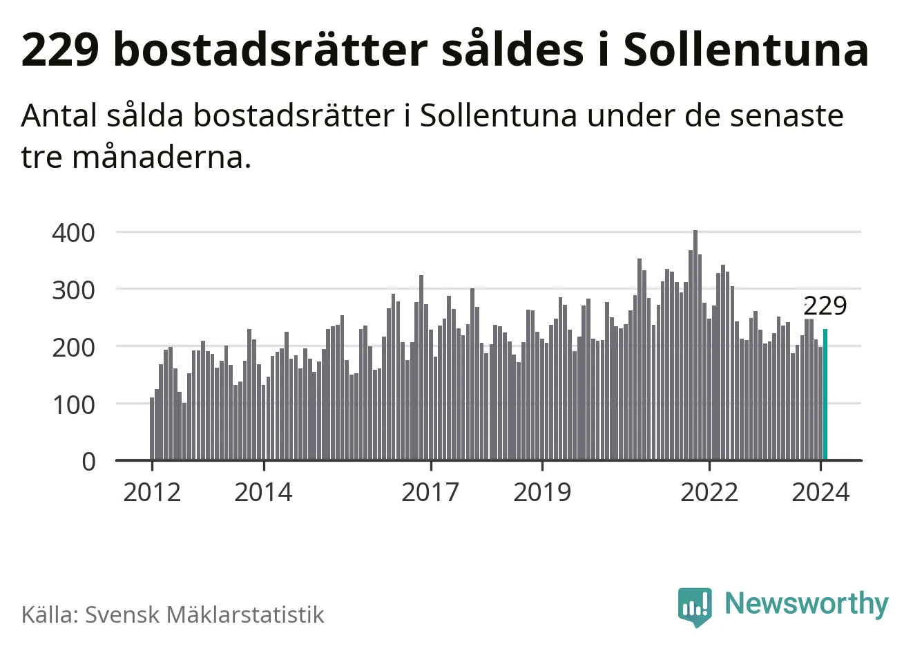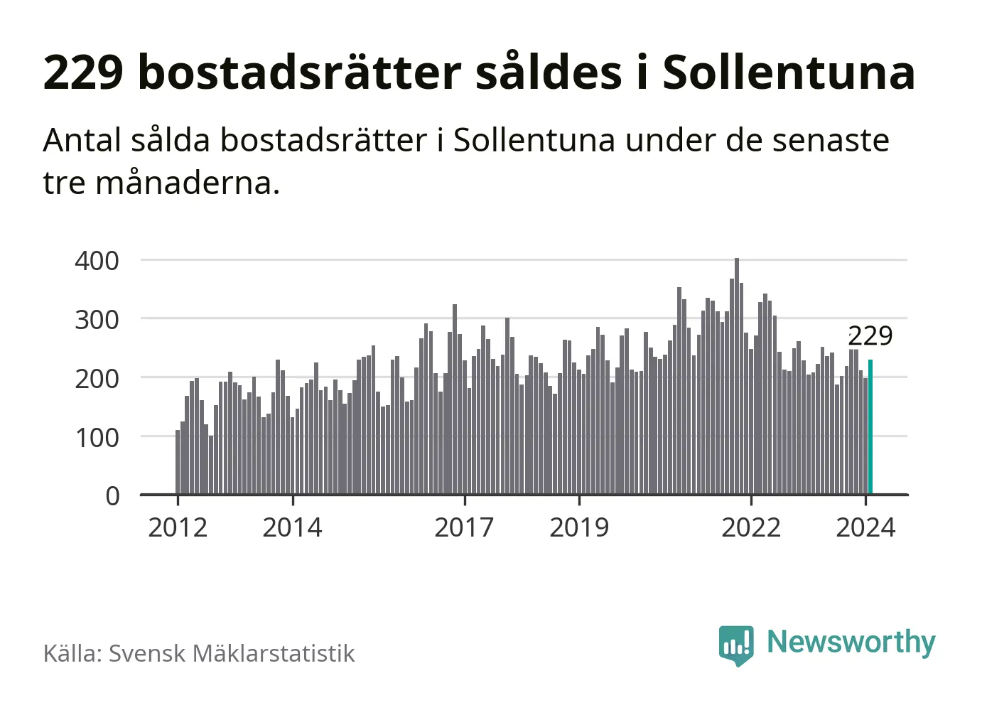 Sammanlagt såldes 229 bostadsrätter i Sollentuna kommun mellan december och februari till ett genomsnittligt pris på 3,0 miljoner kronor. I fjol gjordes 208 affärer vid den här tiden på året.
