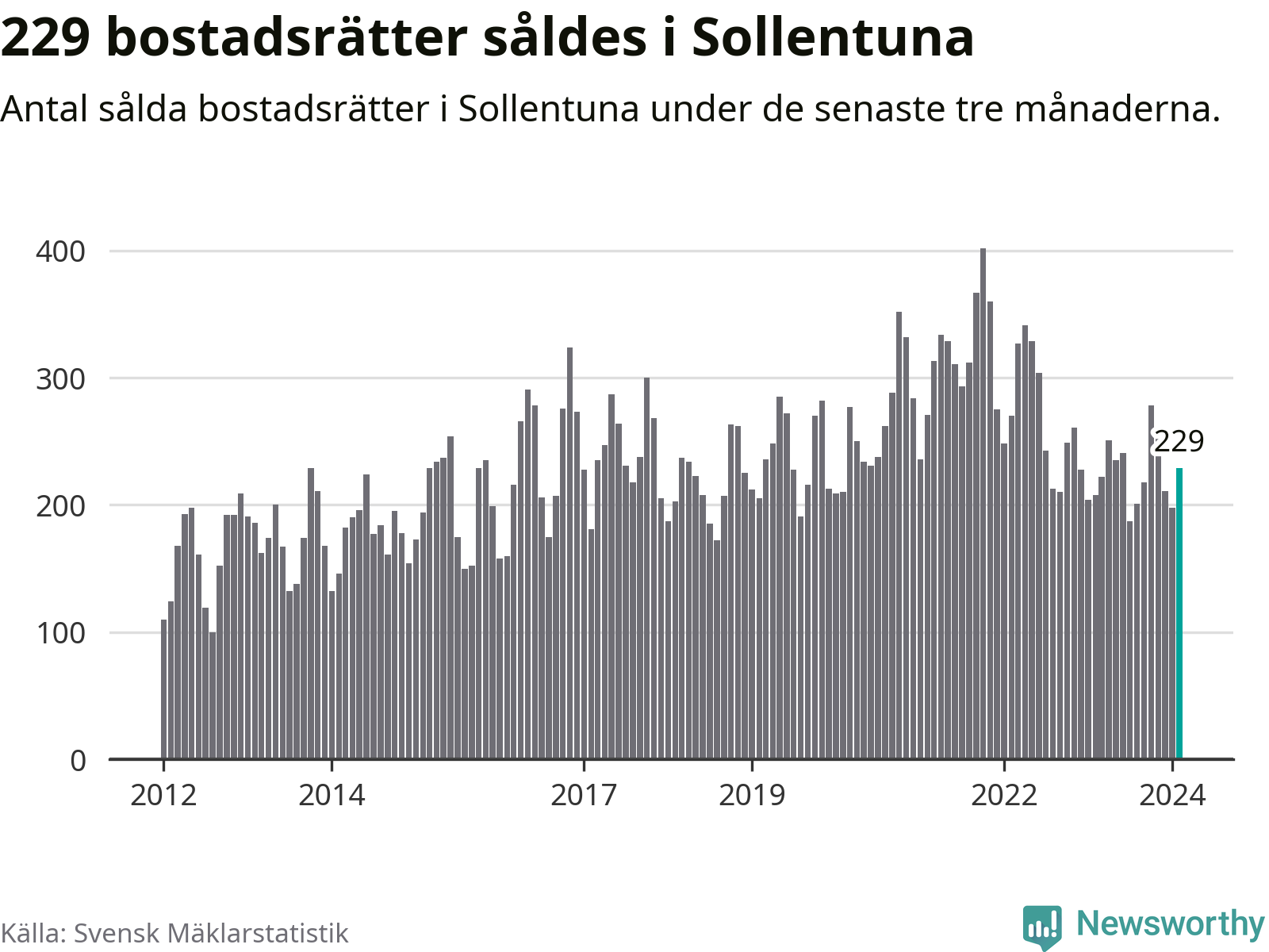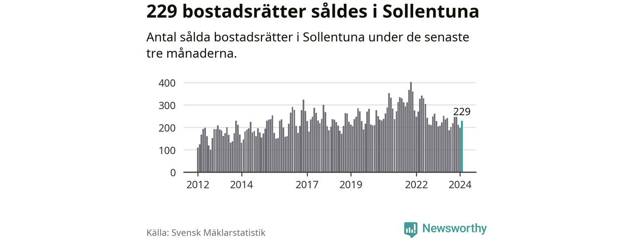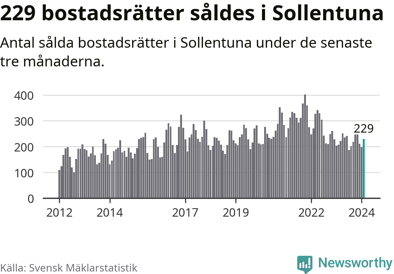 Sammanlagt såldes 229 bostadsrätter i Sollentuna kommun mellan december och februari till ett genomsnittligt pris på 3,0 miljoner kronor. I fjol gjordes 208 affärer vid den här tiden på året.