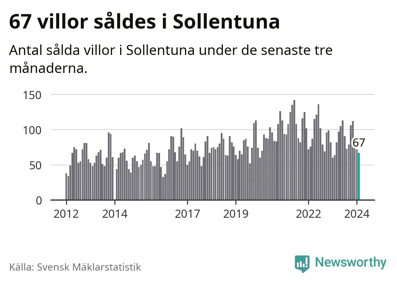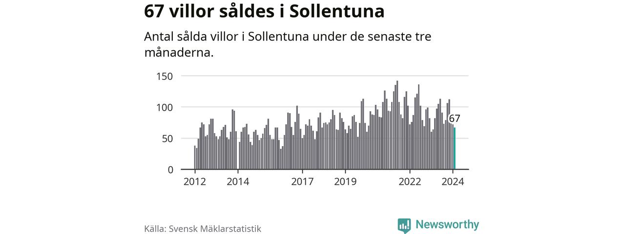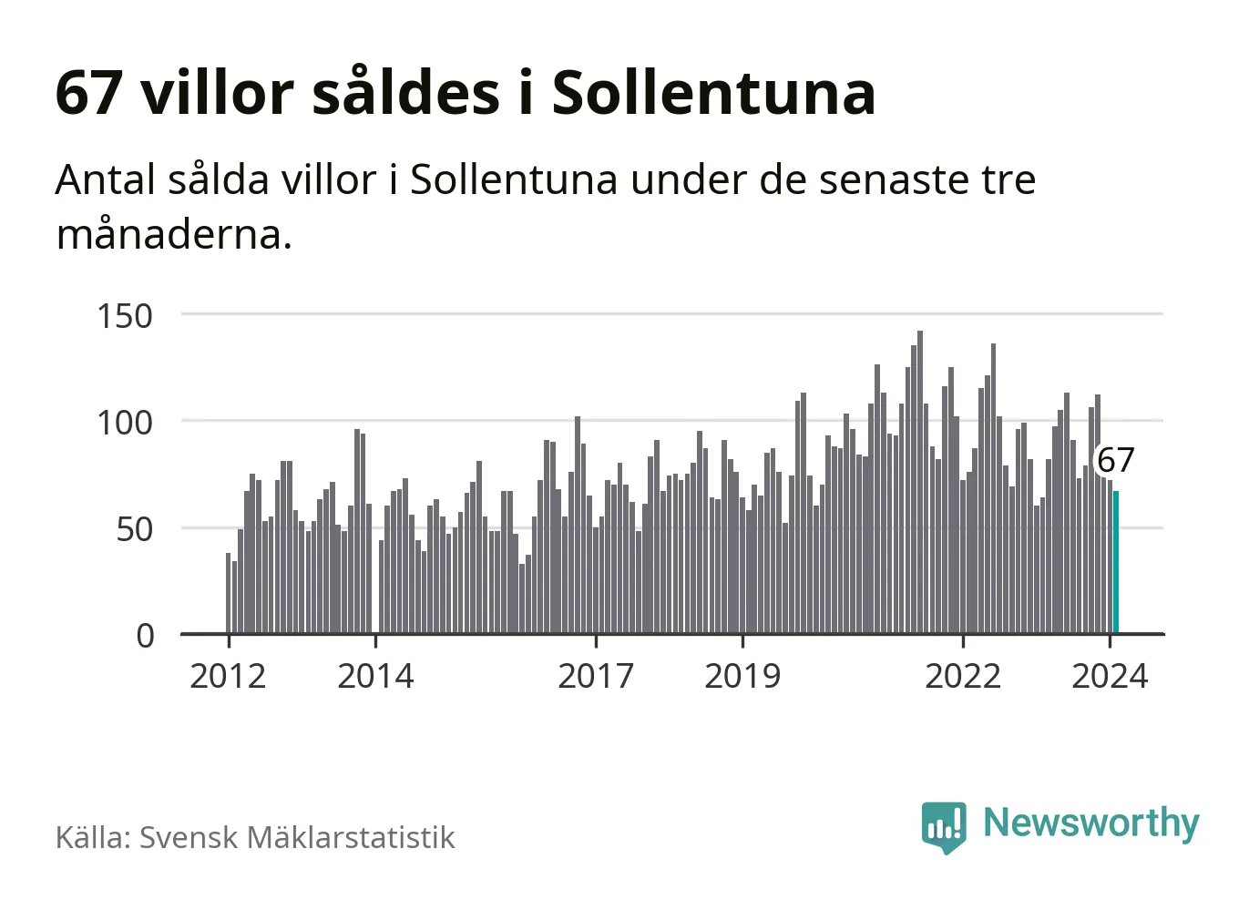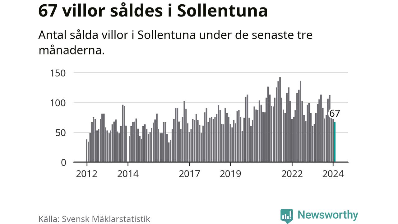 Sammanlagt såldes 67 villor i Sollentuna kommun mellan december och februari till ett genomsnittligt pris på 7,9 miljoner kronor. I fjol gjordes 64 affärer vid den här tiden på året.