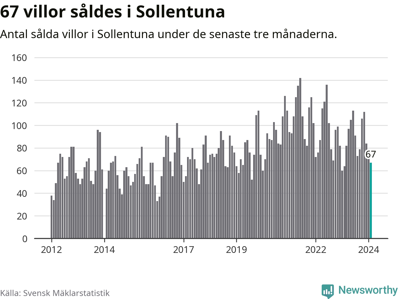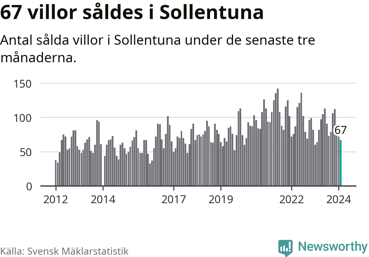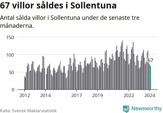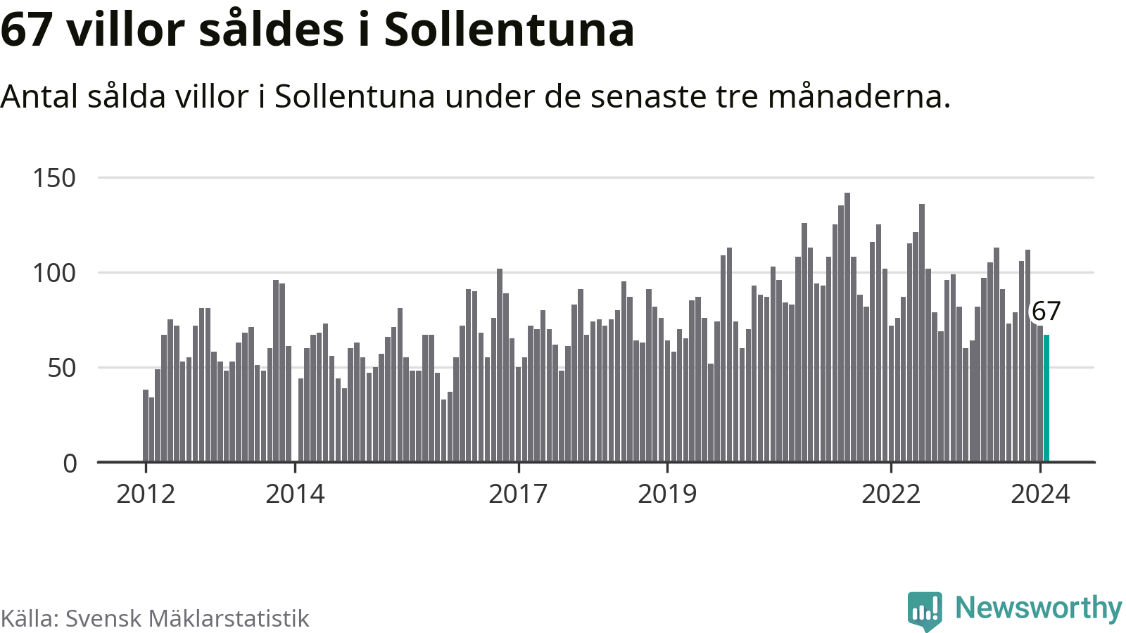 Sammanlagt såldes 67 villor i Sollentuna kommun mellan december och februari till ett genomsnittligt pris på 7,9 miljoner kronor. I fjol gjordes 64 affärer vid den här tiden på året.
