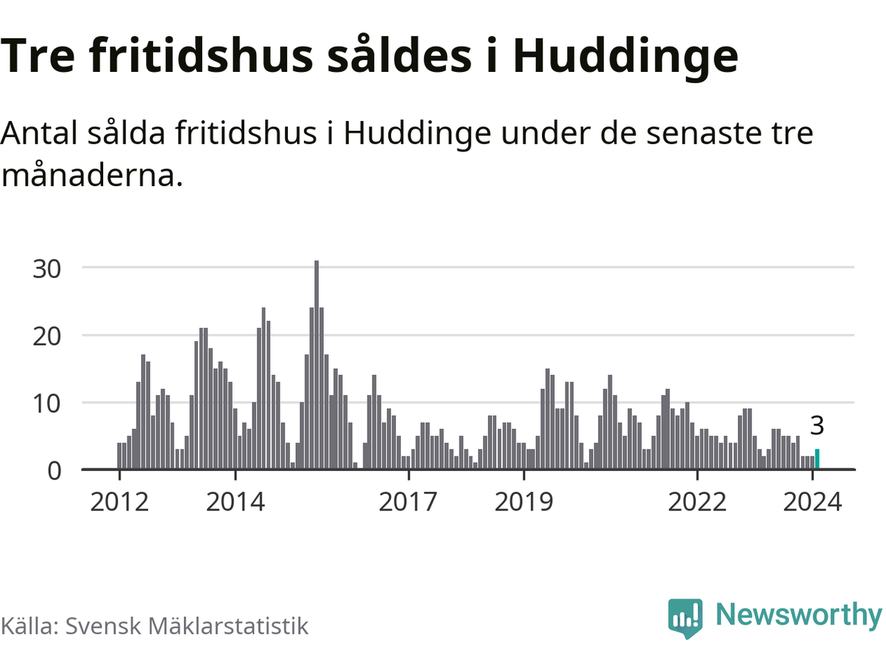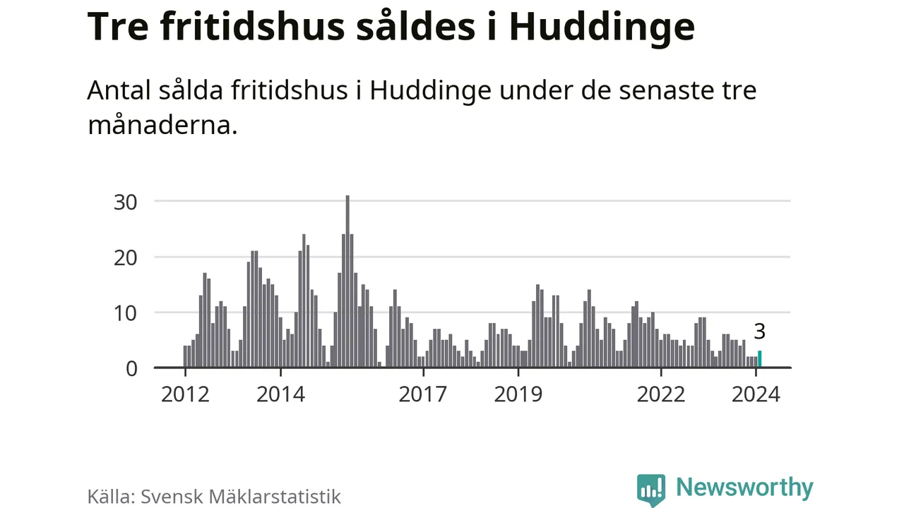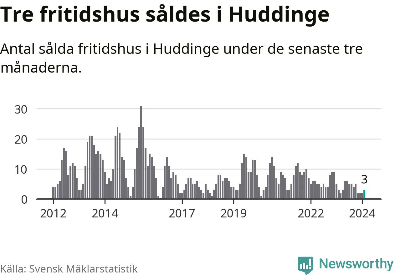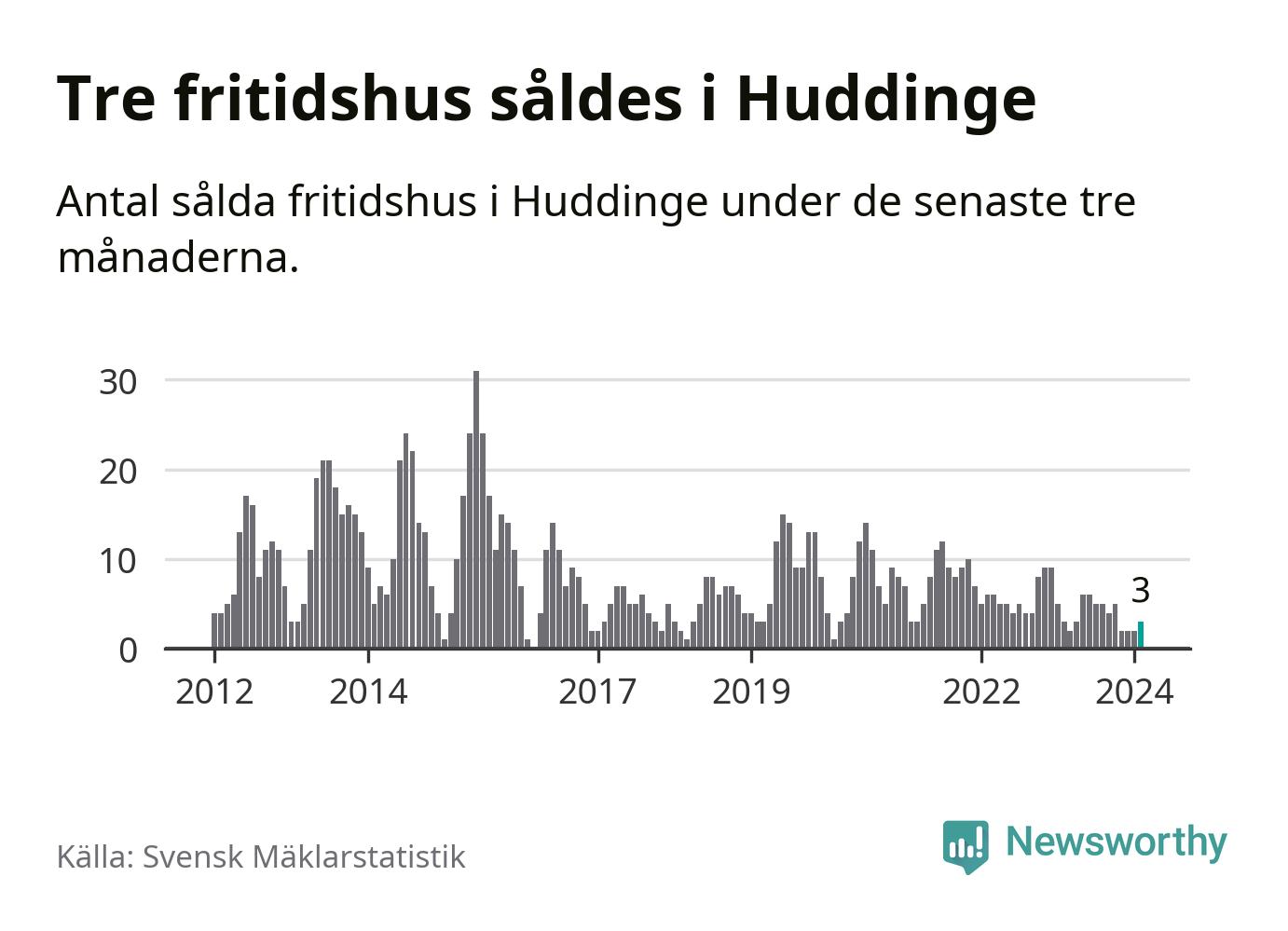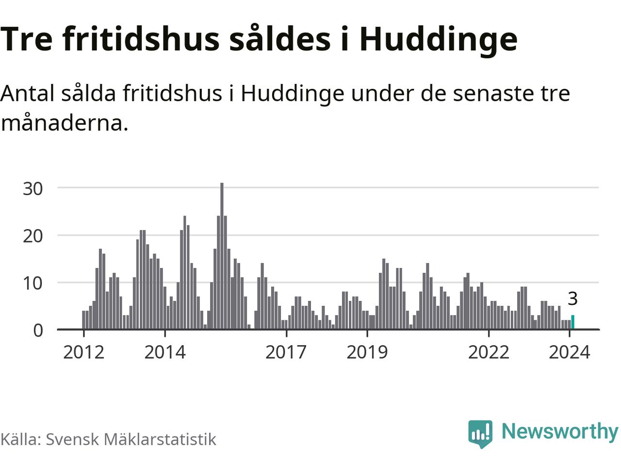 Mellan december och februari gjordes sammanlagt tre affärer med fritidshus i Huddinge kommun. Det är lika många affärer som vid motsvarande tid i fjol.