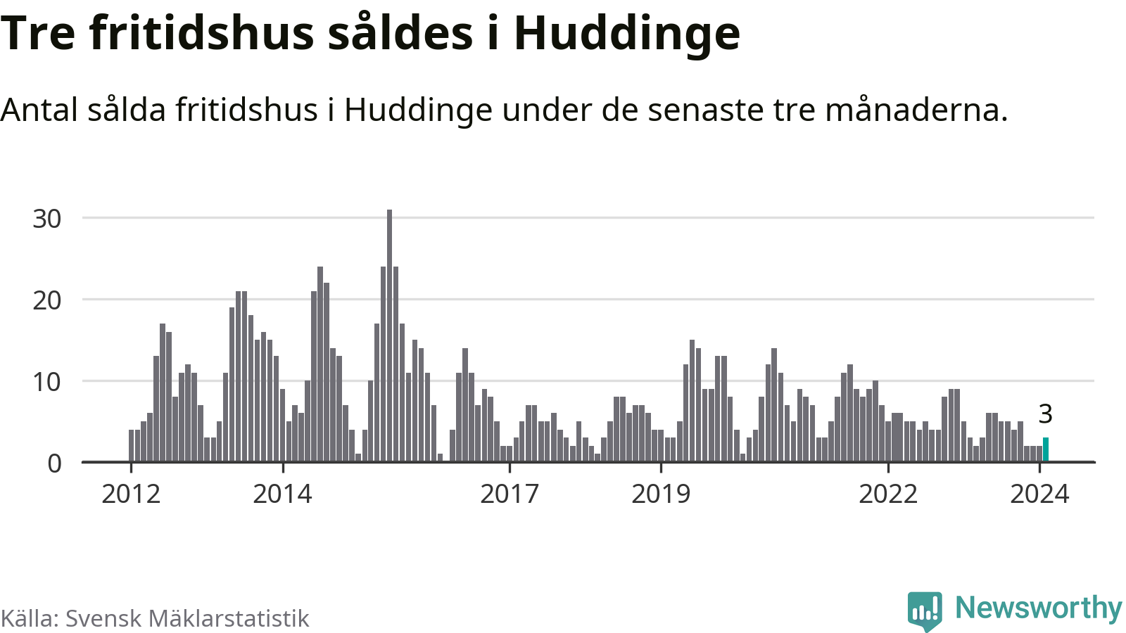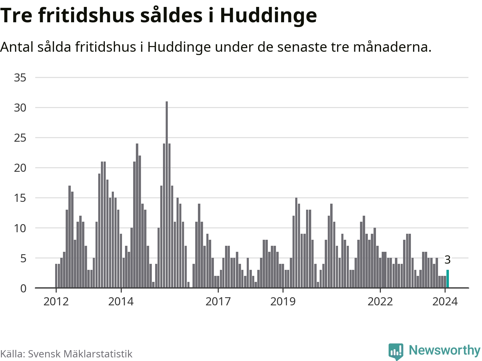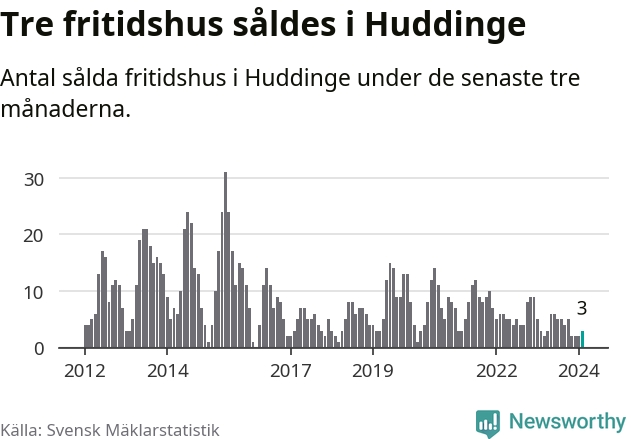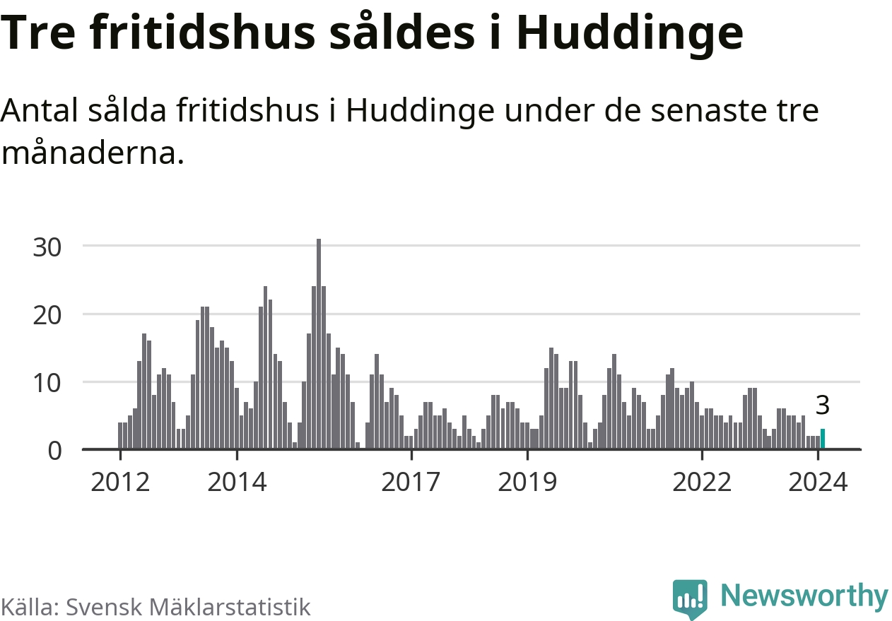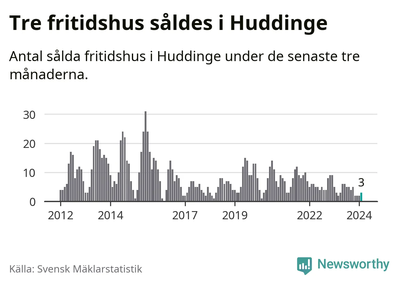 Mellan december och februari gjordes sammanlagt tre affärer med fritidshus i Huddinge kommun. Det är lika många affärer som vid motsvarande tid i fjol.