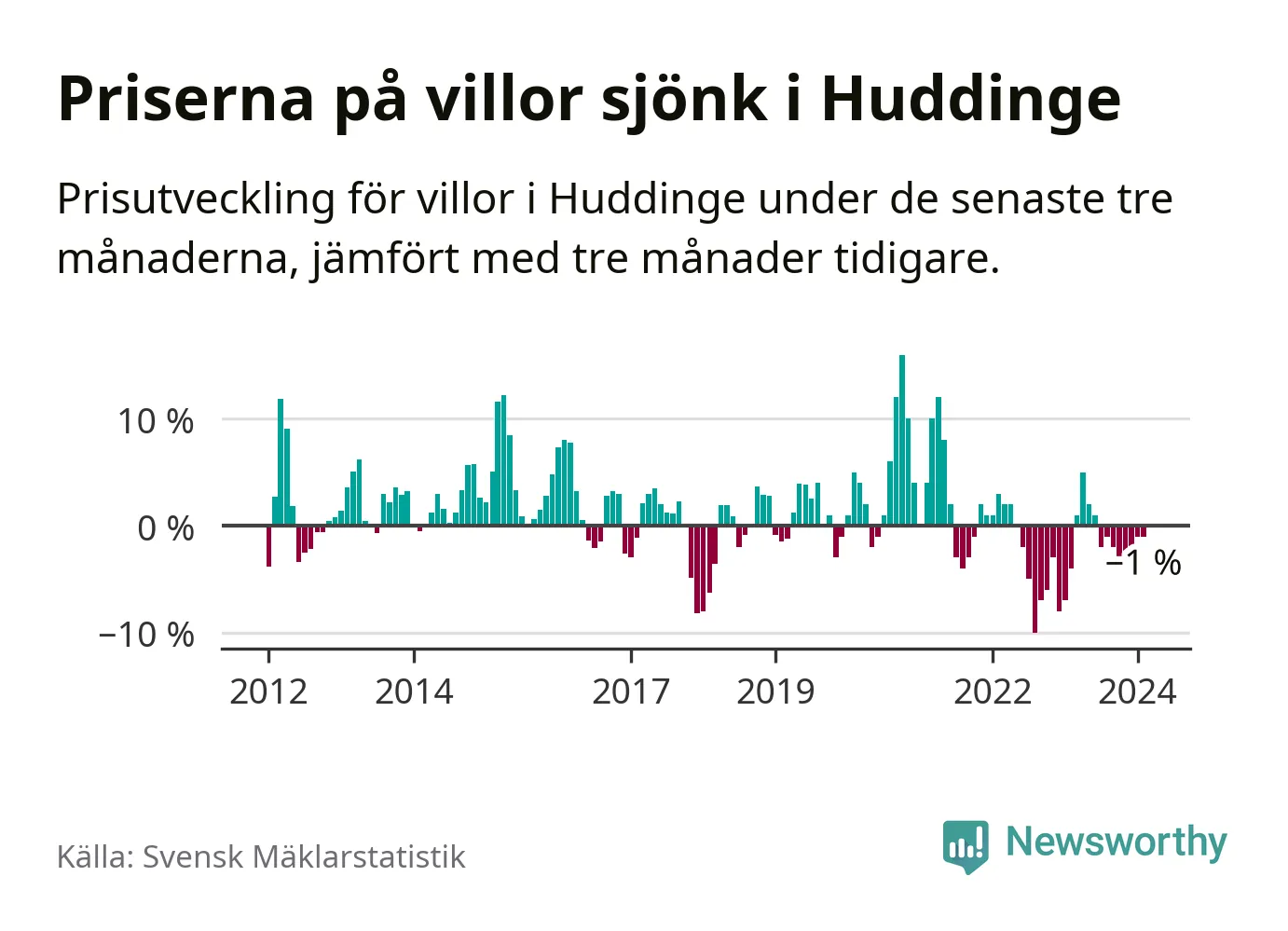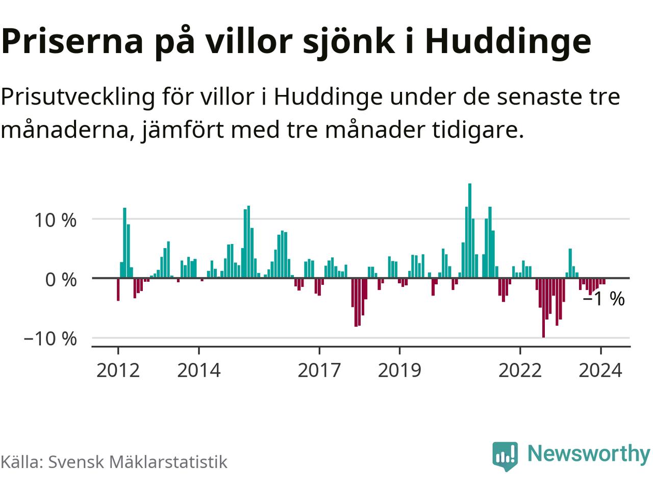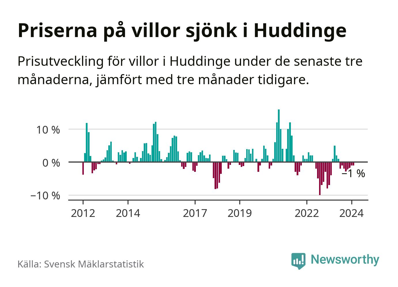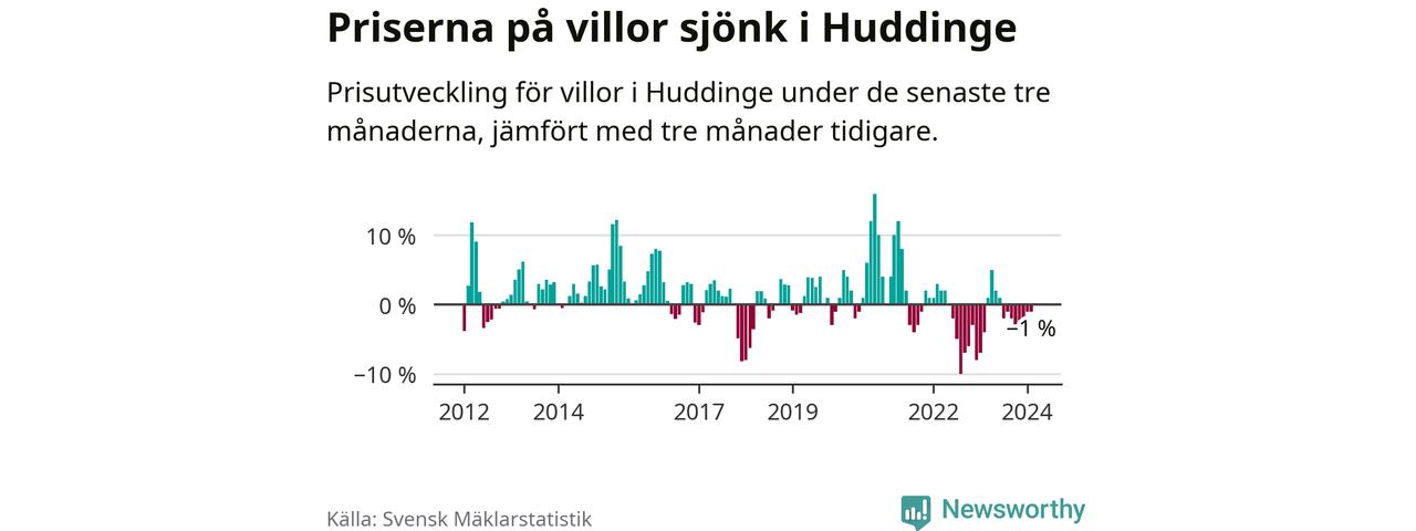 Statistiken visar även på en prisnedgång i Huddinge kommun. Medelpriset på försäljningarna av villor i kommunen var 1 procent lägre än för tre månader sedan. I hela Stockholms län däremot ligger villapriserna stilla.