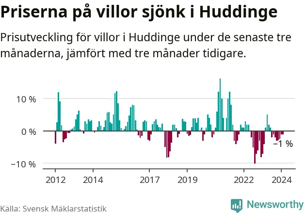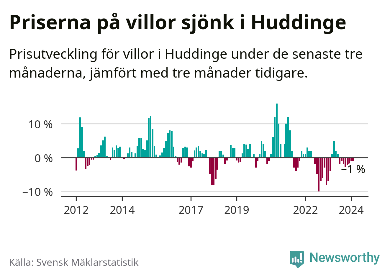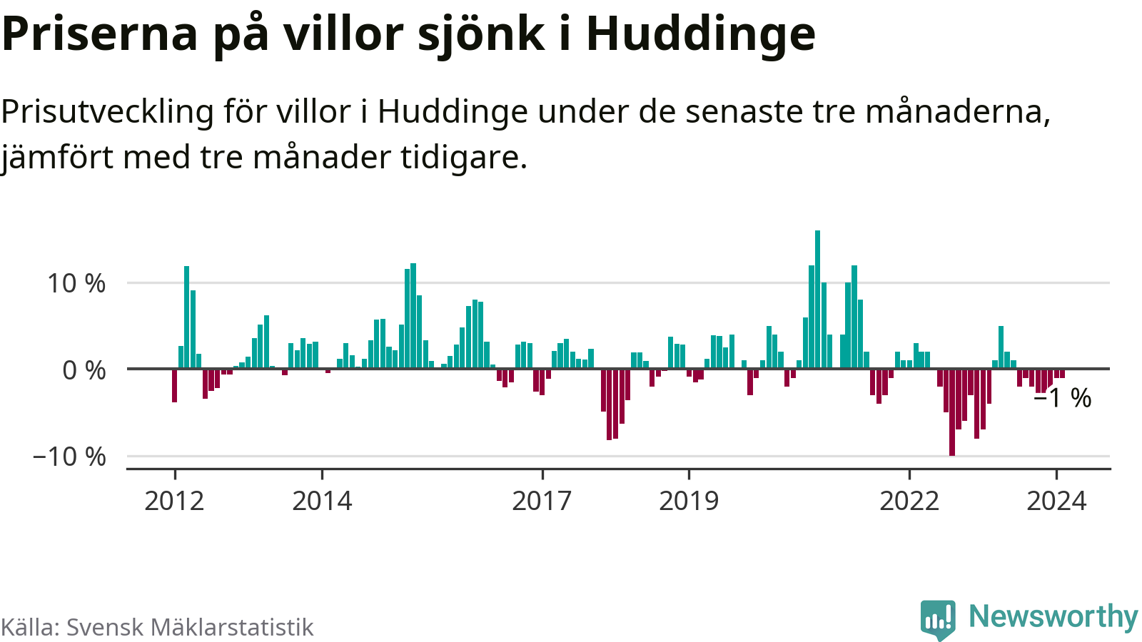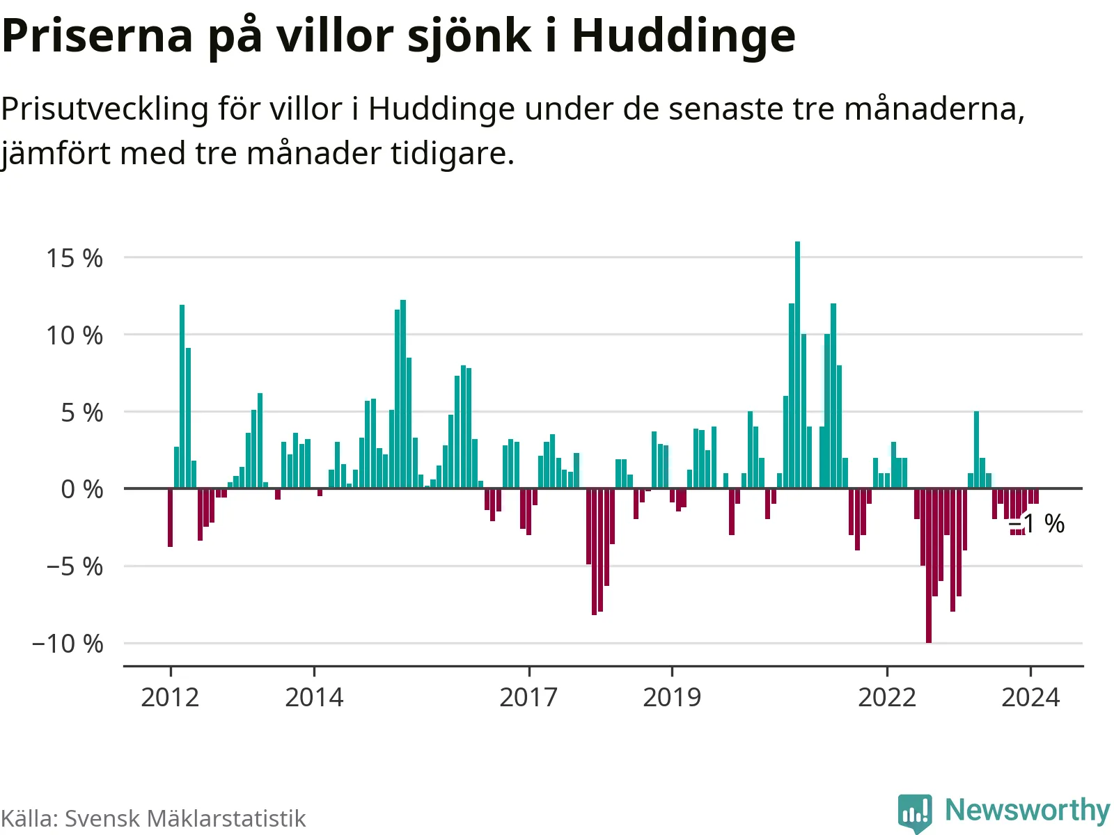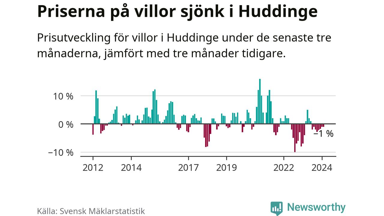 Statistiken visar även på en prisnedgång i Huddinge kommun. Medelpriset på försäljningarna av villor i kommunen var 1 procent lägre än för tre månader sedan. I hela Stockholms län däremot ligger villapriserna stilla.