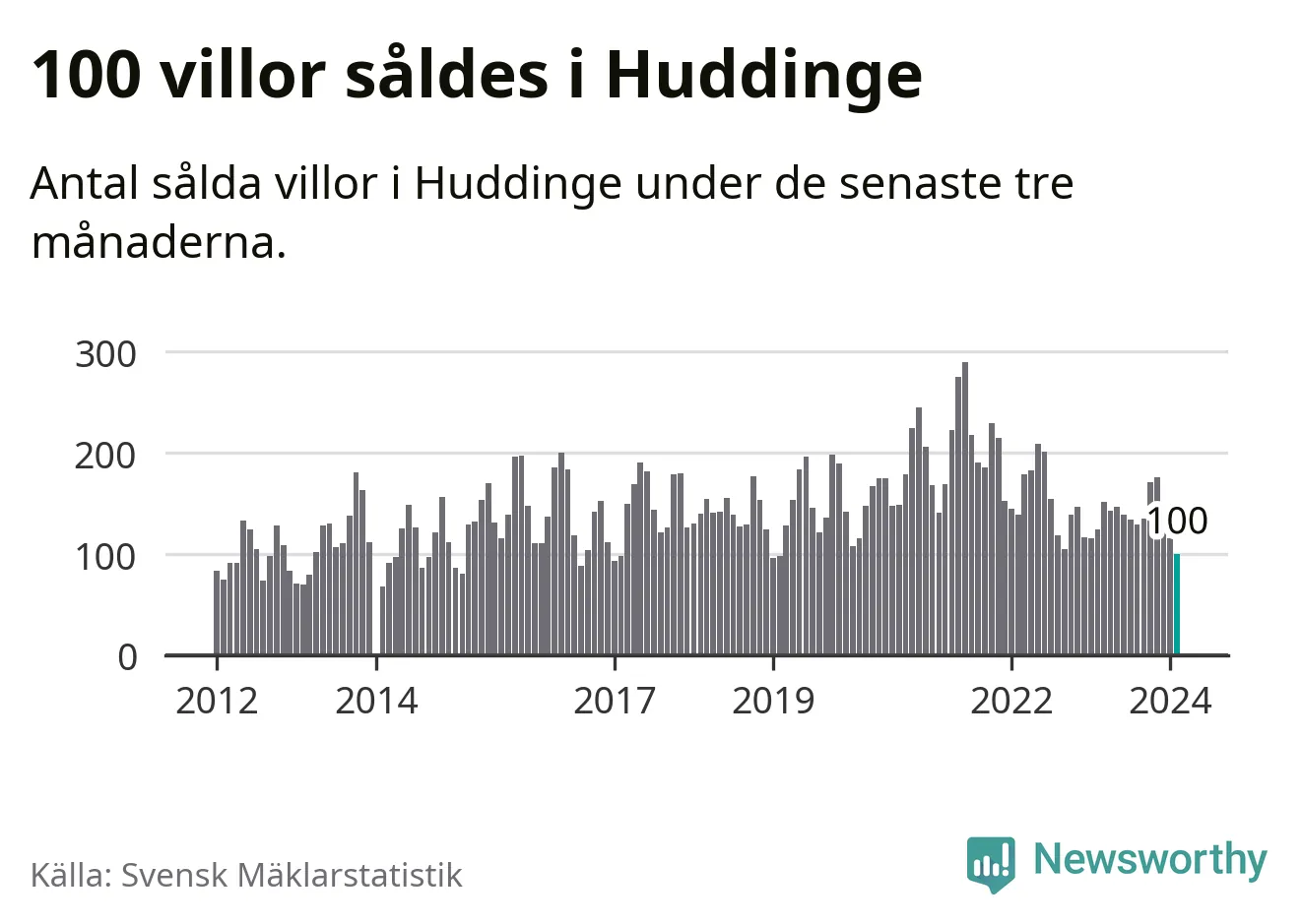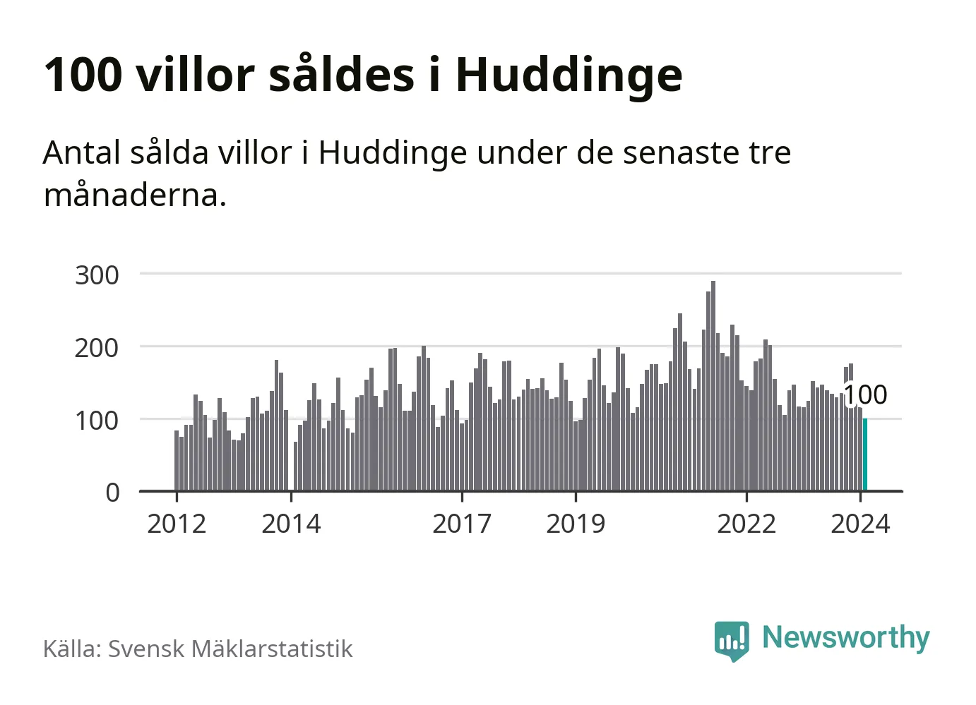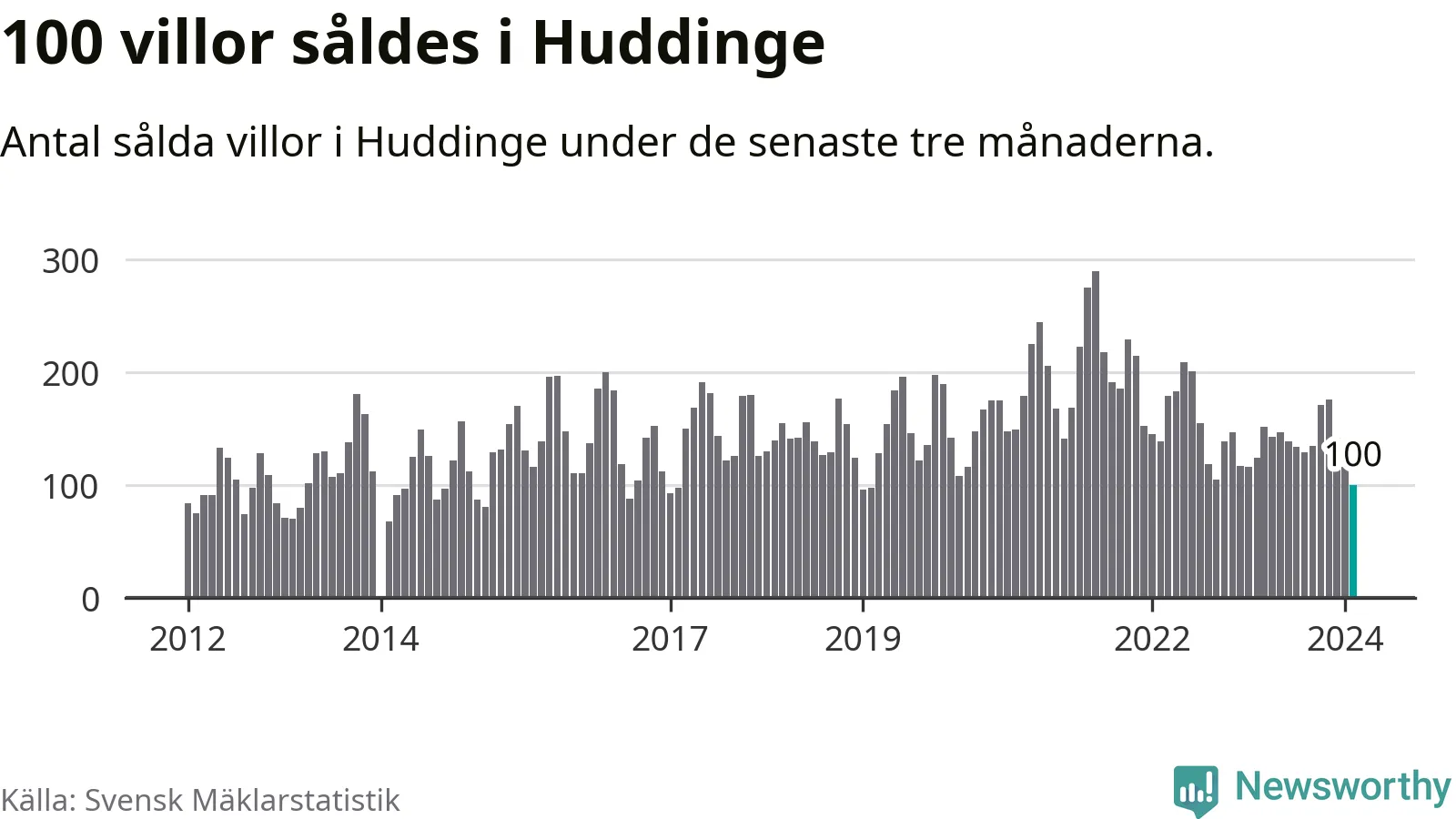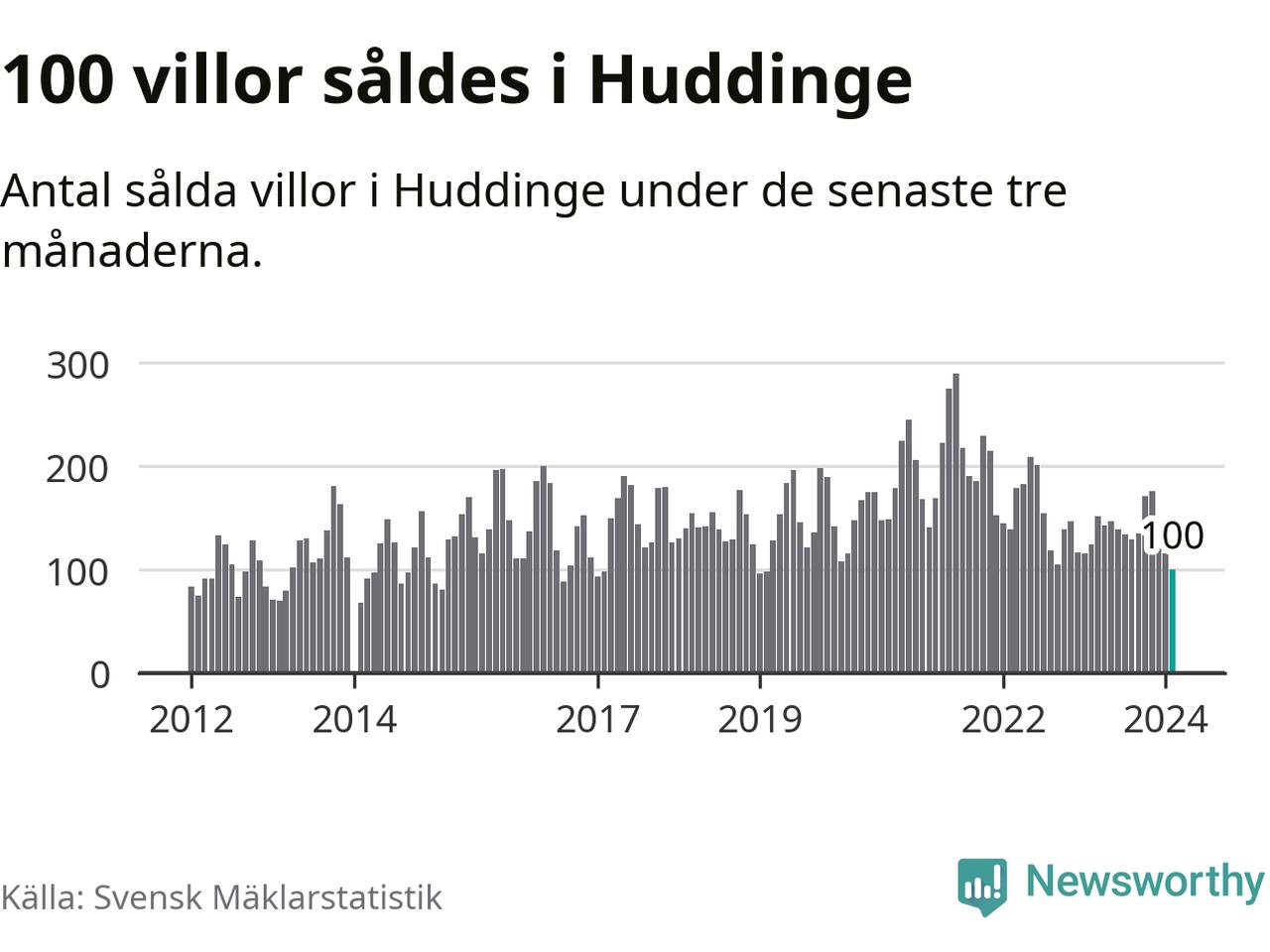 Mellan december och februari såldes 100 villor i Huddinge kommun. Det är färre än någon tremånadersperiod sedan 2019.