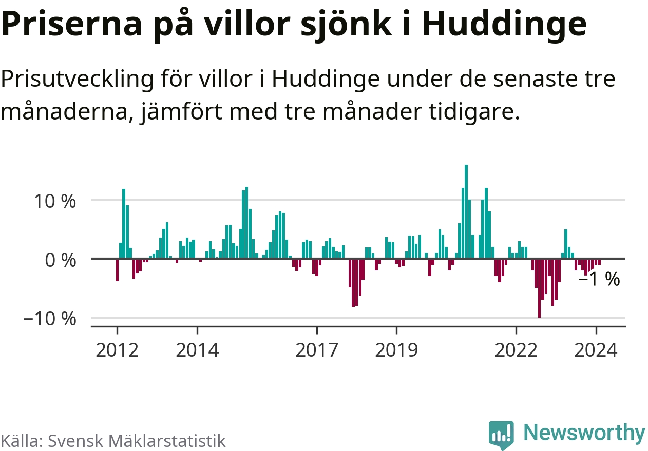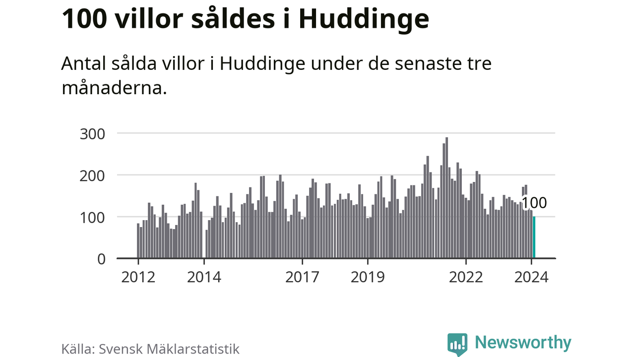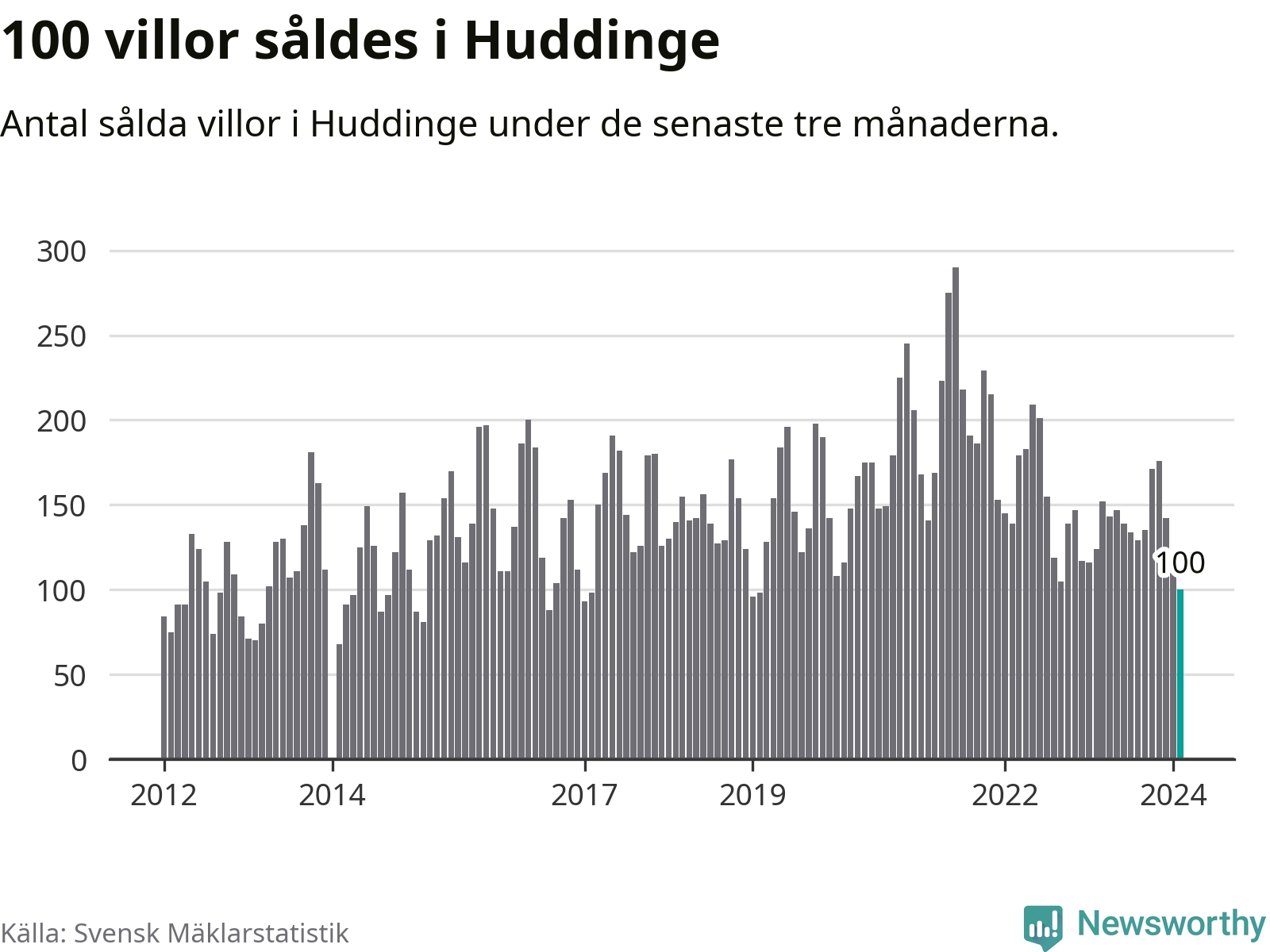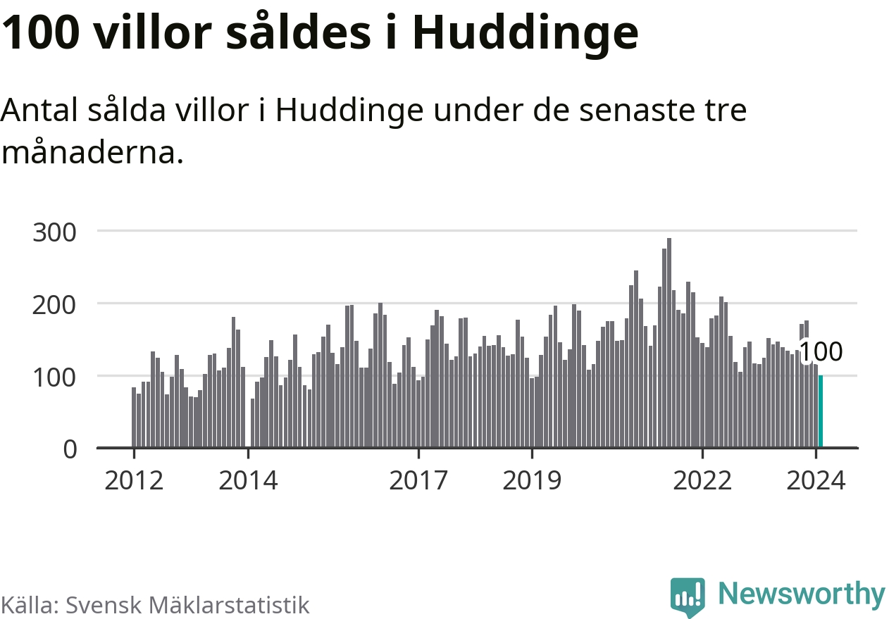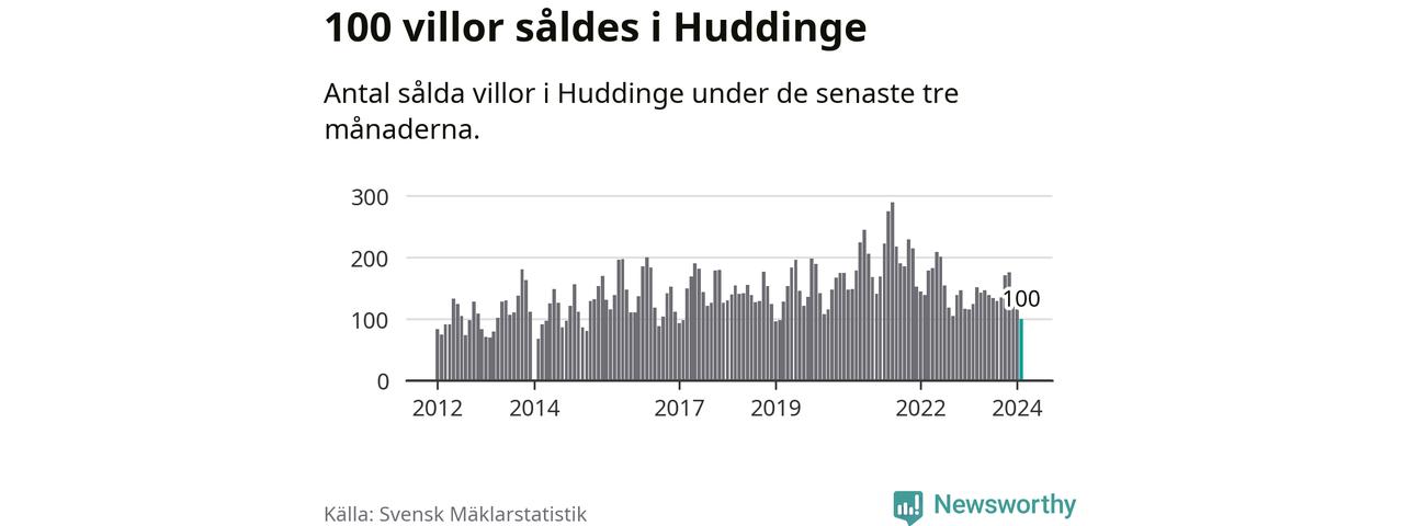 Mellan december och februari såldes 100 villor i Huddinge kommun. Det är färre än någon tremånadersperiod sedan 2019.
