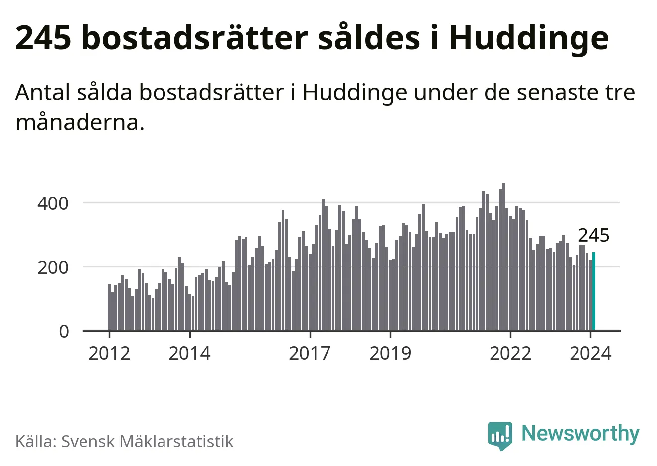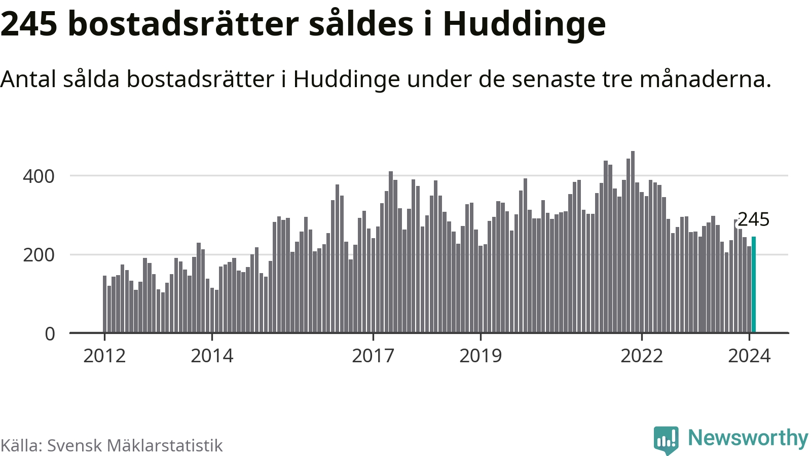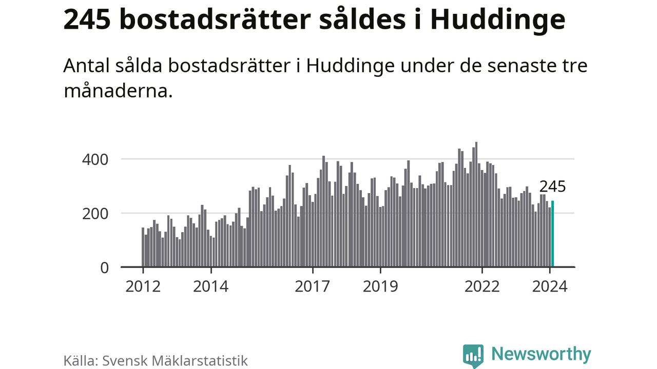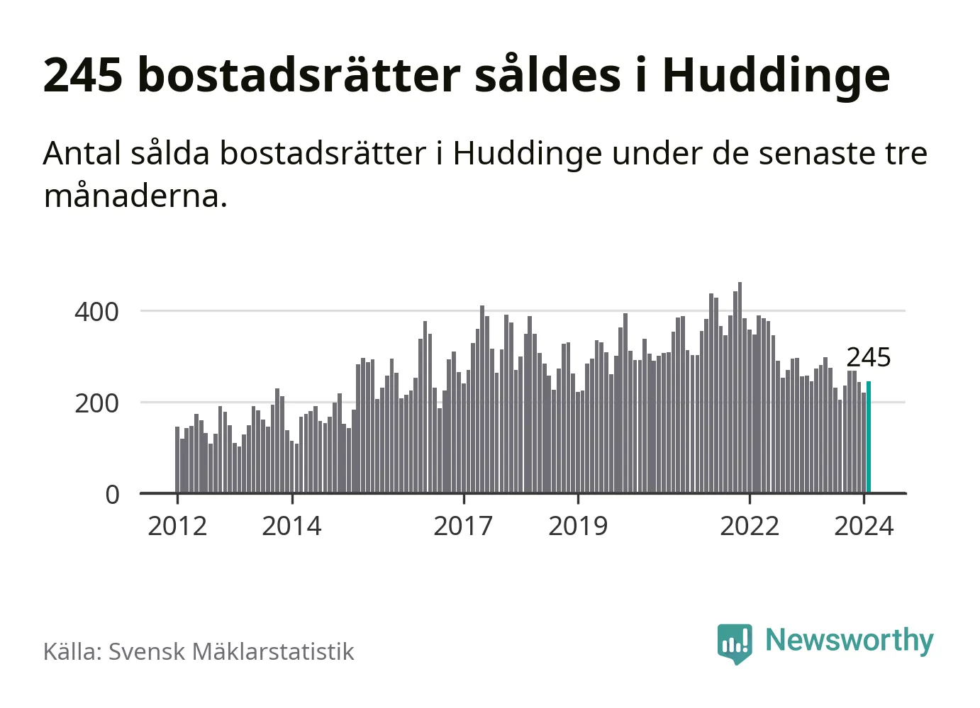 Sammanlagt såldes 245 bostadsrätter i Huddinge kommun mellan december och februari till ett genomsnittligt pris på 2,7 miljoner kronor. I fjol gjordes 245 affärer vid den här tiden på året.