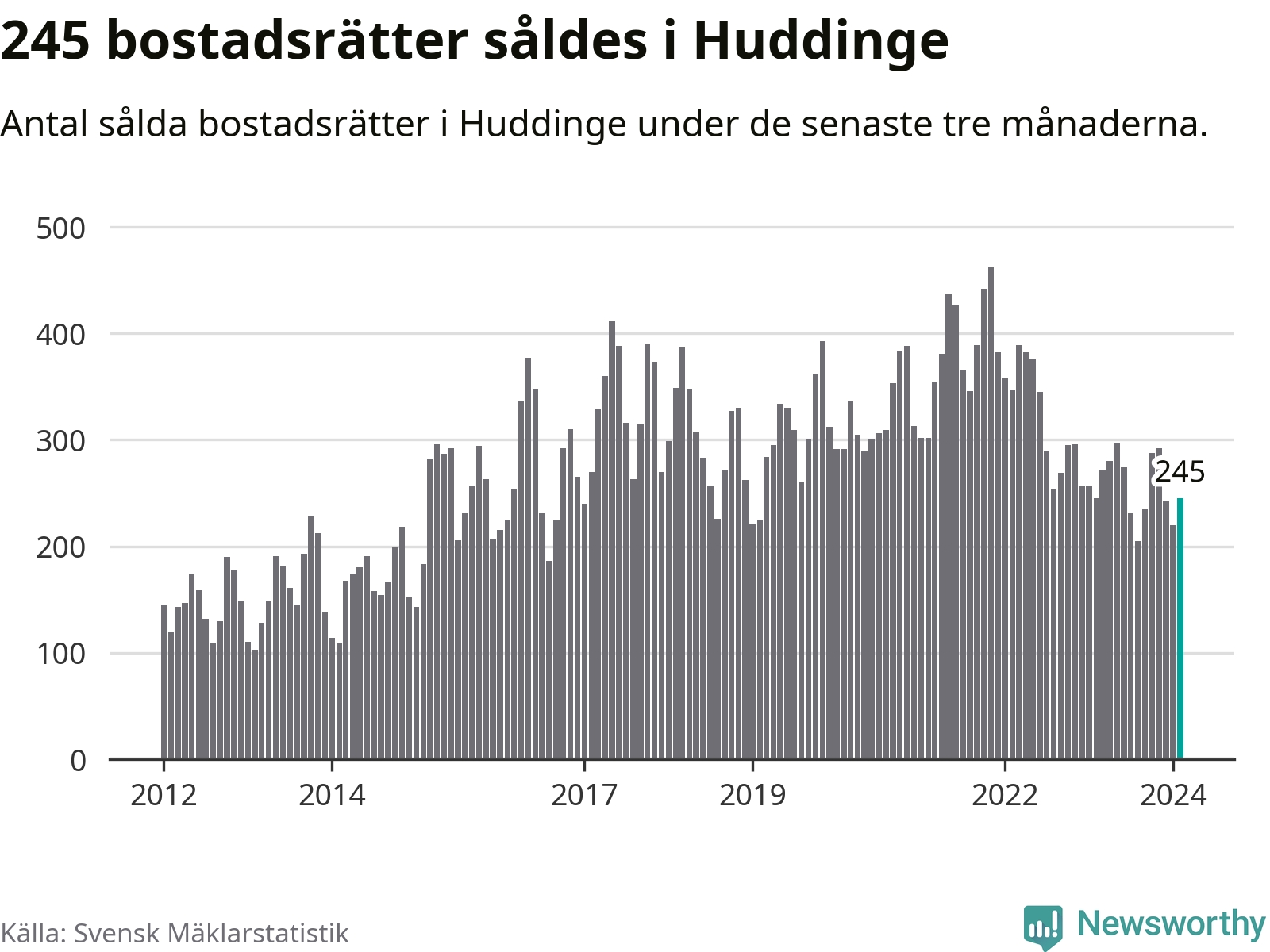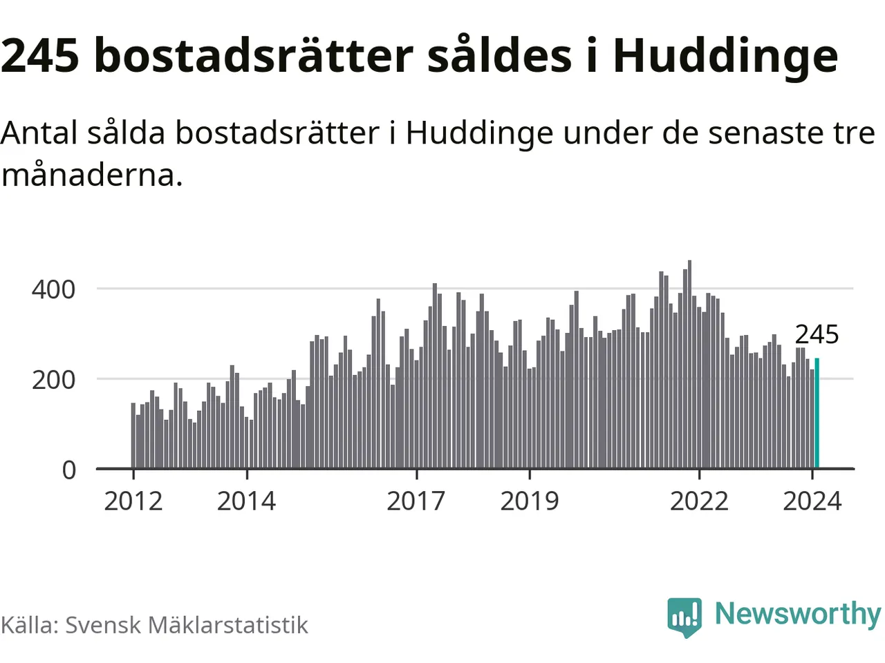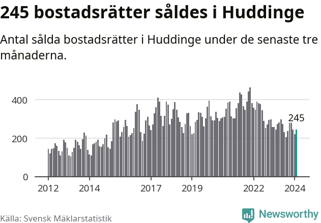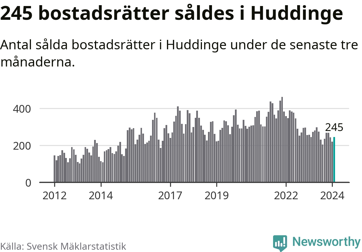 Sammanlagt såldes 245 bostadsrätter i Huddinge kommun mellan december och februari till ett genomsnittligt pris på 2,7 miljoner kronor. I fjol gjordes 245 affärer vid den här tiden på året.
