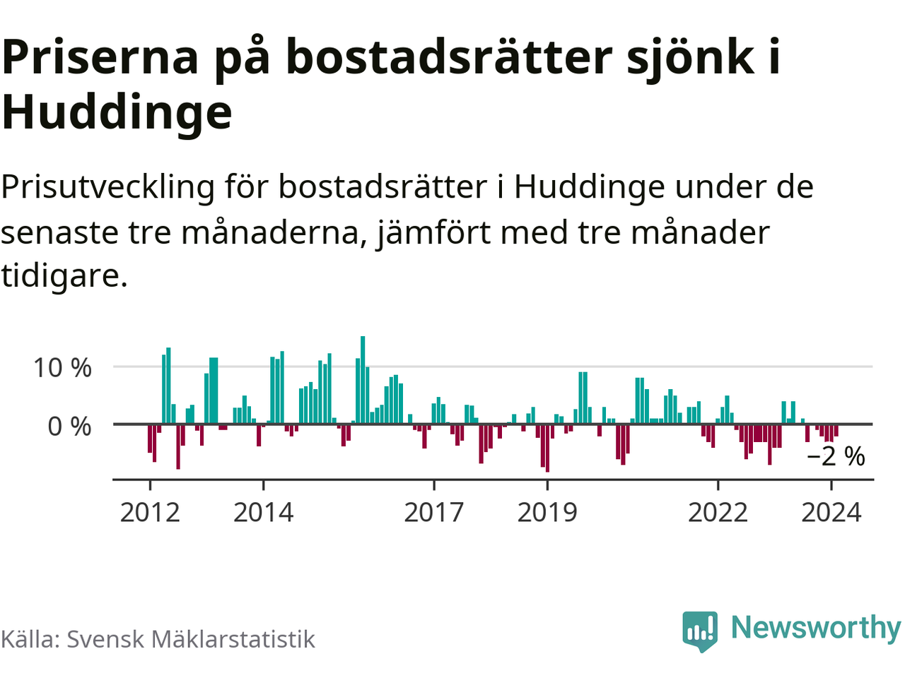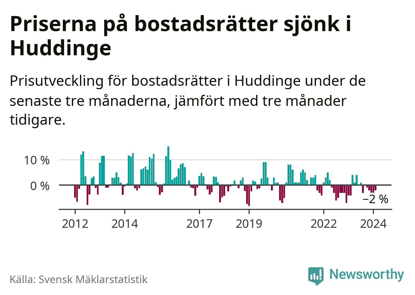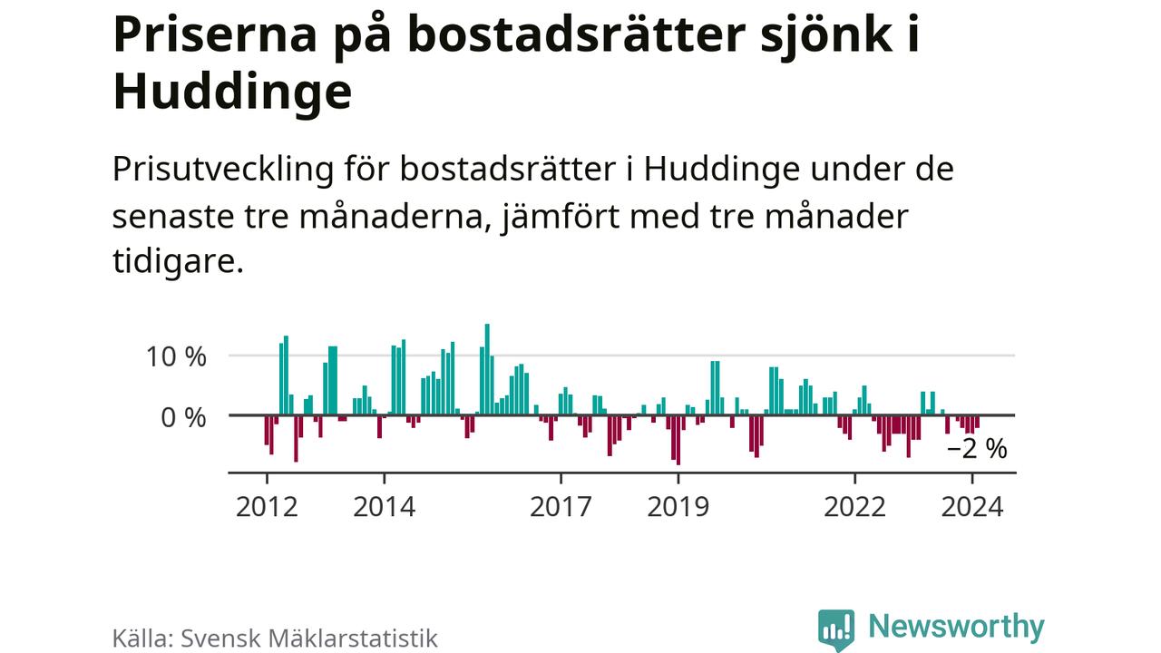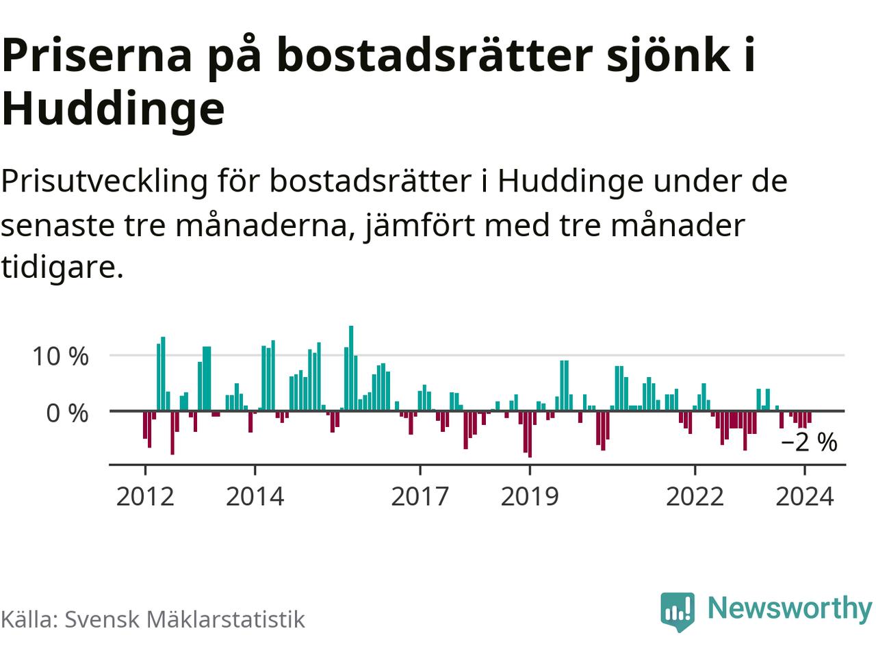 Priserna på bostadsrätter har gått ner i Huddinge kommun. Medelpriset på försäljningarna under de senaste tre månaderna visar på en nedgång med 2 procent.