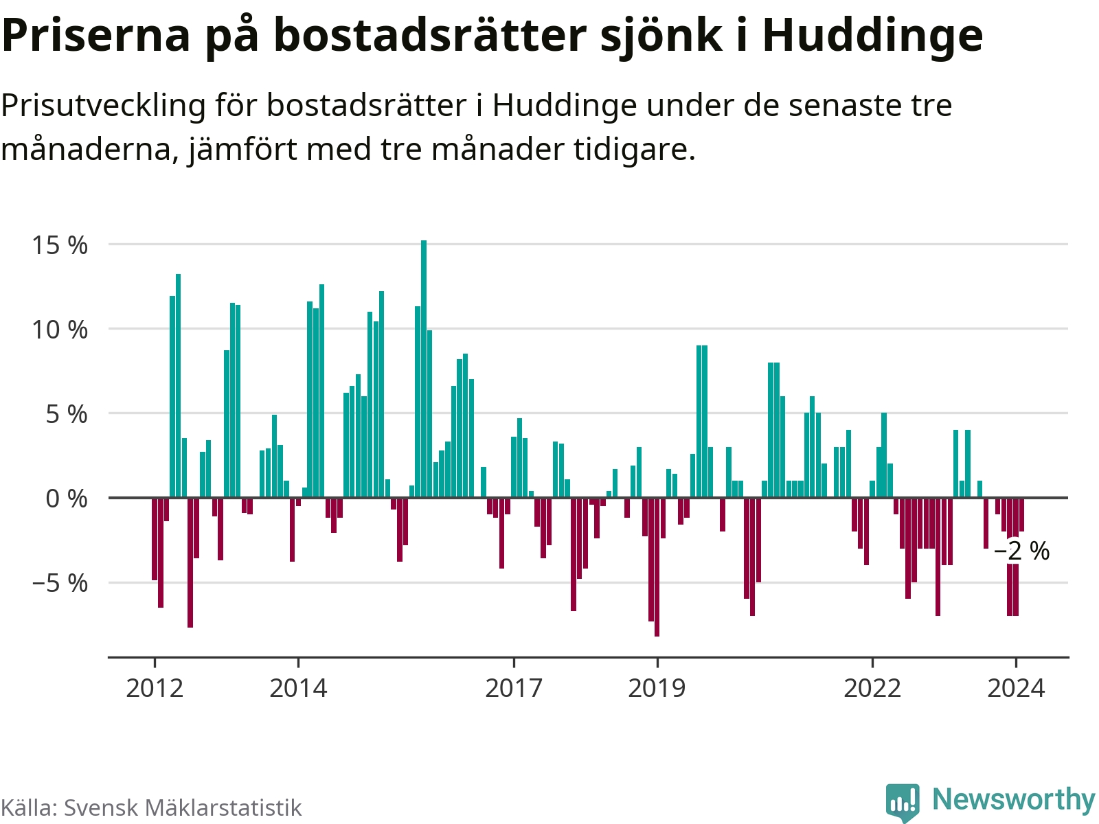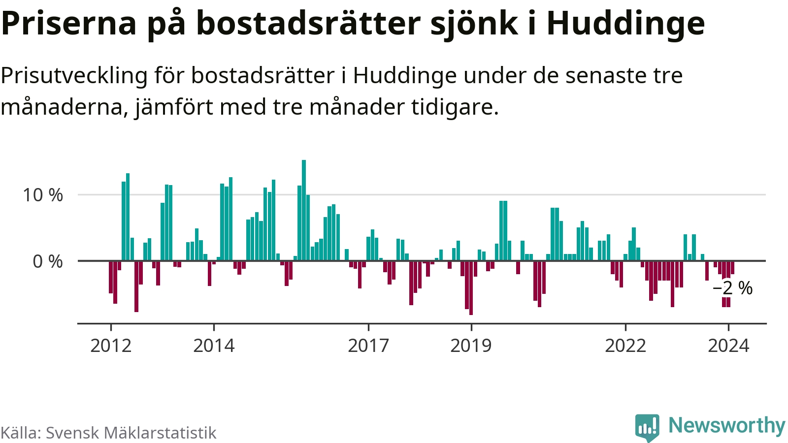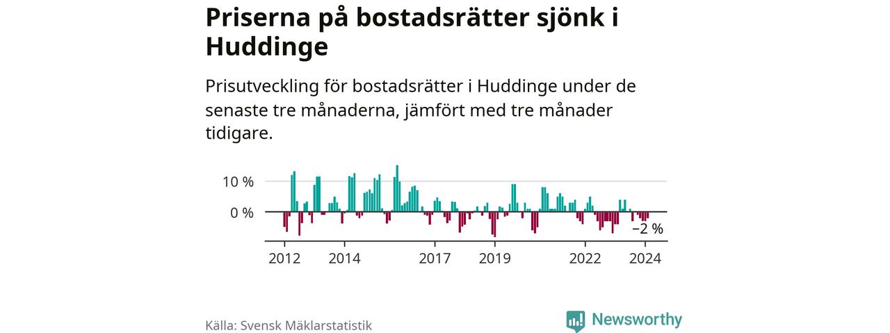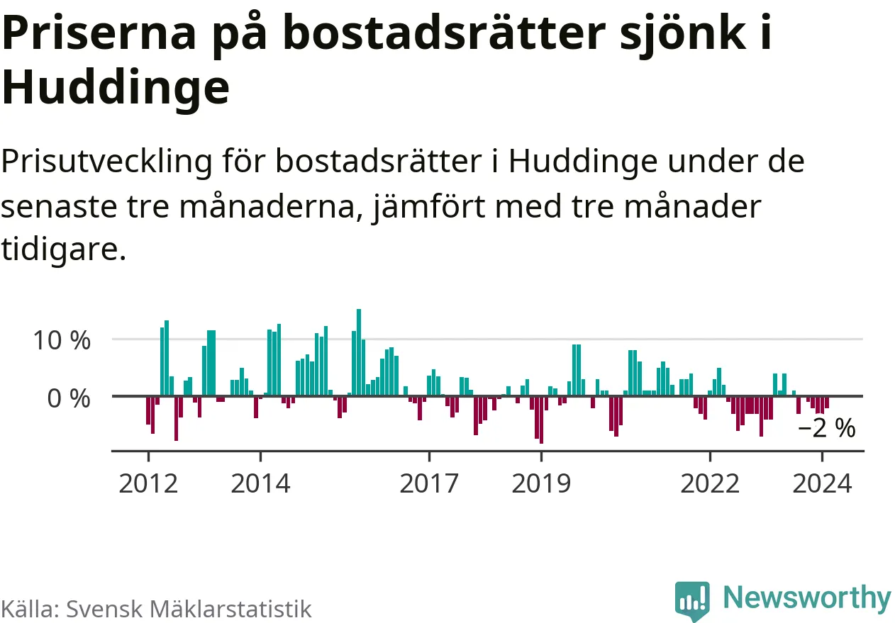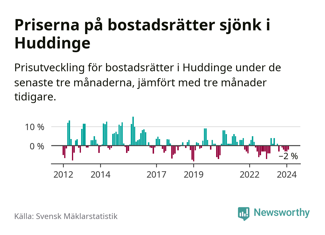 Priserna på bostadsrätter har gått ner i Huddinge kommun. Medelpriset på försäljningarna under de senaste tre månaderna visar på en nedgång med 2 procent.
