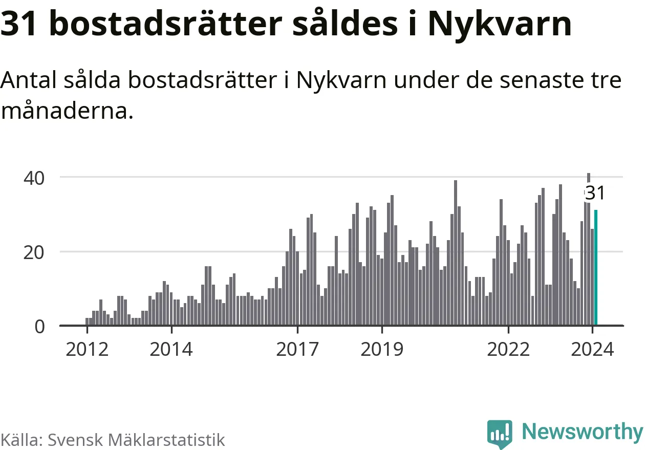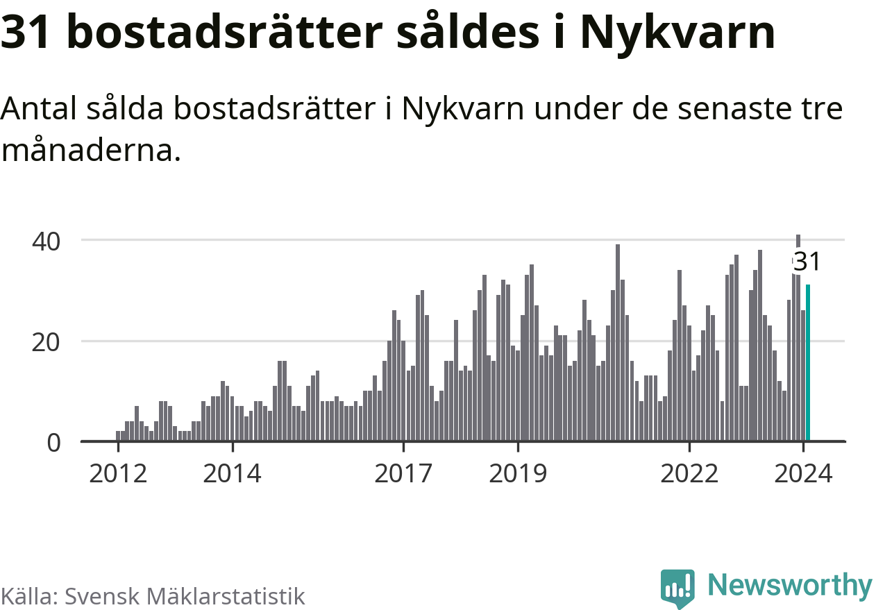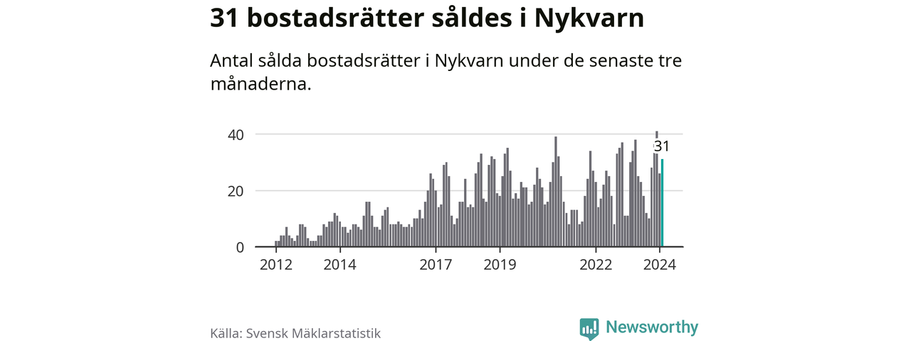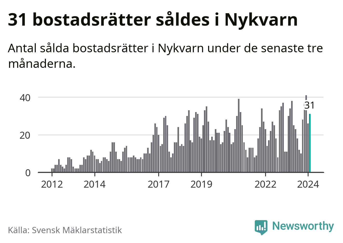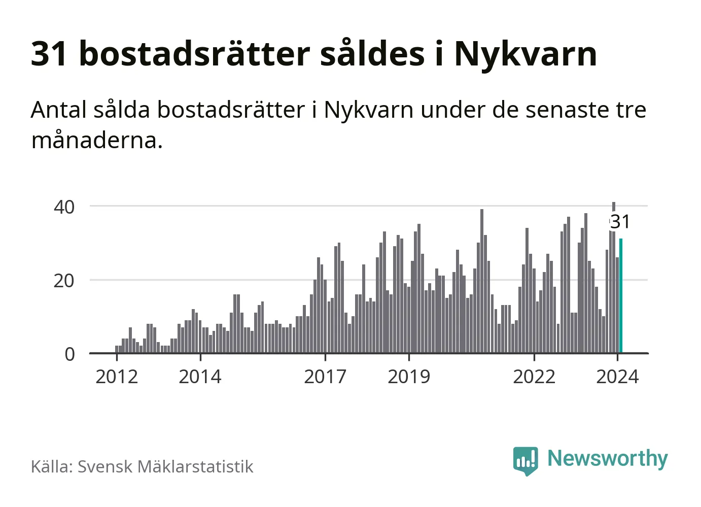 Mellan december och februari gjordes sammanlagt 31 affärer med bostadsrätter i Nykvarns kommun. Det kan jämföras med 30 vid motsvarande tid i fjol.