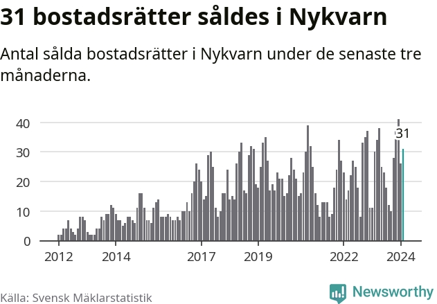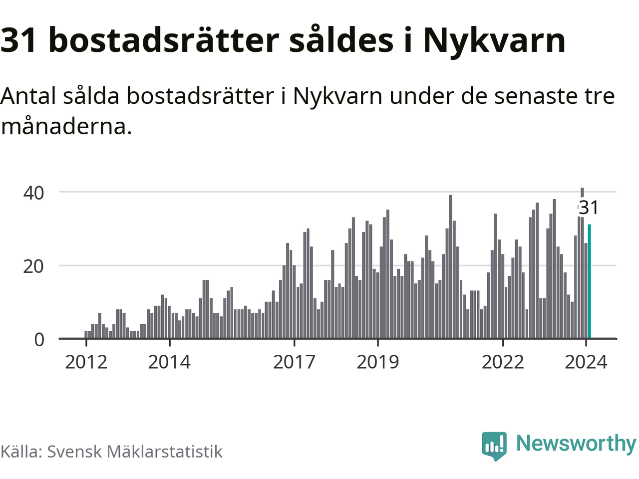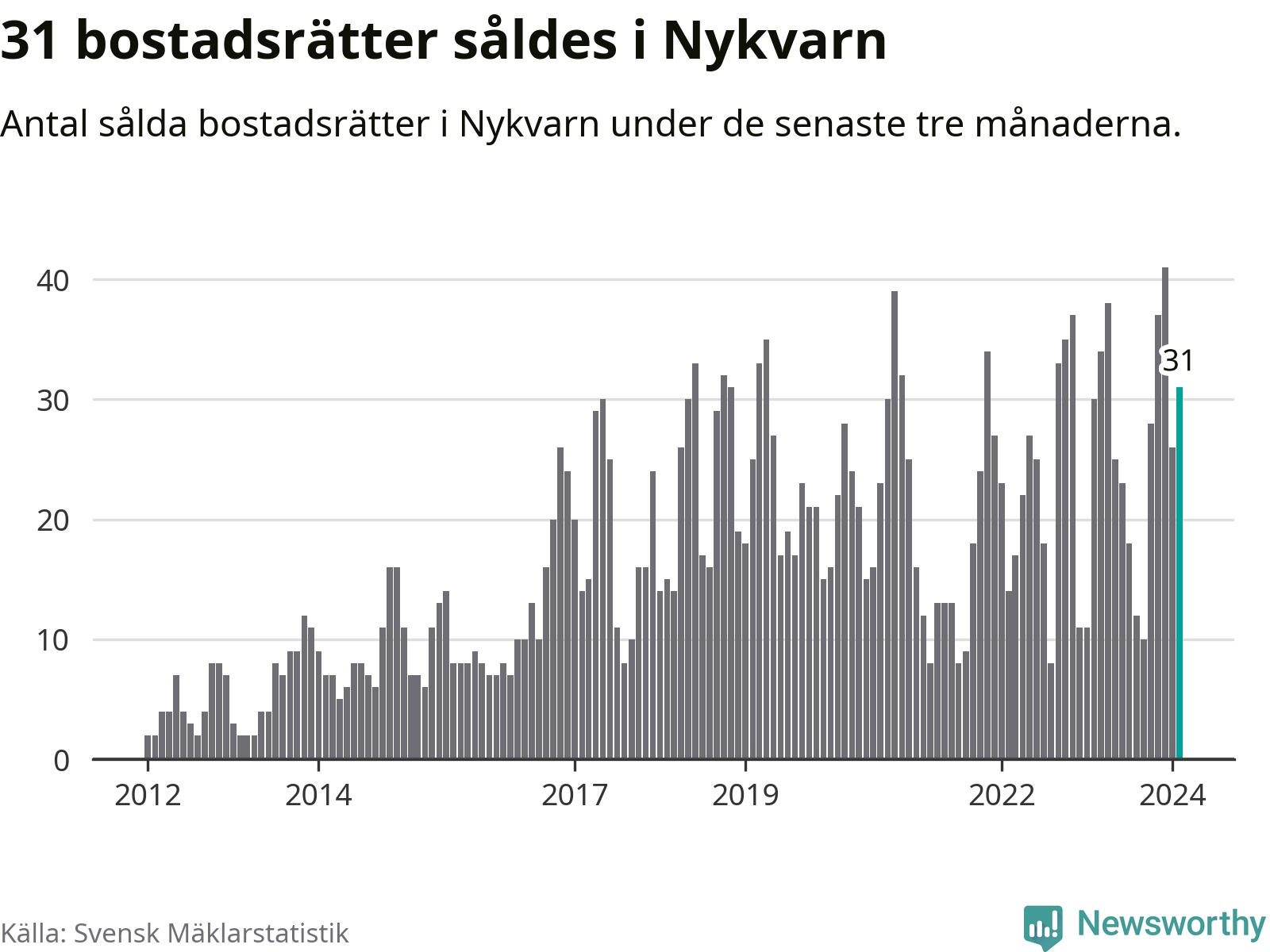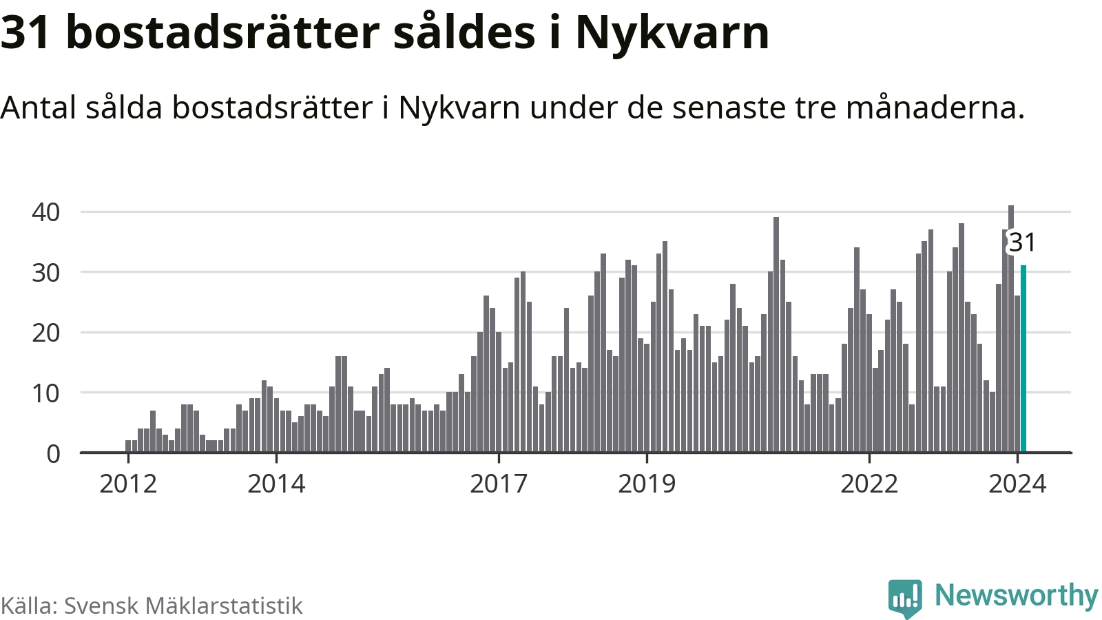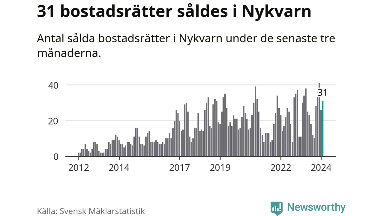 Mellan december och februari gjordes sammanlagt 31 affärer med bostadsrätter i Nykvarns kommun. Det kan jämföras med 30 vid motsvarande tid i fjol.