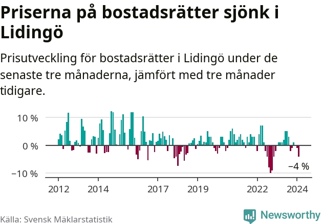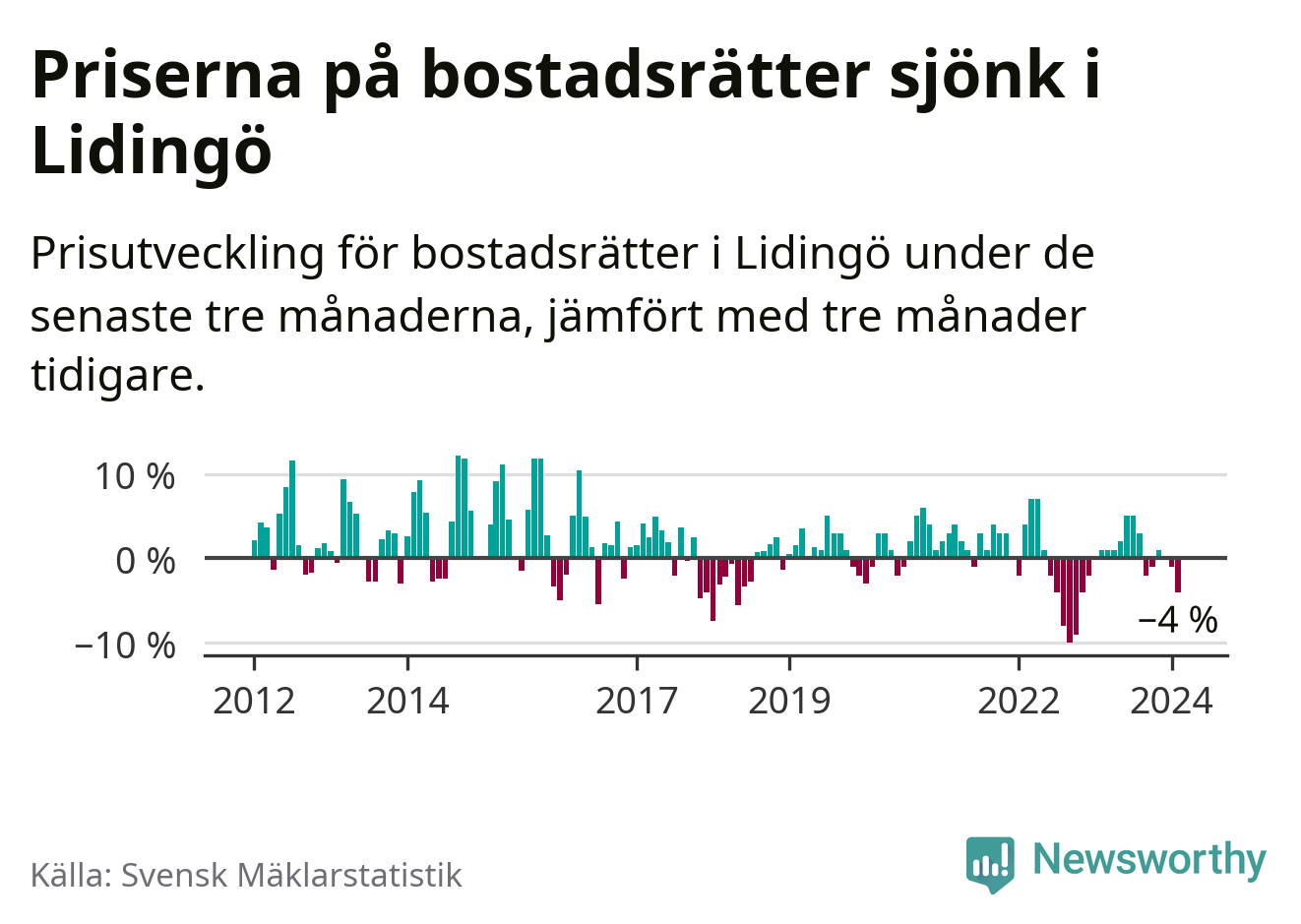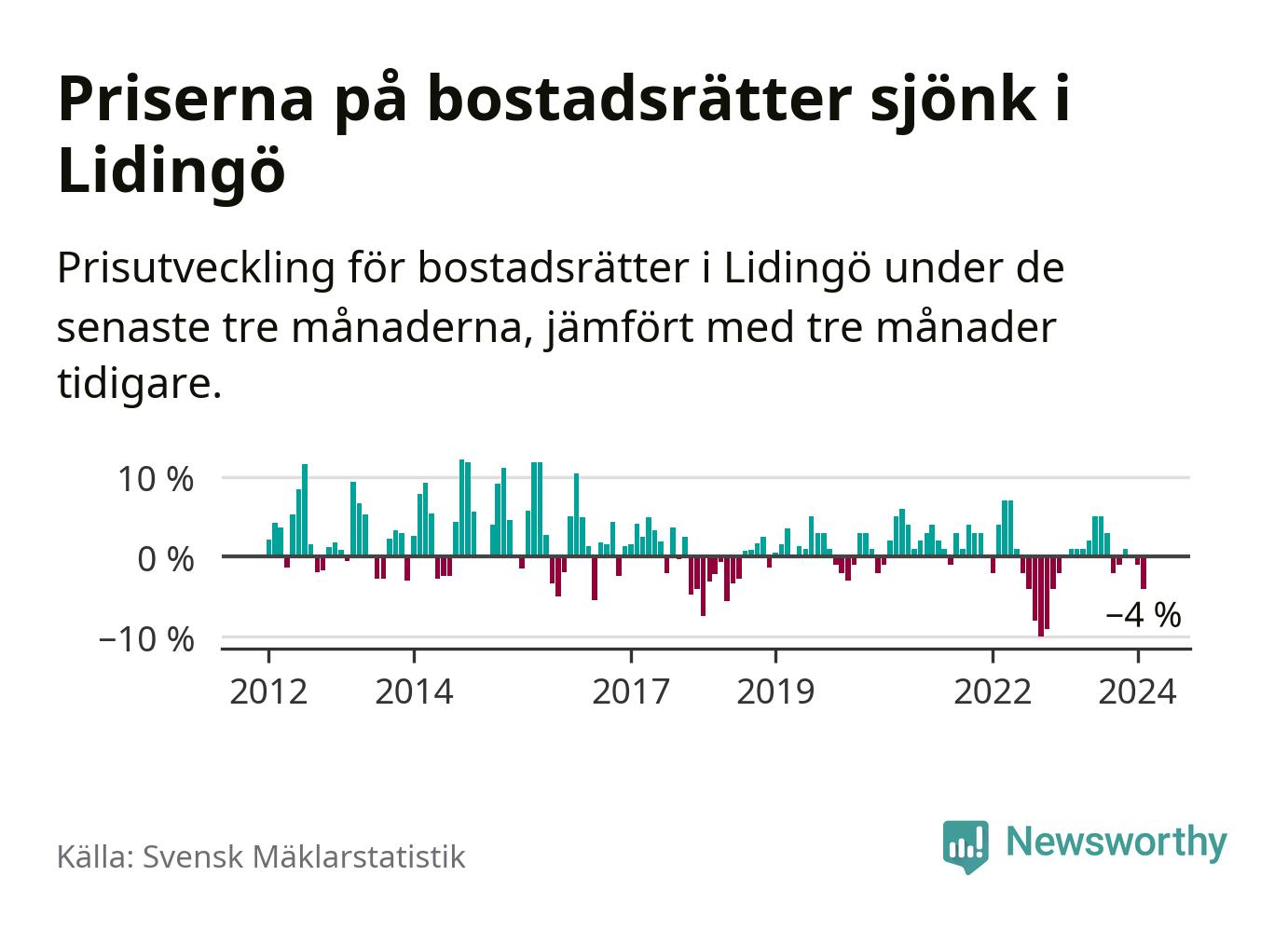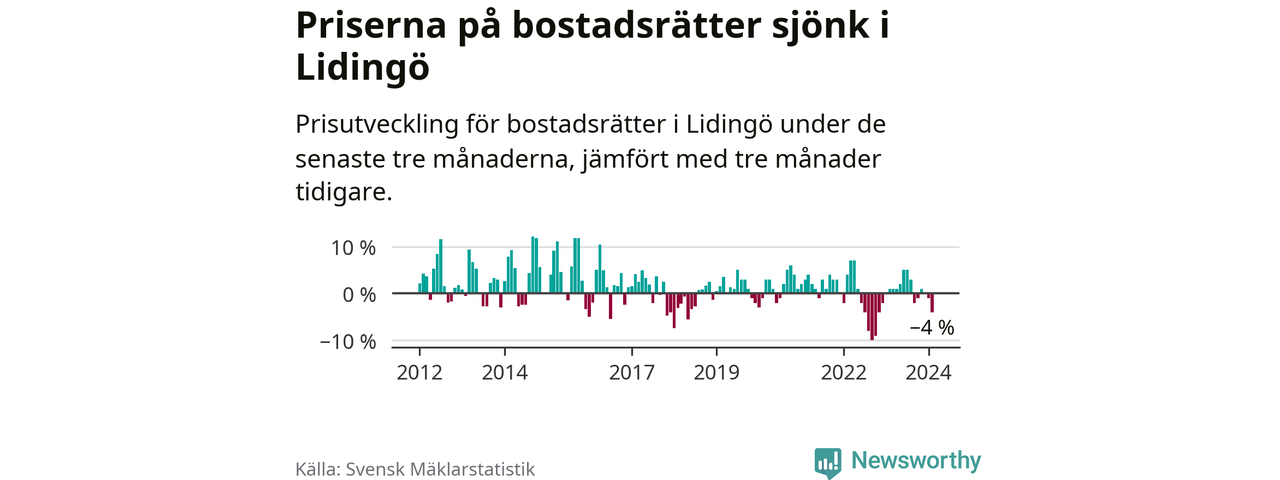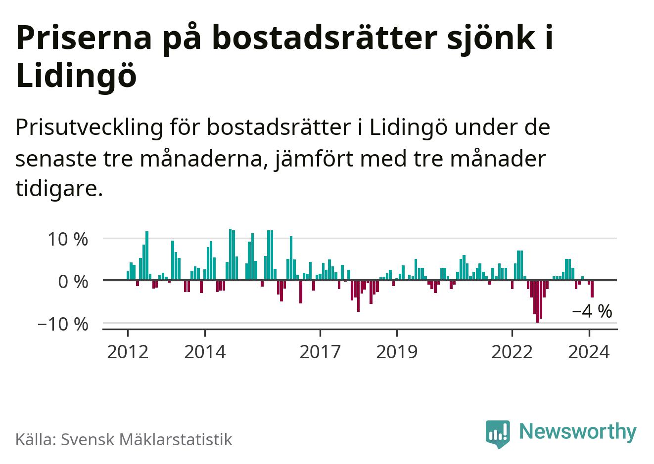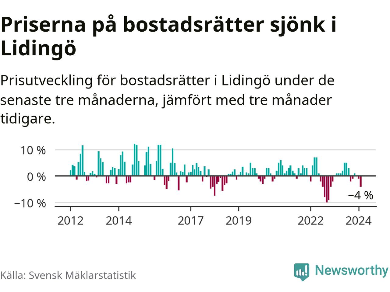 Priserna på bostadsrätter har gått ner i Lidingö kommun. Medelpriset på försäljningarna under de senaste tre månaderna visar på en nedgång med 4 procent.
