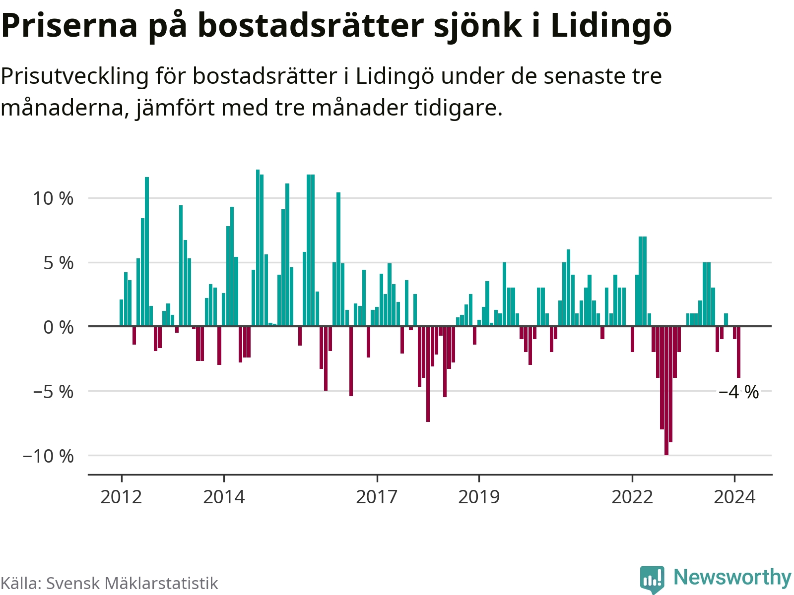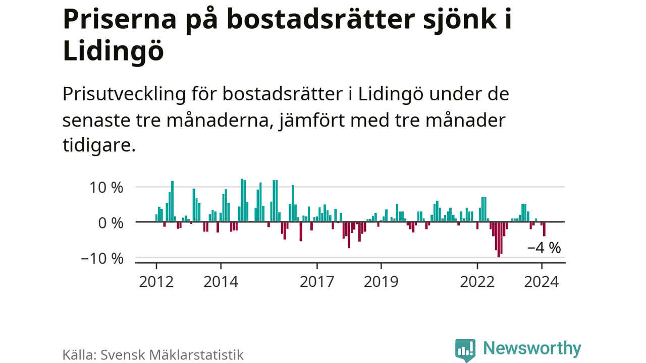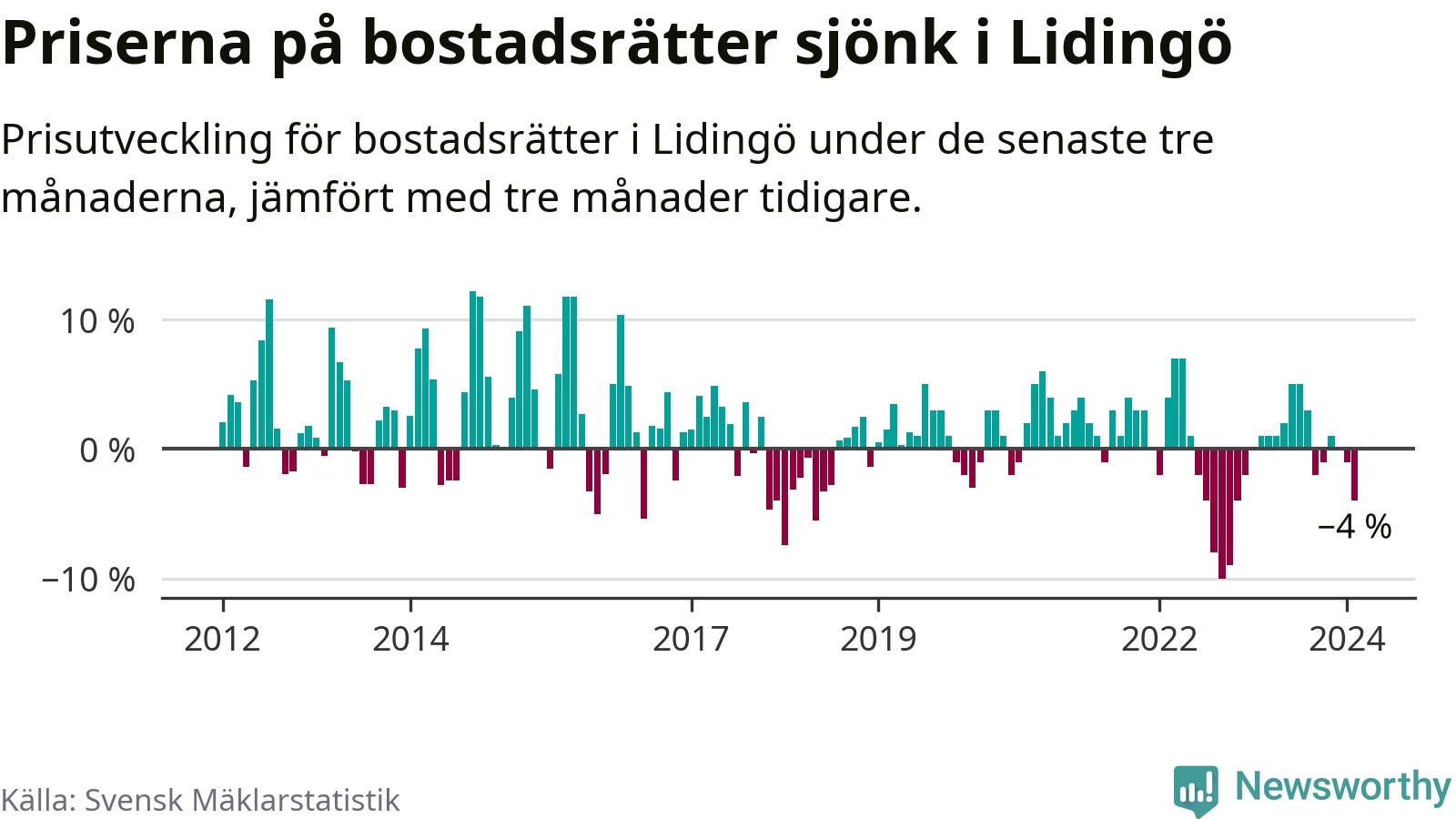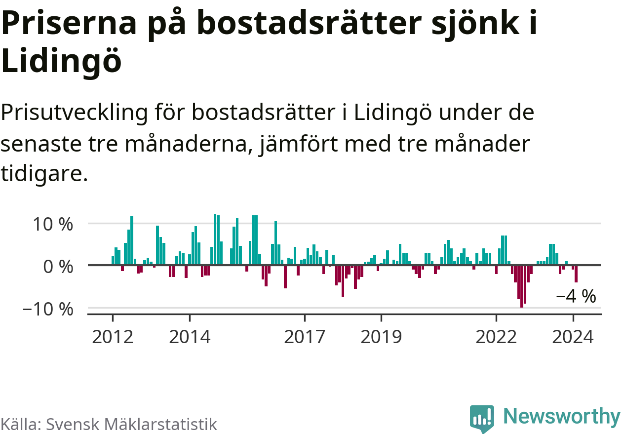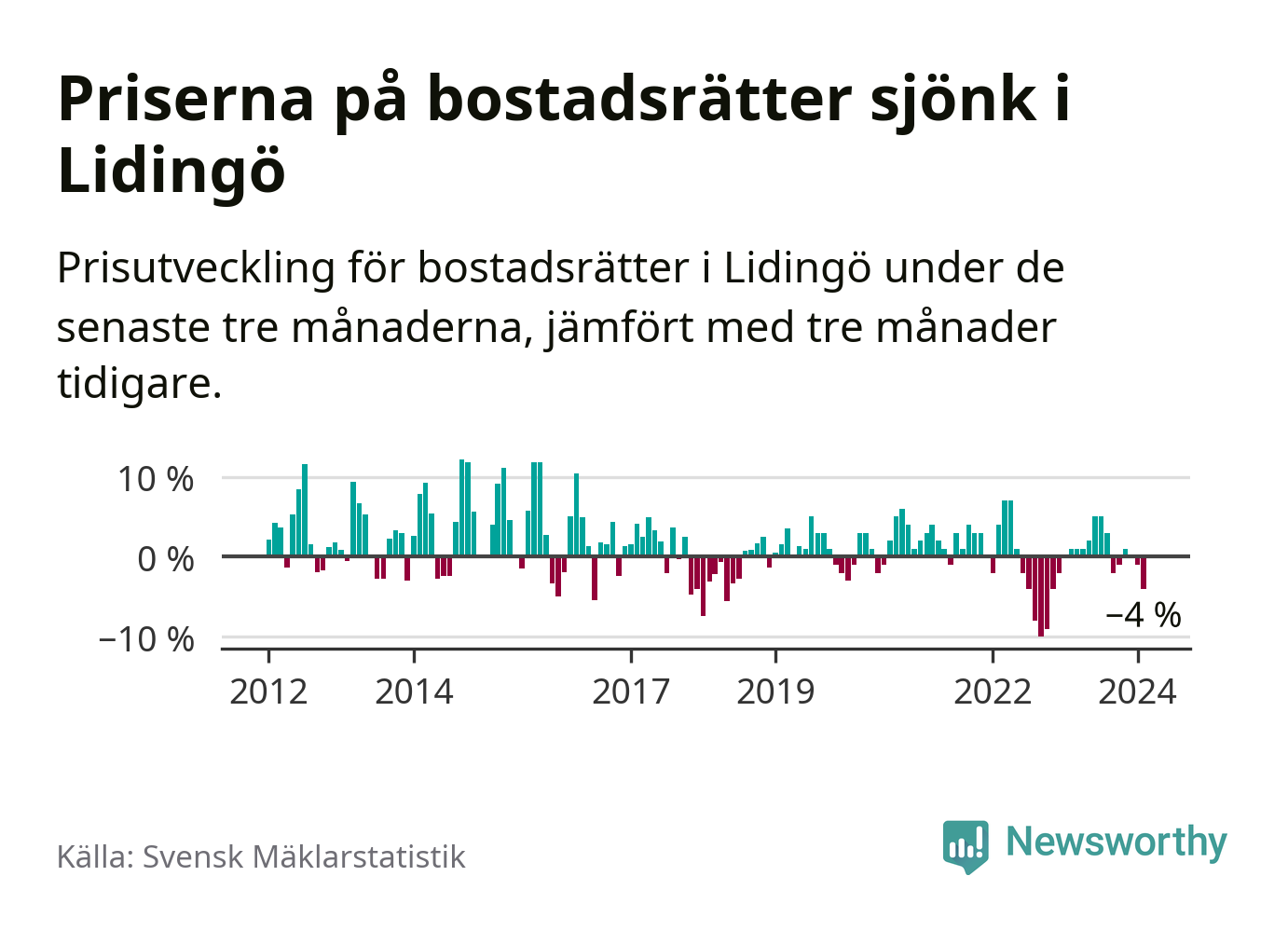 Priserna på bostadsrätter har gått ner i Lidingö kommun. Medelpriset på försäljningarna under de senaste tre månaderna visar på en nedgång med 4 procent.