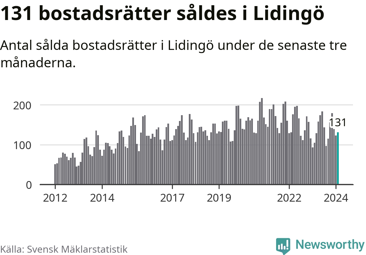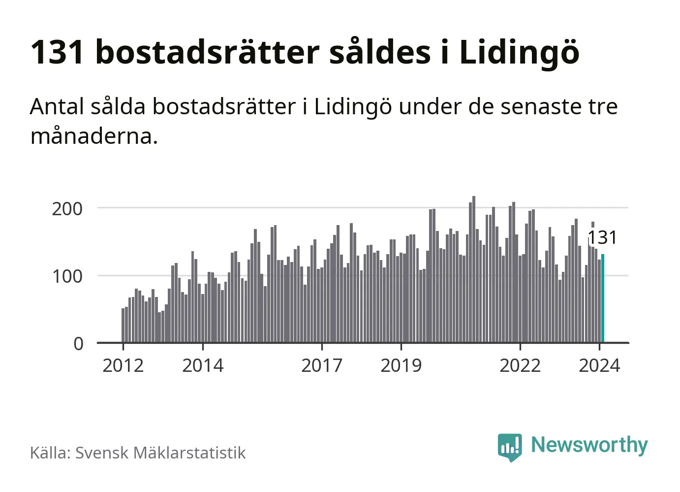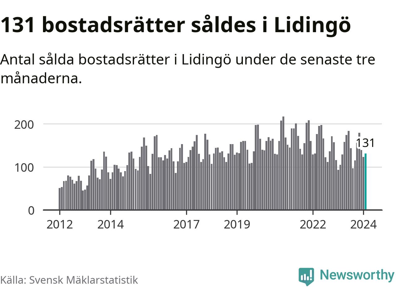 Sammanlagt såldes 131 bostadsrätter i Lidingö kommun mellan december och februari till ett genomsnittligt pris på 4,5 miljoner kronor. I fjol gjordes 105 affärer vid den här tiden på året.