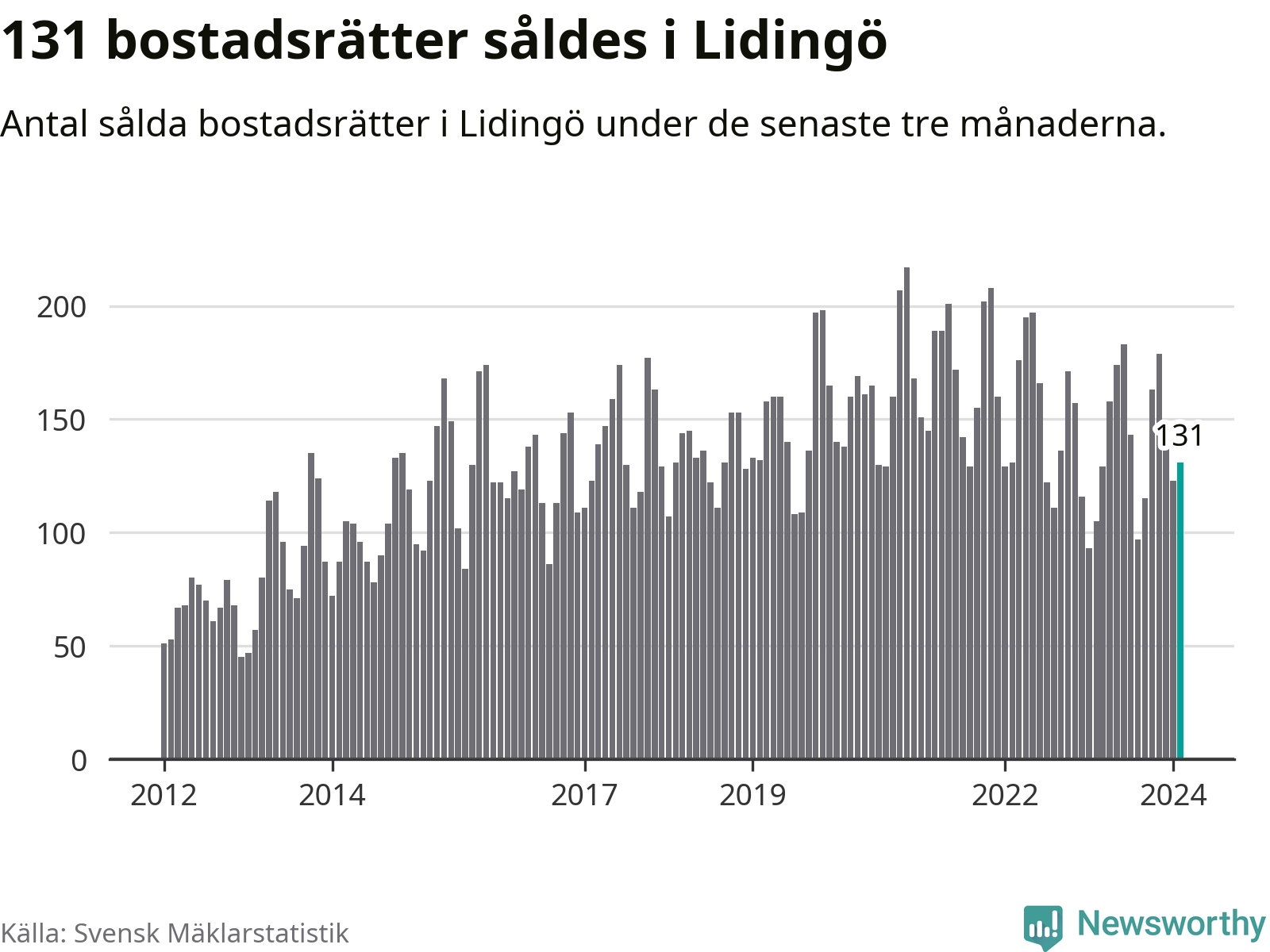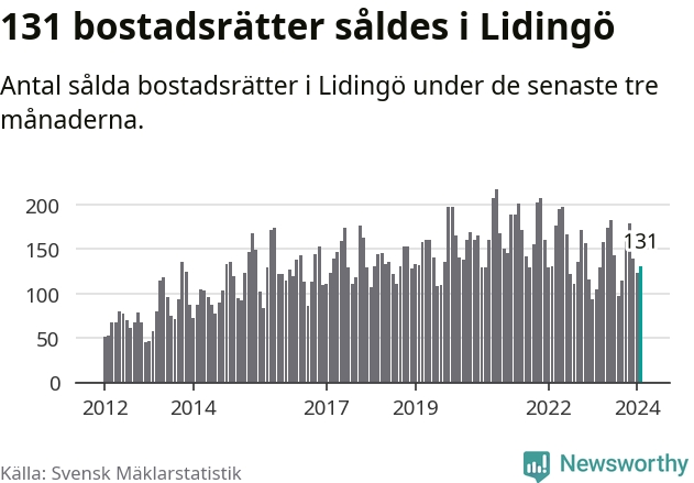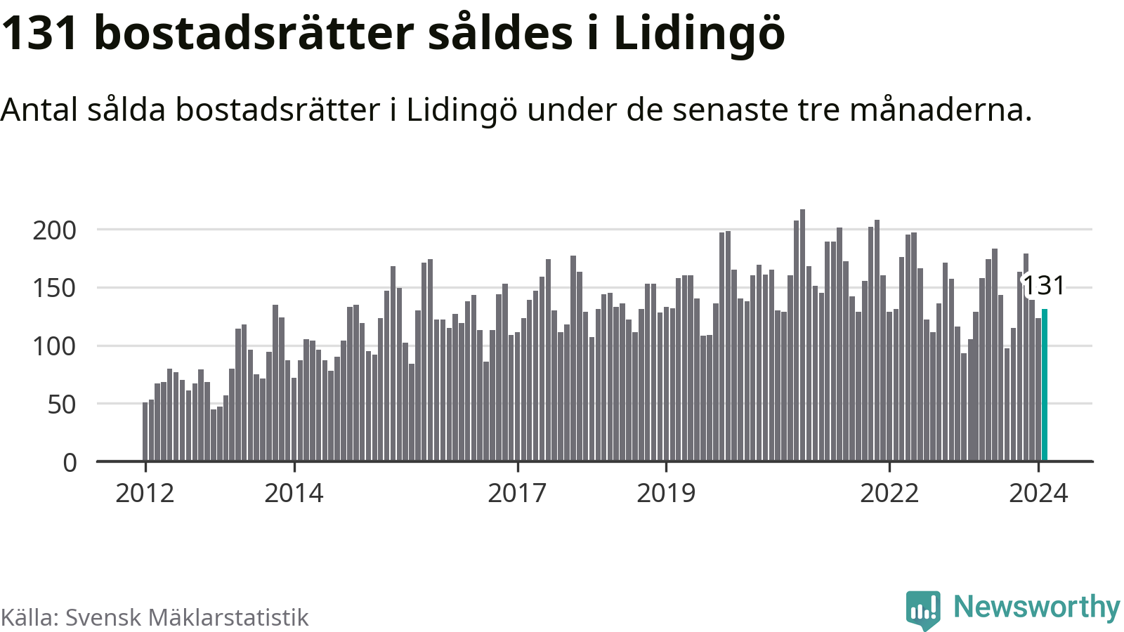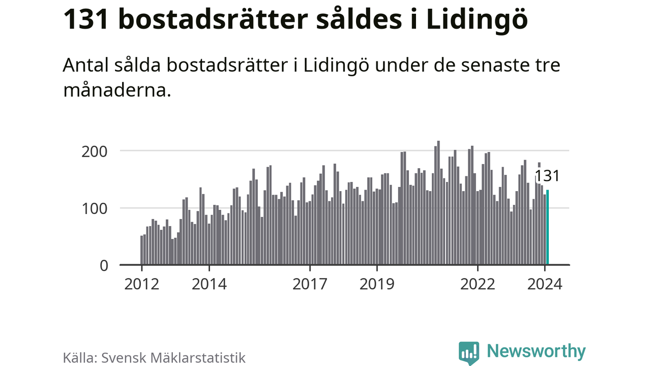 Sammanlagt såldes 131 bostadsrätter i Lidingö kommun mellan december och februari till ett genomsnittligt pris på 4,5 miljoner kronor. I fjol gjordes 105 affärer vid den här tiden på året.