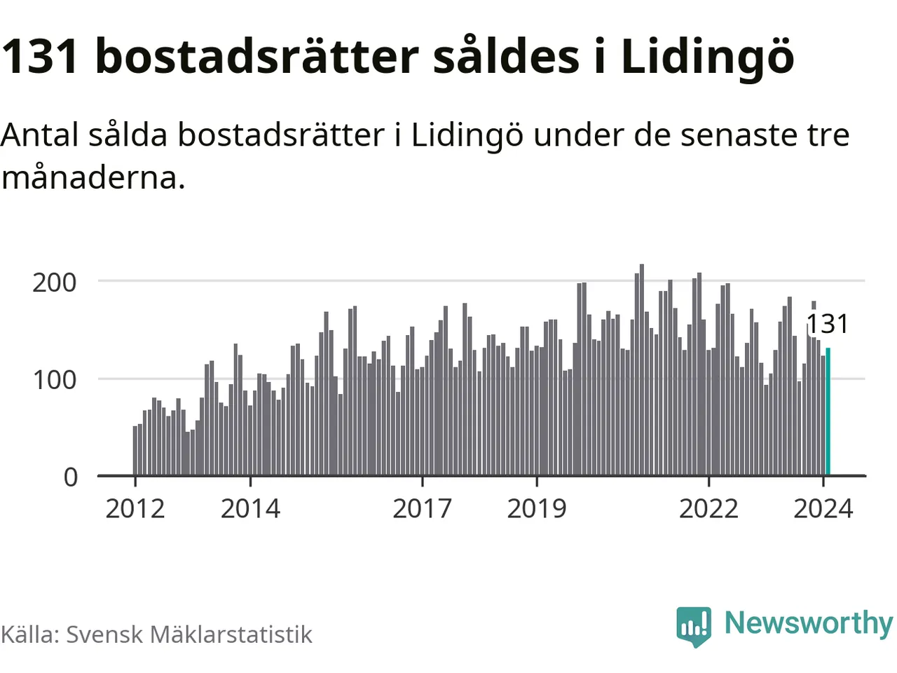 Lidingö | −4 % ▼ | 131 | 4,5 miljoner |