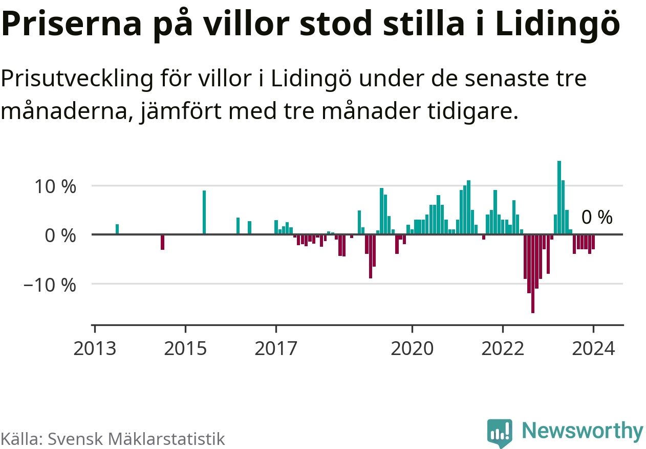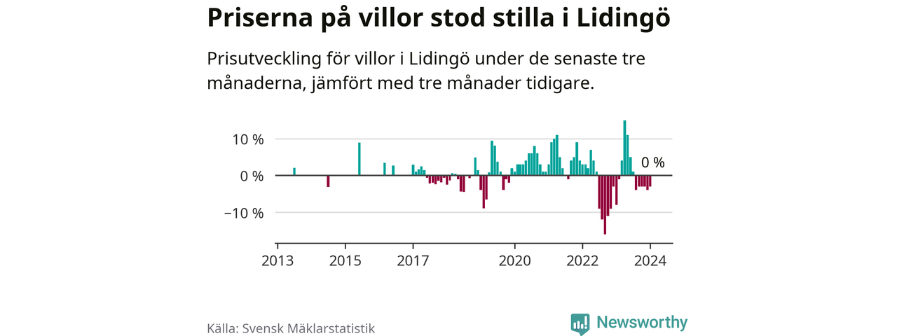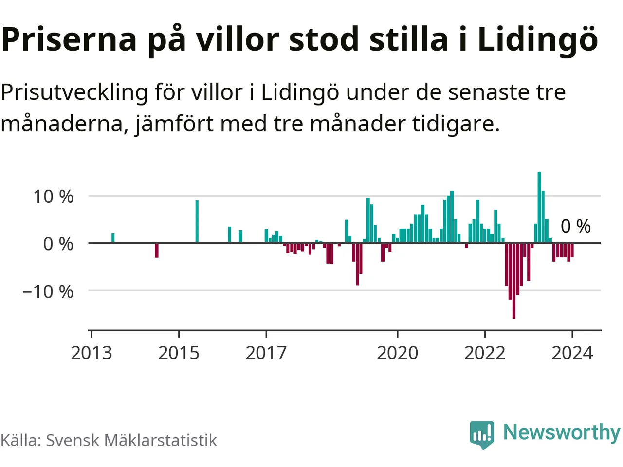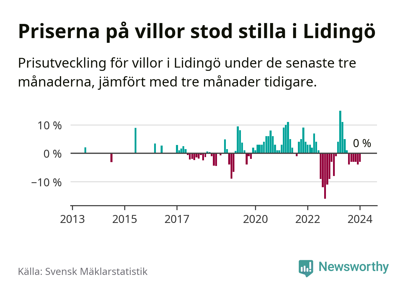 Villapriserna står i stort sett stilla i Lidingö kommun. Medelpriset på de på försäljningarna under de senaste tre månaderna låg på samma nivå som för tre månader sedan.