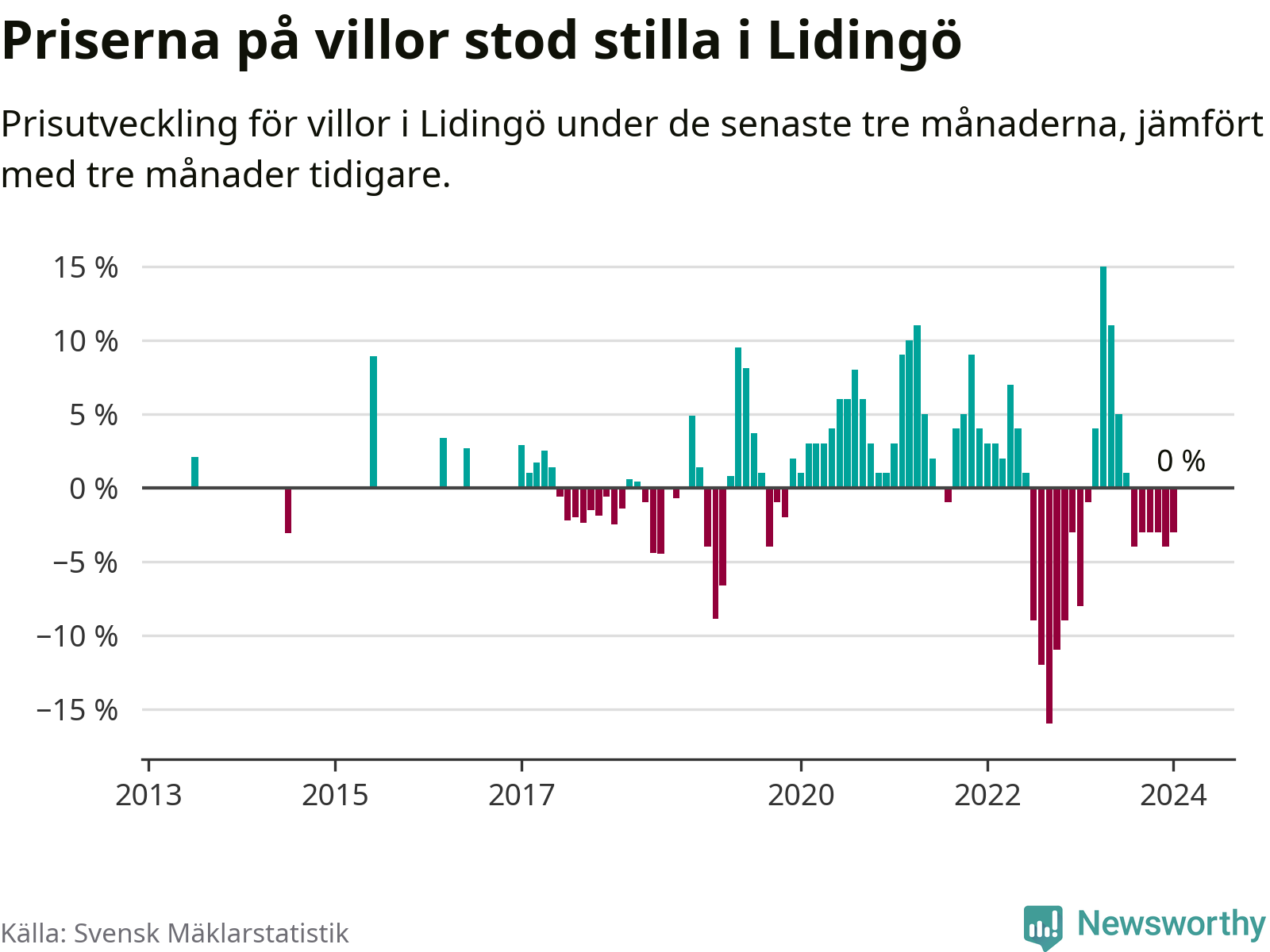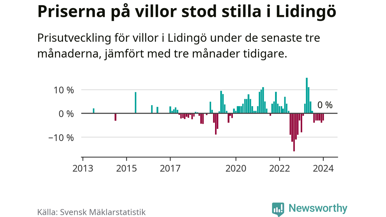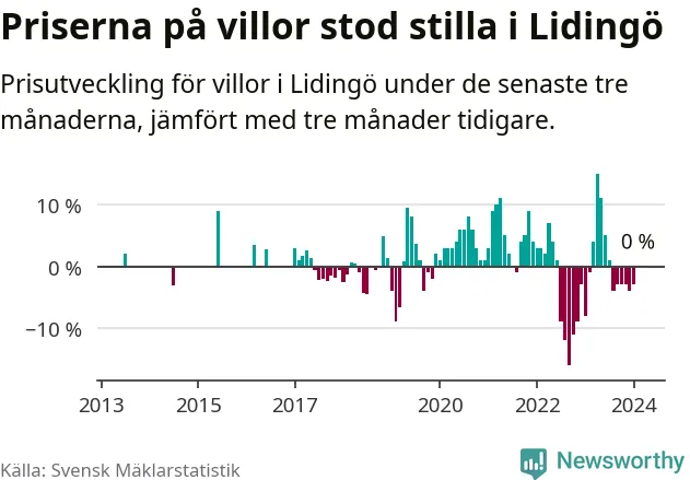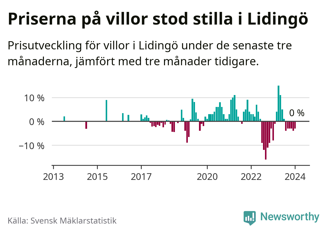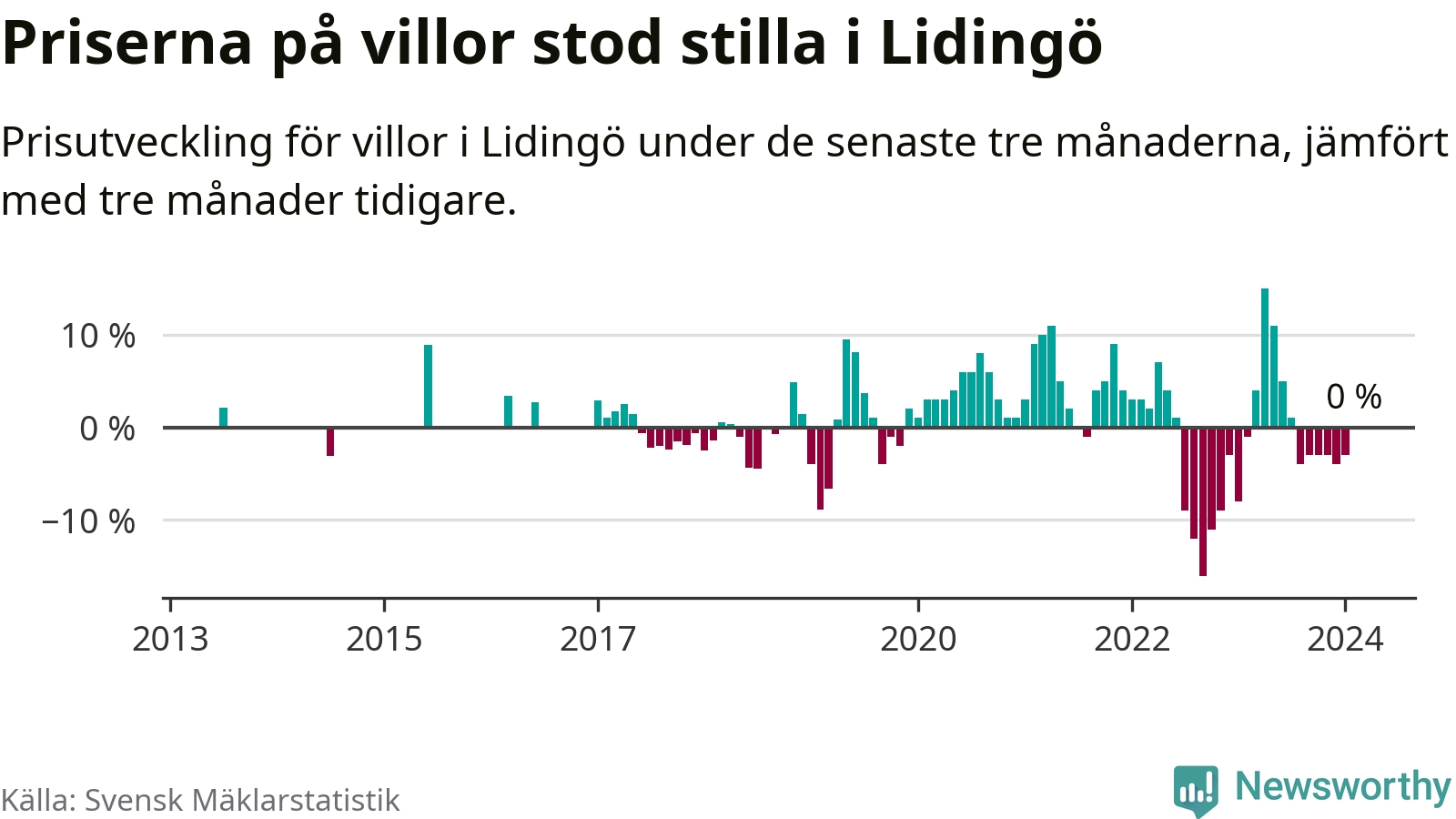 Villapriserna står i stort sett stilla i Lidingö kommun. Medelpriset på de på försäljningarna under de senaste tre månaderna låg på samma nivå som för tre månader sedan.