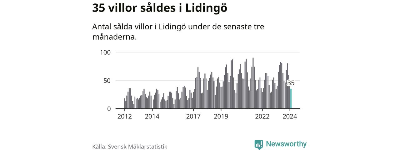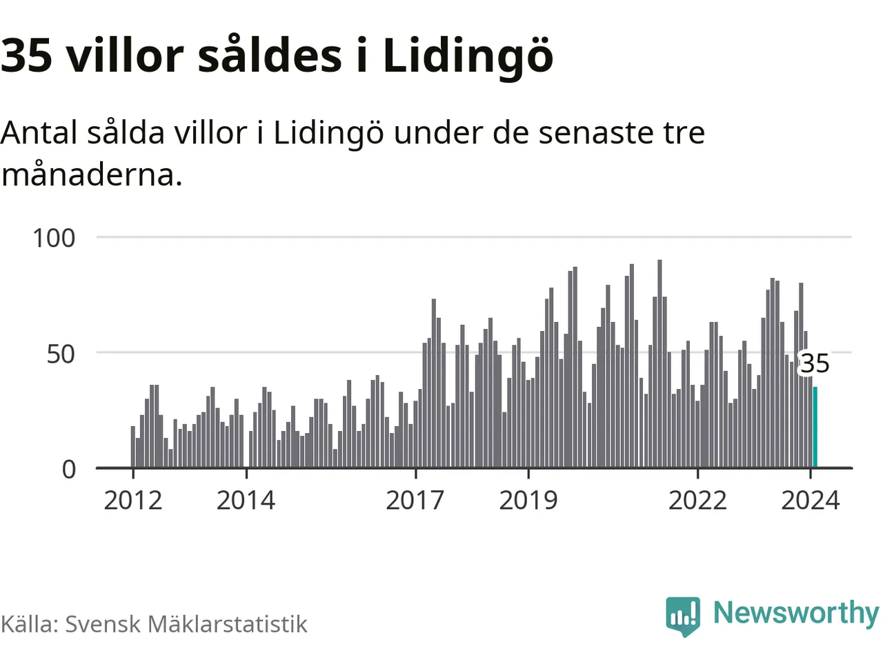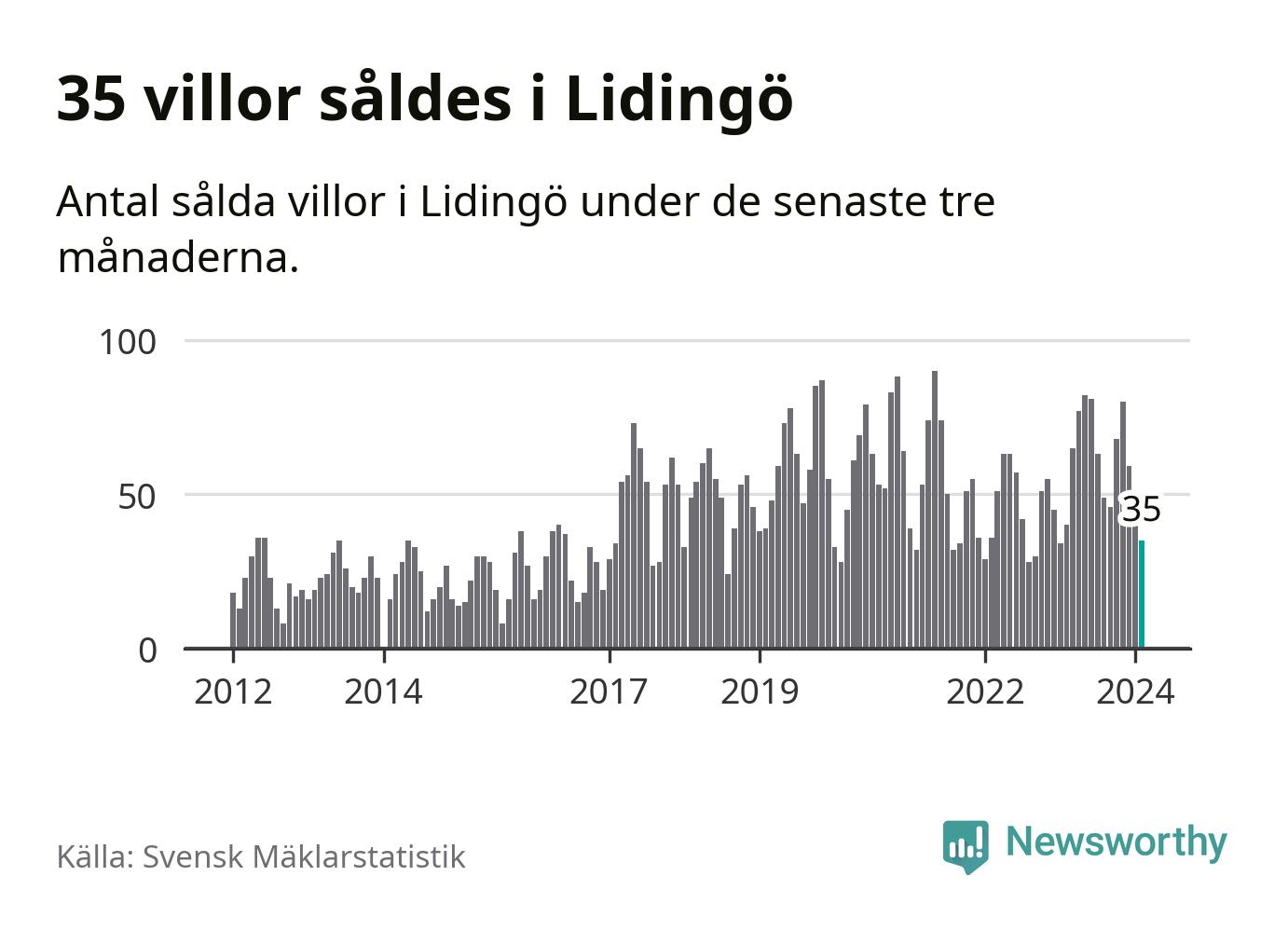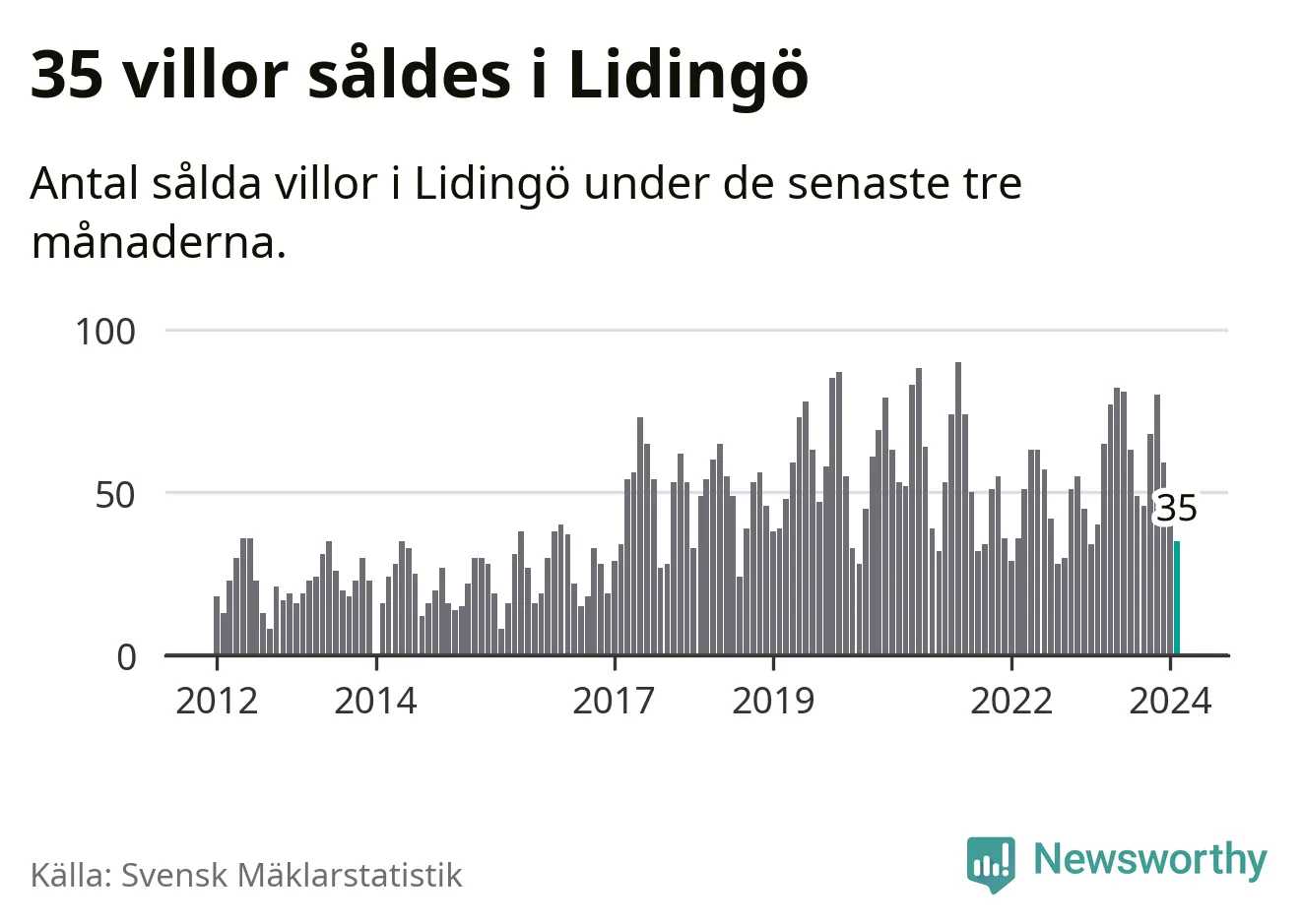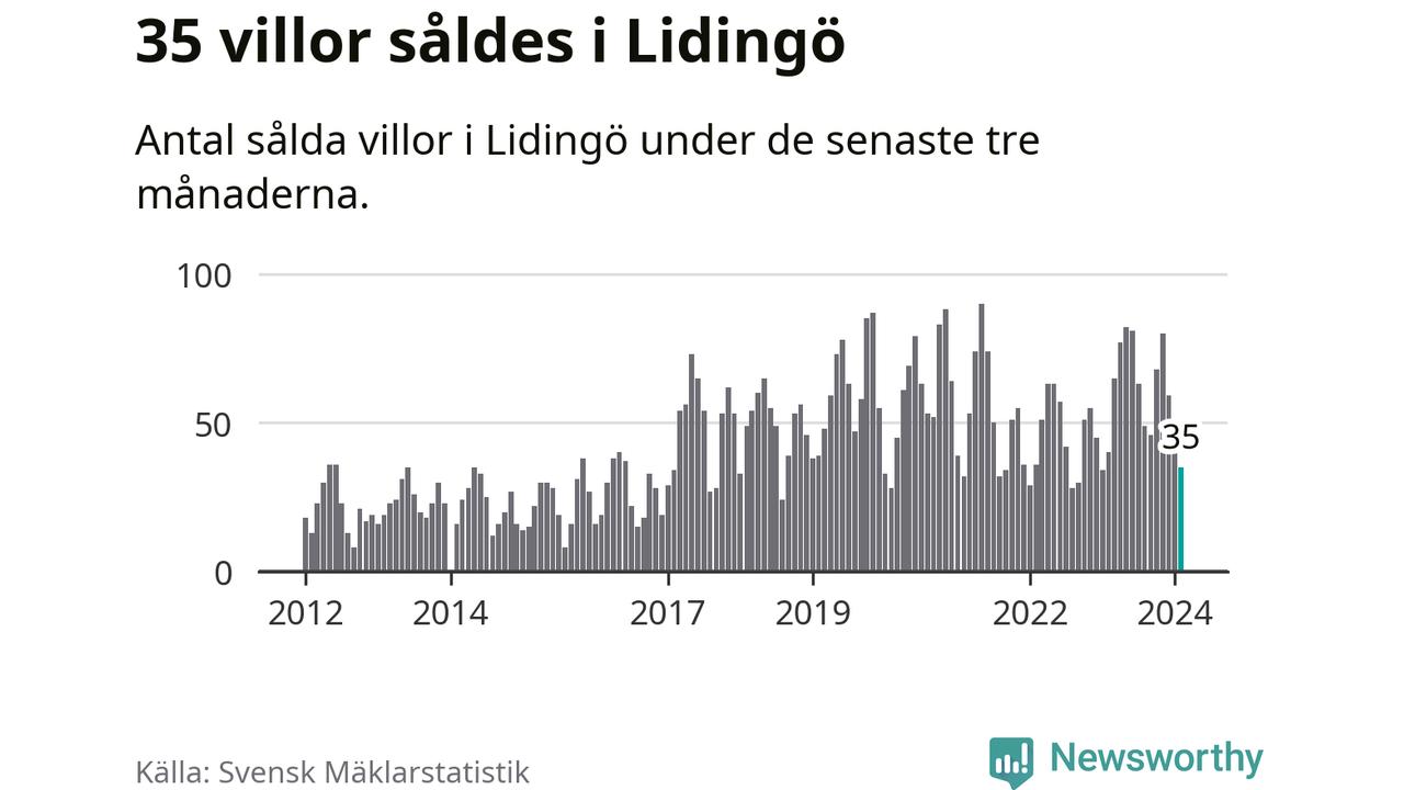 Sammanlagt såldes 35 villor i Lidingö kommun mellan december och februari till ett genomsnittligt pris på 12,7 miljoner kronor. I fjol gjordes 40 affärer vid den här tiden på året.