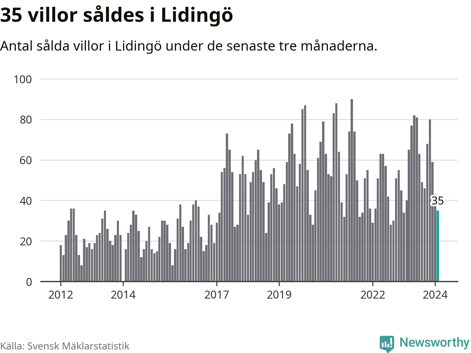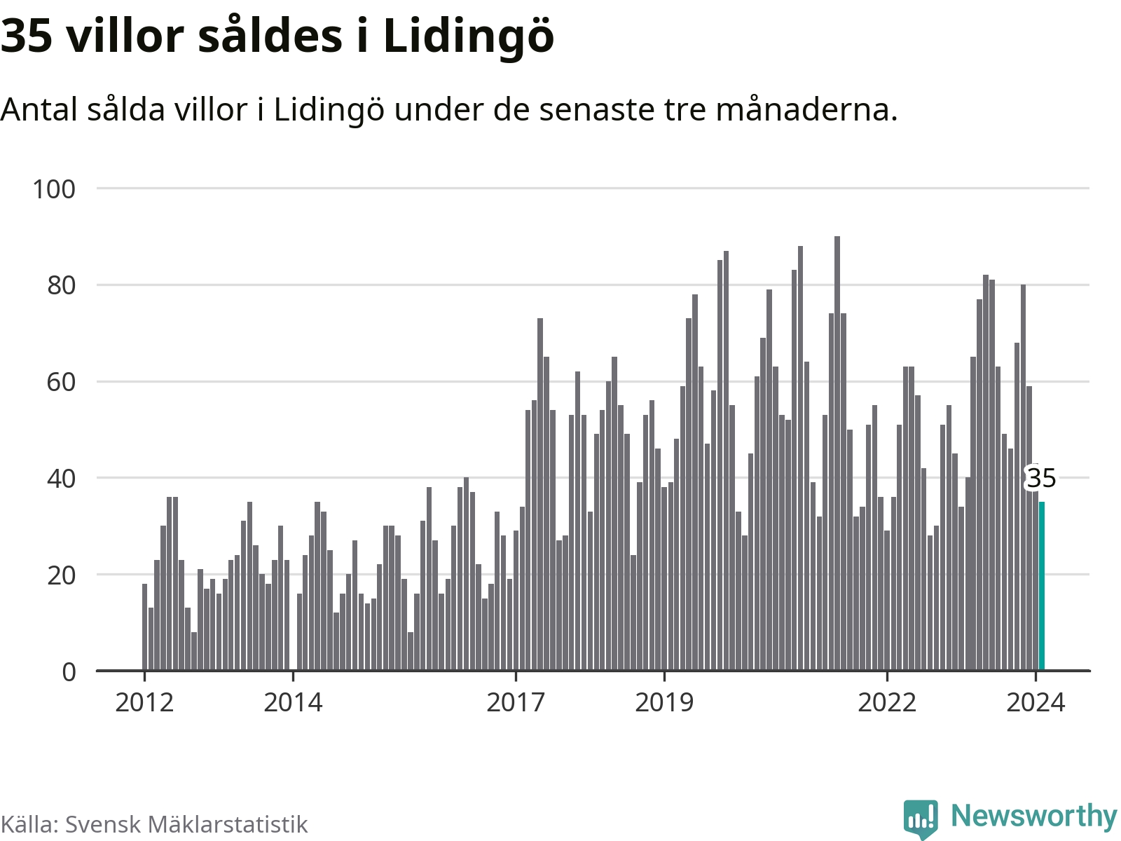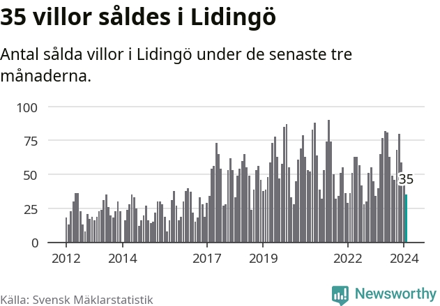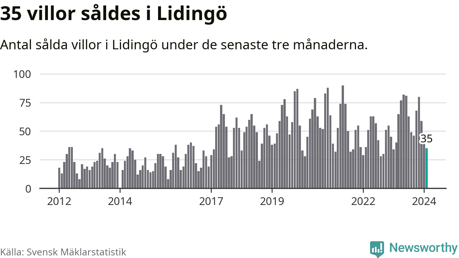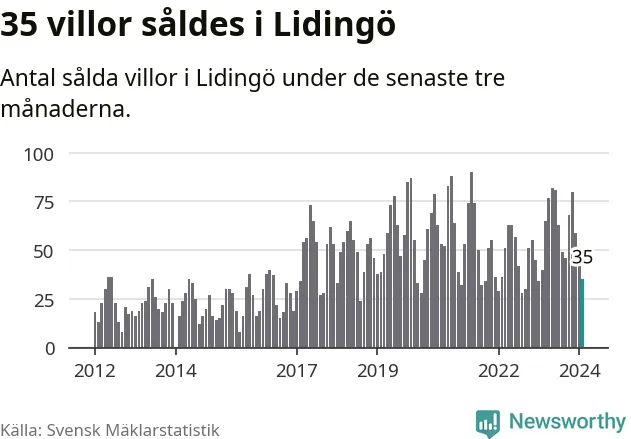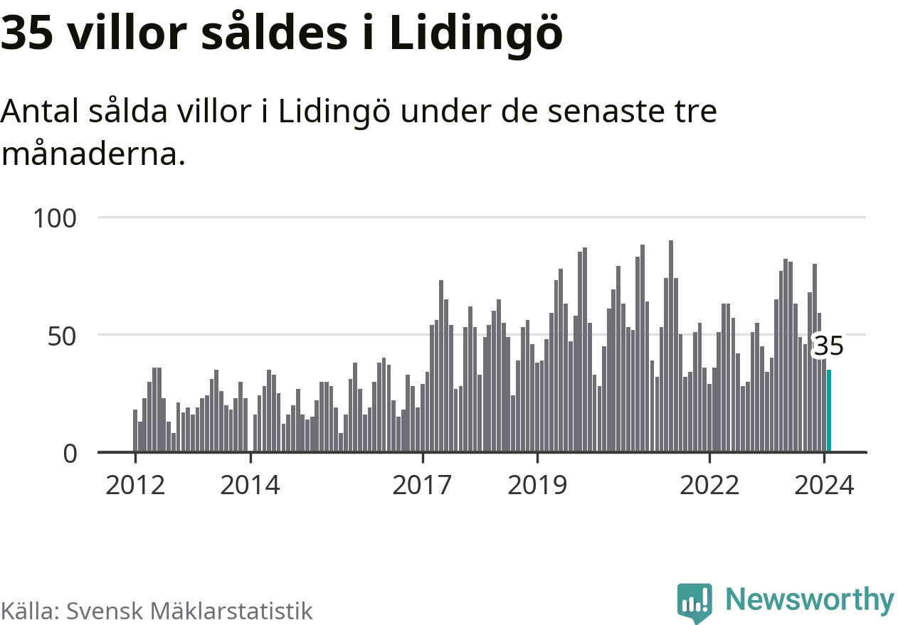 Sammanlagt såldes 35 villor i Lidingö kommun mellan december och februari till ett genomsnittligt pris på 12,7 miljoner kronor. I fjol gjordes 40 affärer vid den här tiden på året.