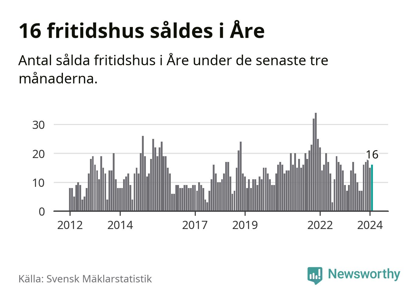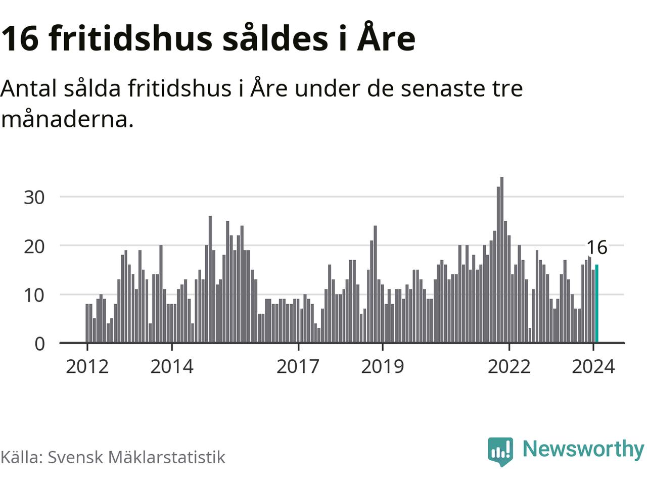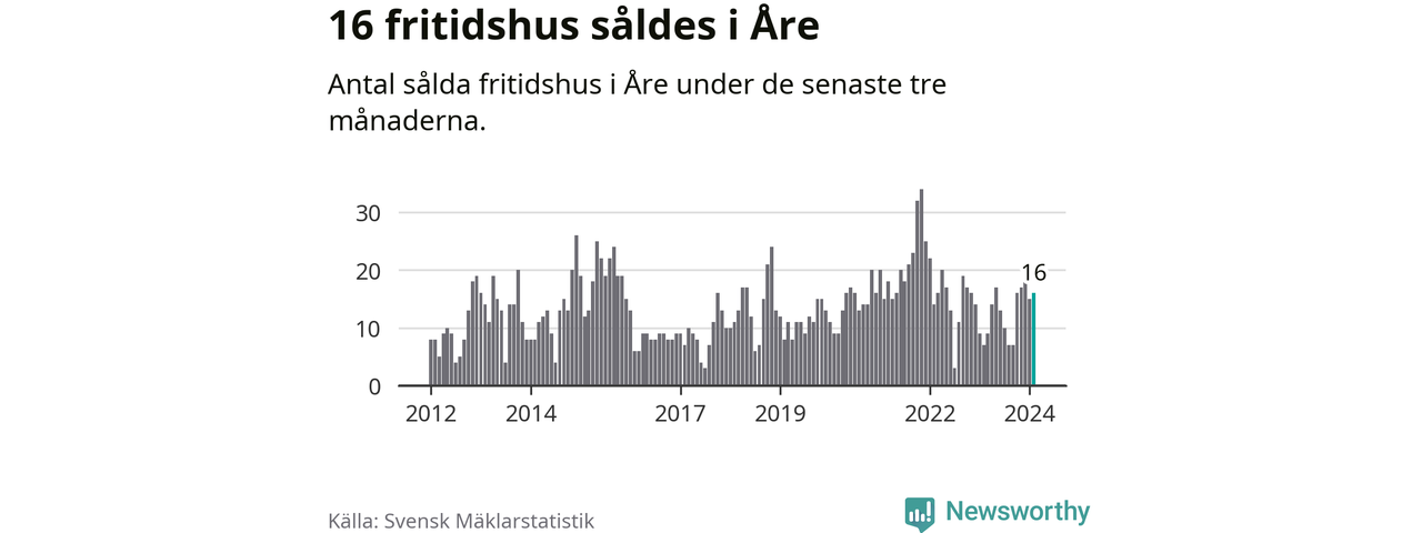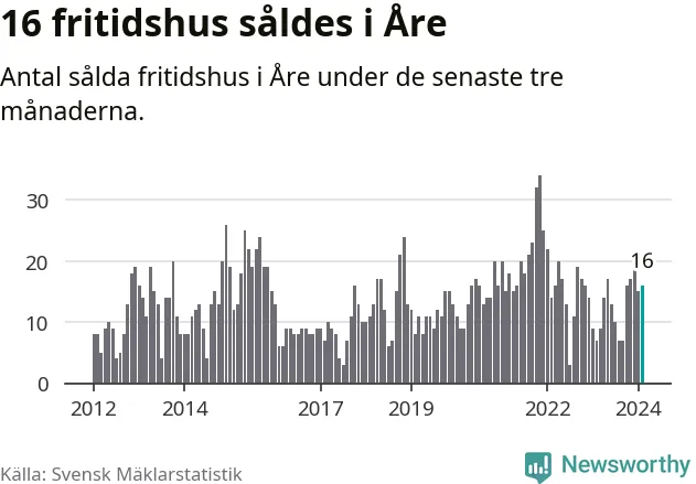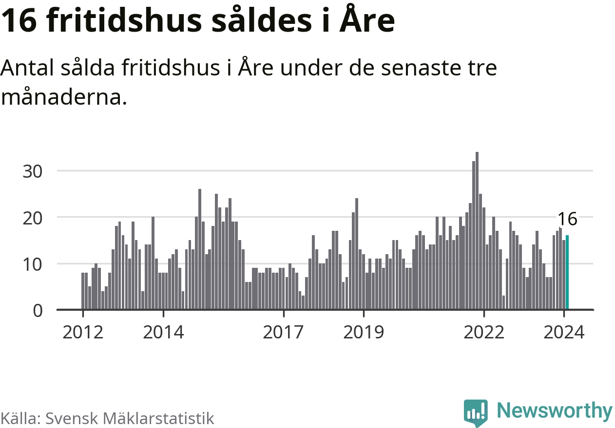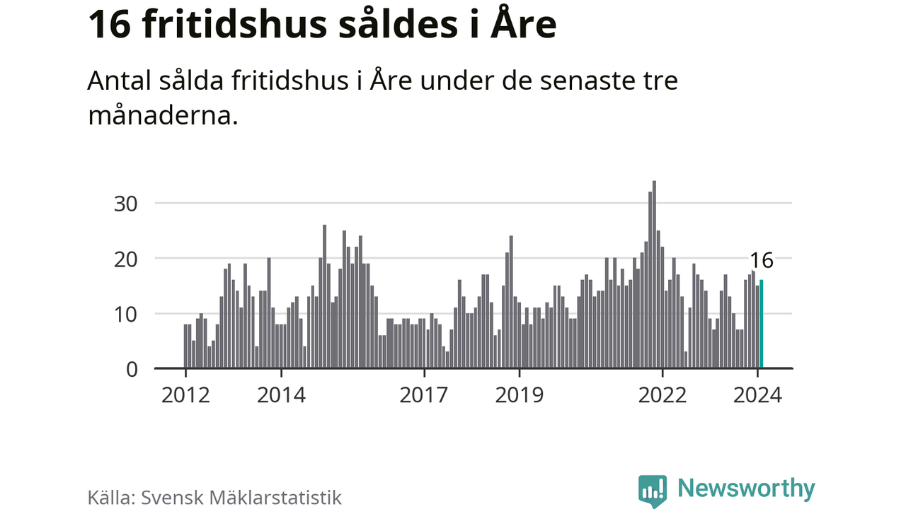 Sammanlagt såldes 16 fritidshus i Åre kommun mellan december 2023 och februari till ett genomsnittligt pris på 4,6 miljoner kronor. I fjol gjordes sju affärer vid den här tiden på året.