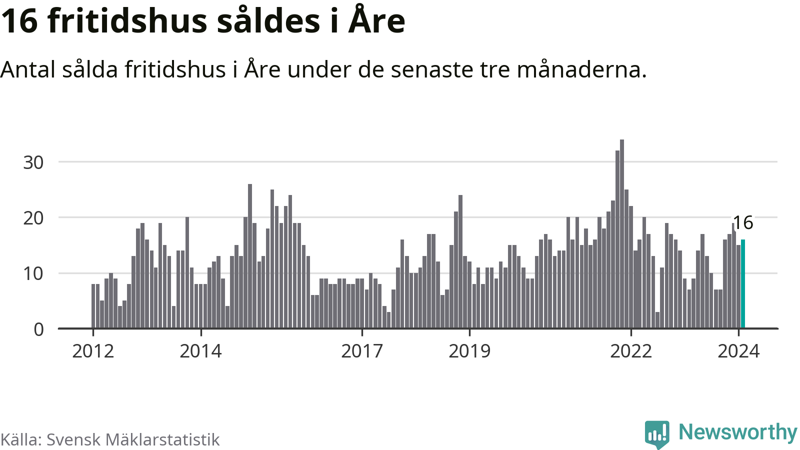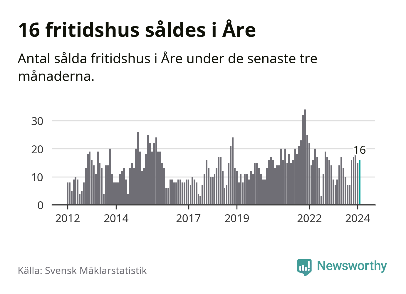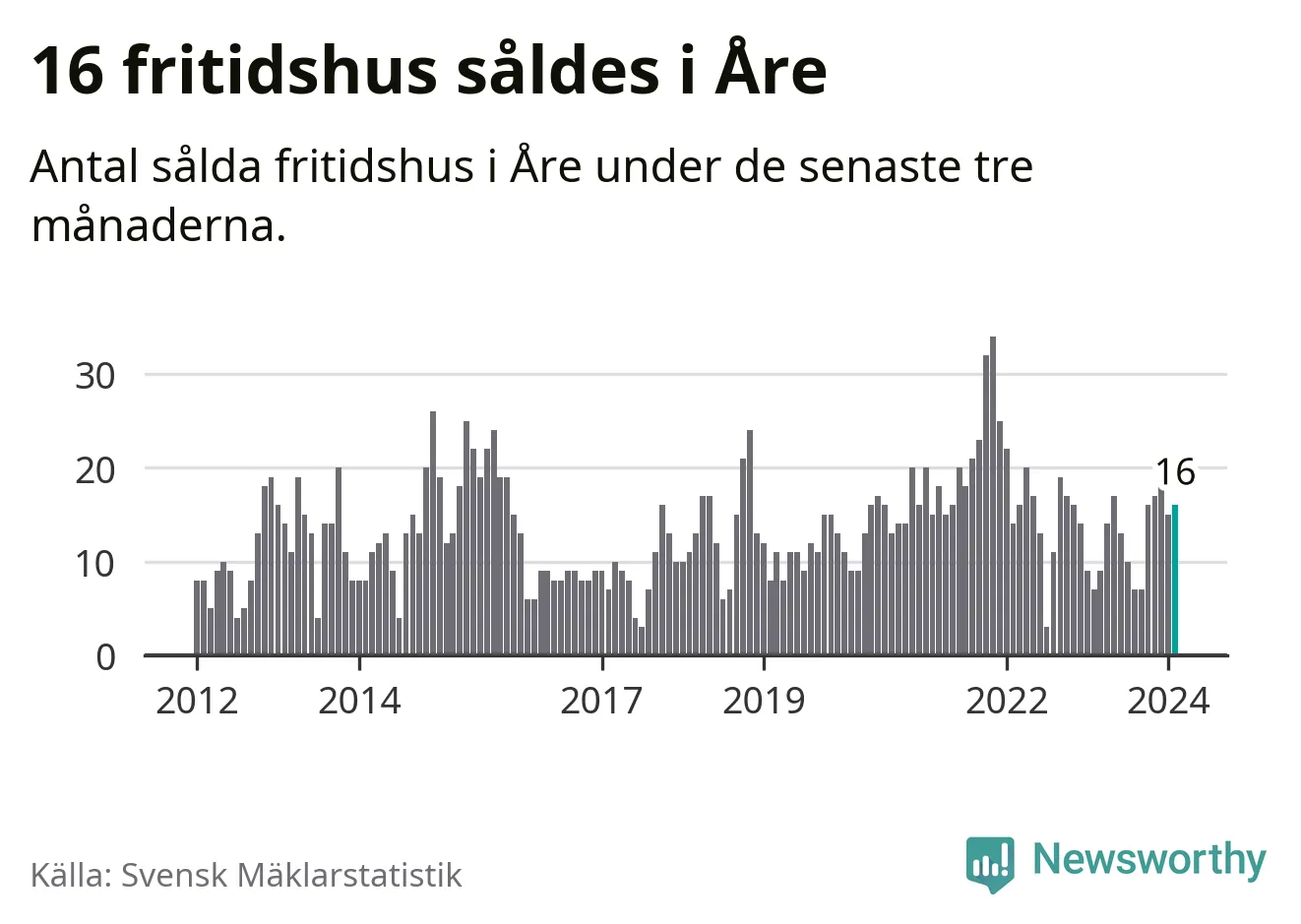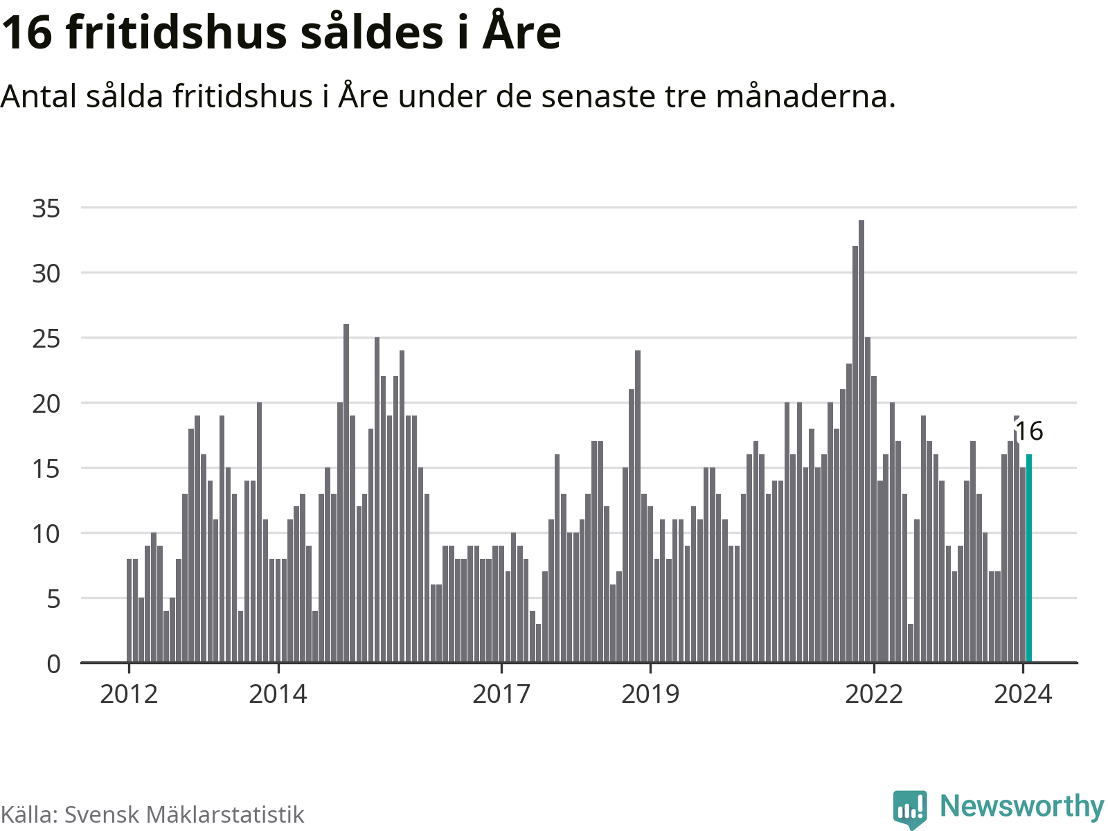 Sammanlagt såldes 16 fritidshus i Åre kommun mellan december 2023 och februari till ett genomsnittligt pris på 4,6 miljoner kronor. I fjol gjordes sju affärer vid den här tiden på året.
