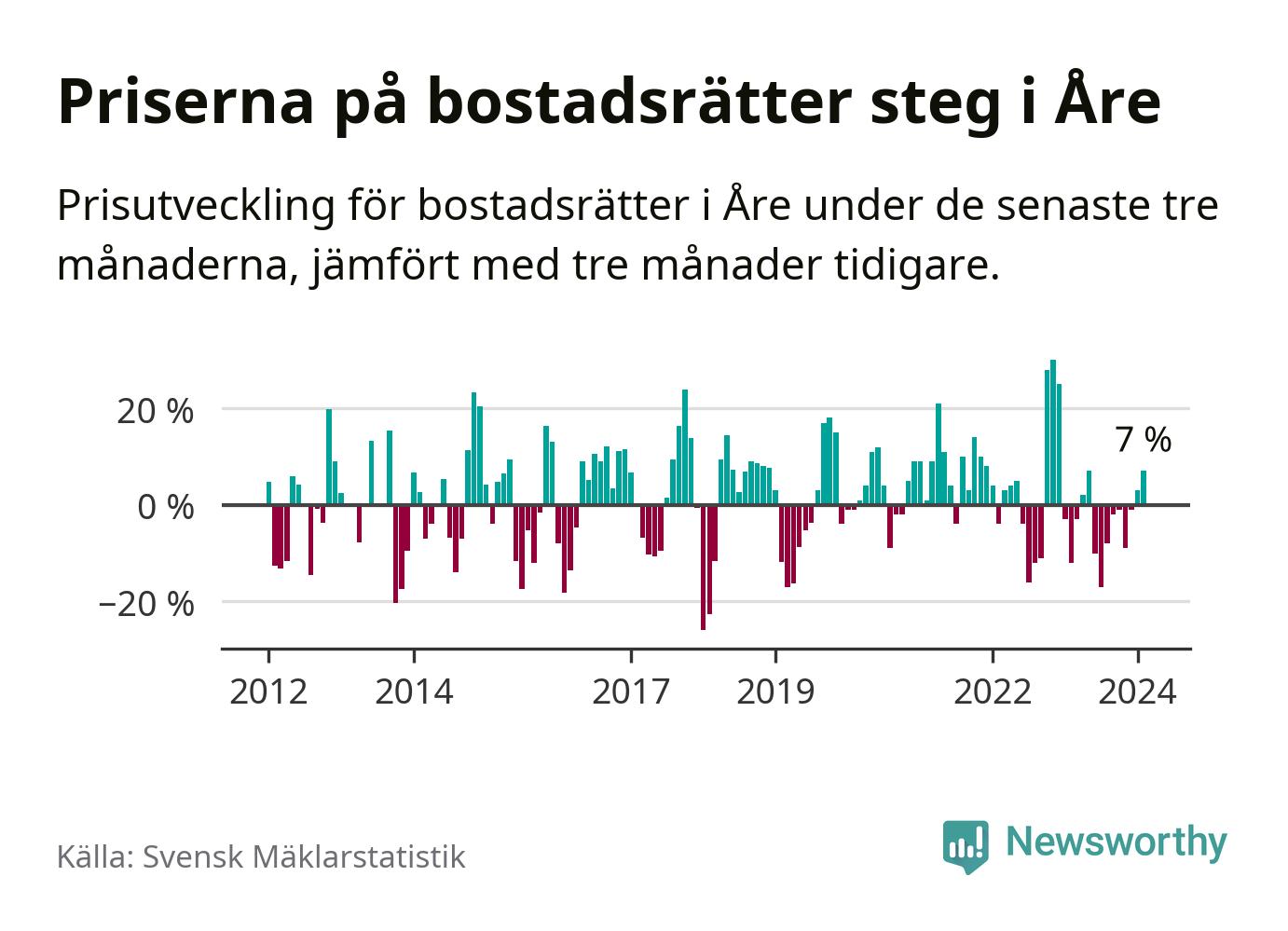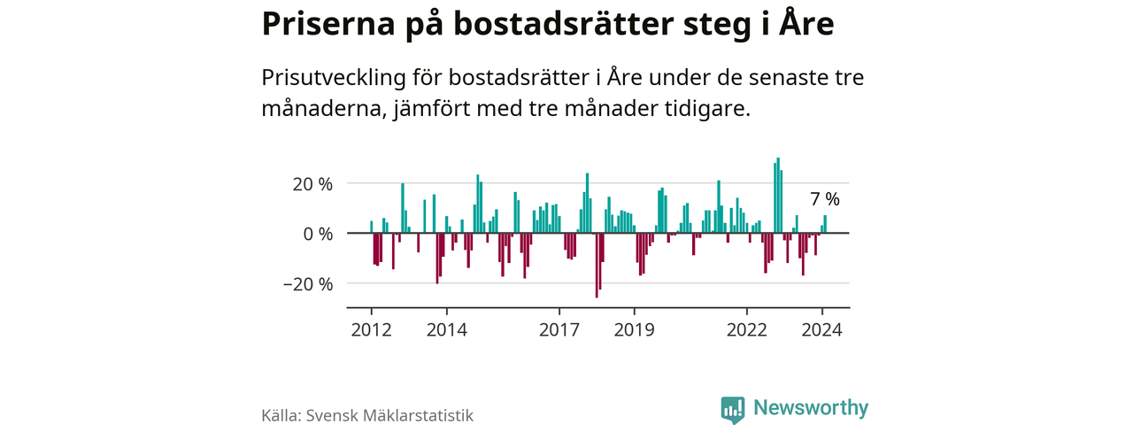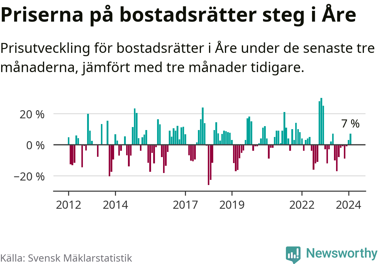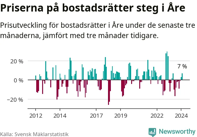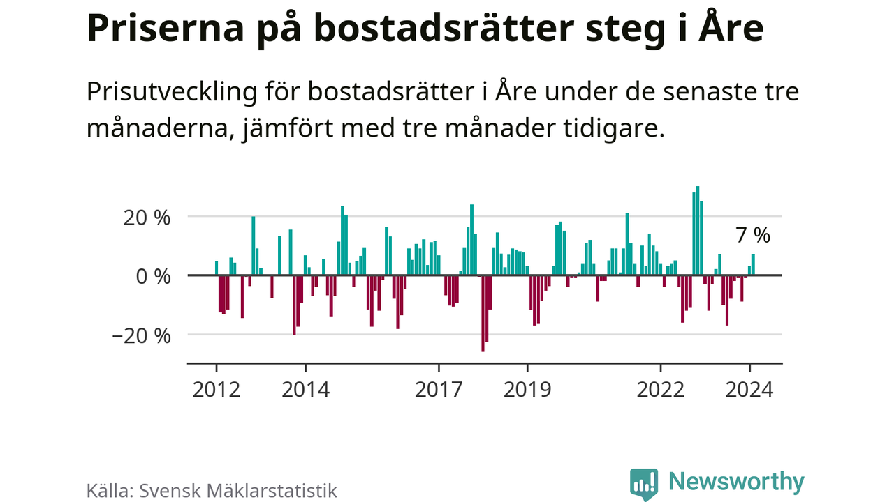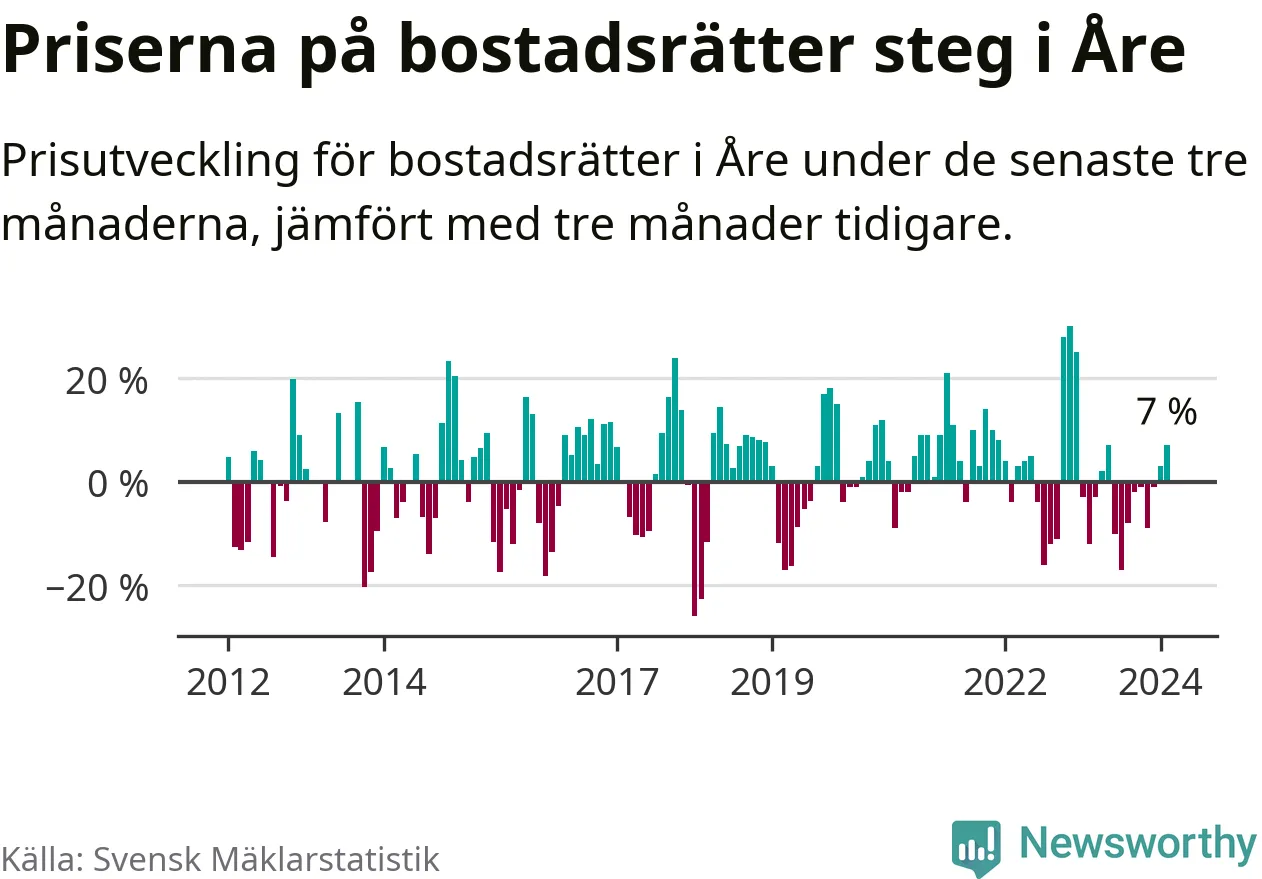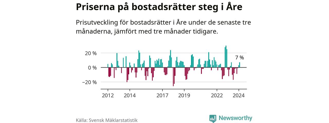Priserna på bostadsrätter har gått upp i Åre kommun. Medelpriset på försäljningarna under de senaste tre månaderna visar på en uppgång med 7 procent.
