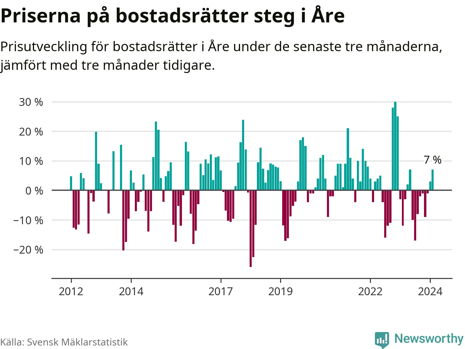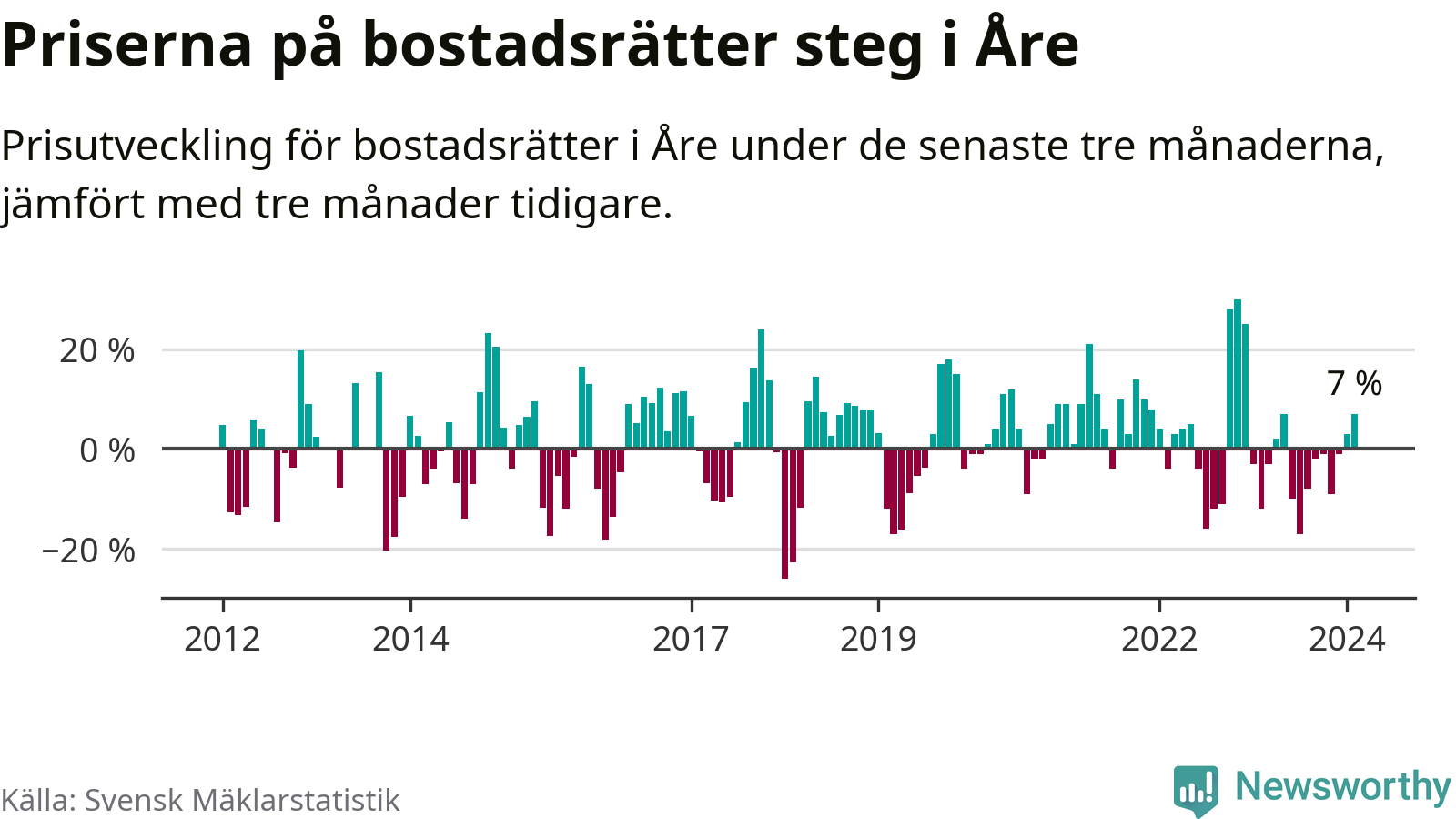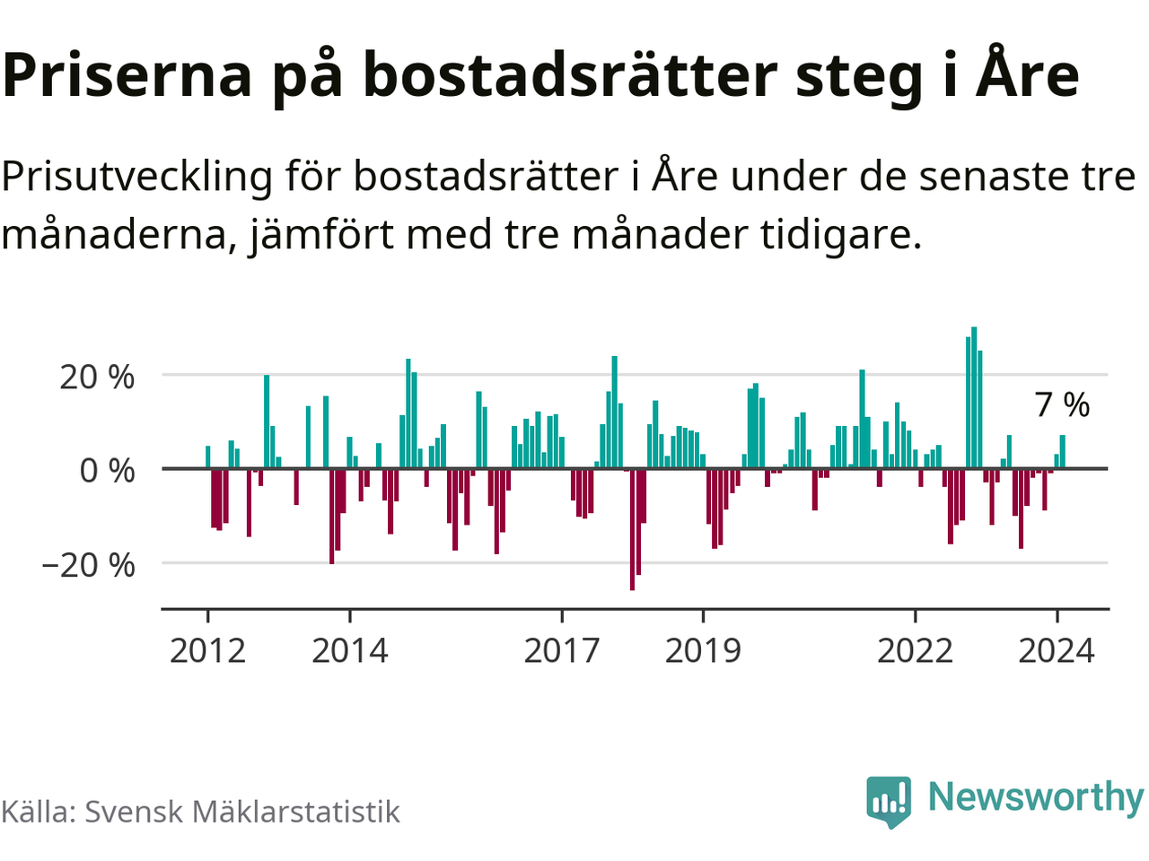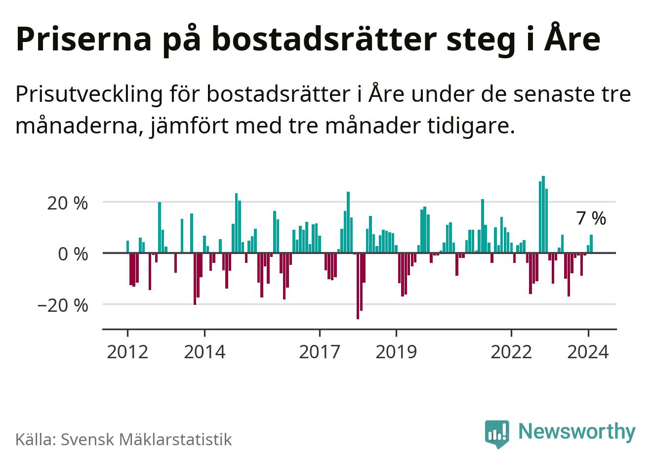Priserna på bostadsrätter har gått upp i Åre kommun. Medelpriset på försäljningarna under de senaste tre månaderna visar på en uppgång med 7 procent.