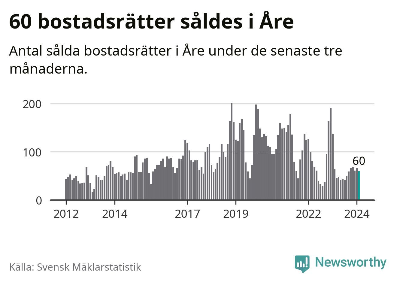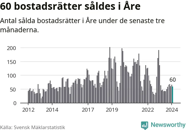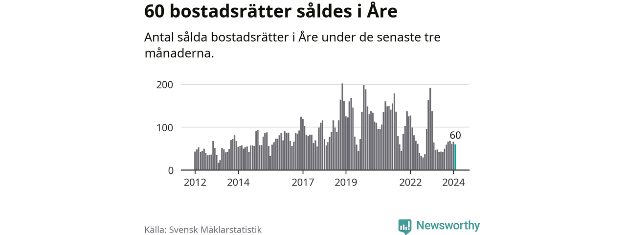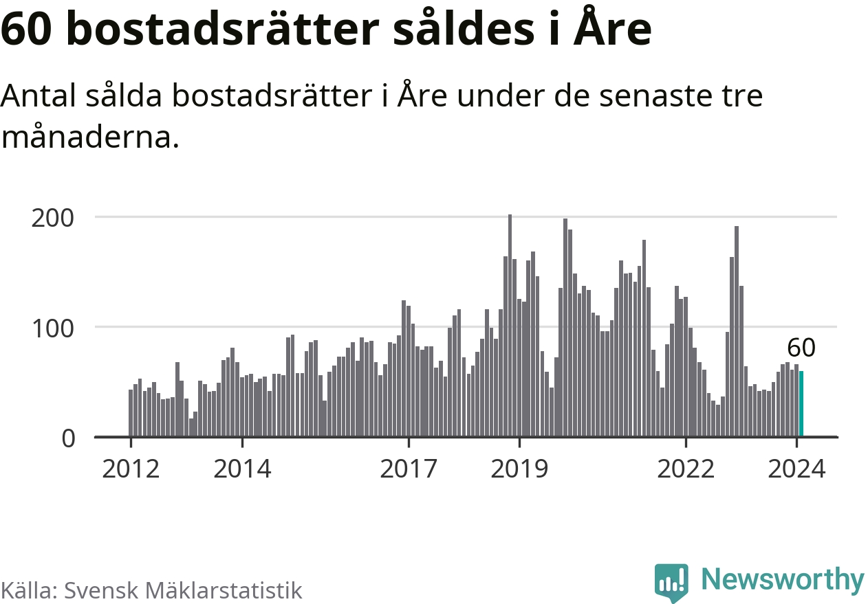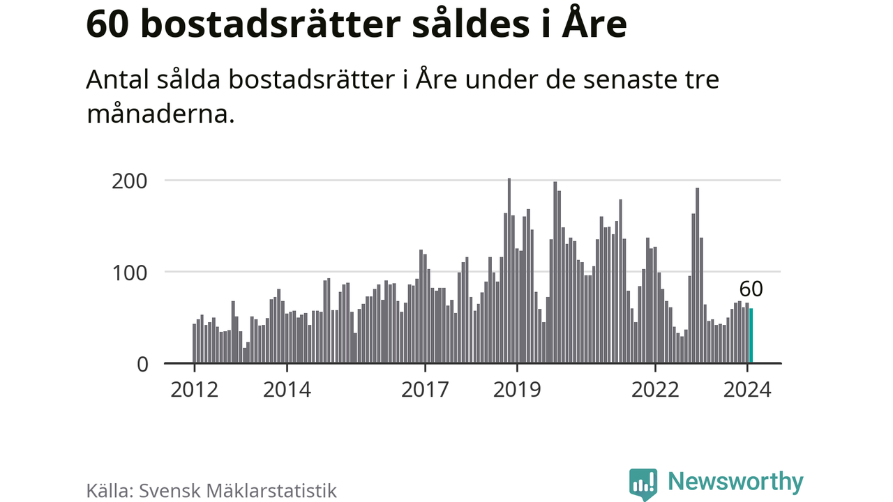 Sammanlagt såldes 60 bostadsrätter i Åre kommun mellan december och februari till ett genomsnittligt pris på 3,8 miljoner kronor. I fjol gjordes 64 affärer vid den här tiden på året.